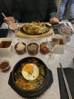 Le Bibimbap est une tuerie ! Cuisiné dans le traditionnel Dolsot (comme expliqué !), cela donne au riz un croustillant à tomber par terre. Avec des gyozas et un pajeon au kimchi en entrée + la soupe et les accompagnements, nous sommes sorties merveilleusement bien rassasiés. Félicitations et merci pour cette expérience !