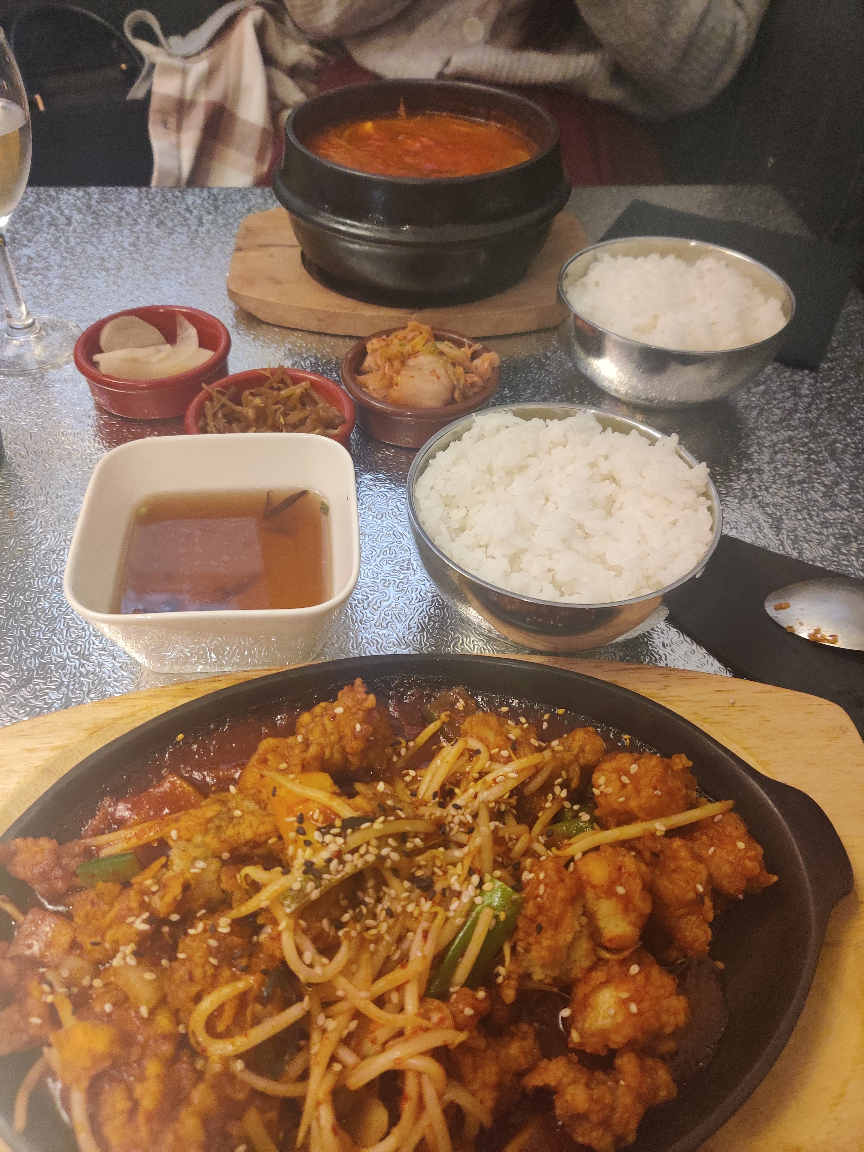 La nourriture n'était pas mauvaise dans l'ensemble. Le plat d'accompagnement n'était même pas de la nourriture pour chien, c'était juste choquant de voir 3 choses servies dans une assiette. Le Kkanpunggi est un 4 morceaux de poulet... Mais la soupe pure buchjigae et gâteau de riz n'était pas mauvaise... Il ne faut surtout pas y aller en pensant à la Corée.
