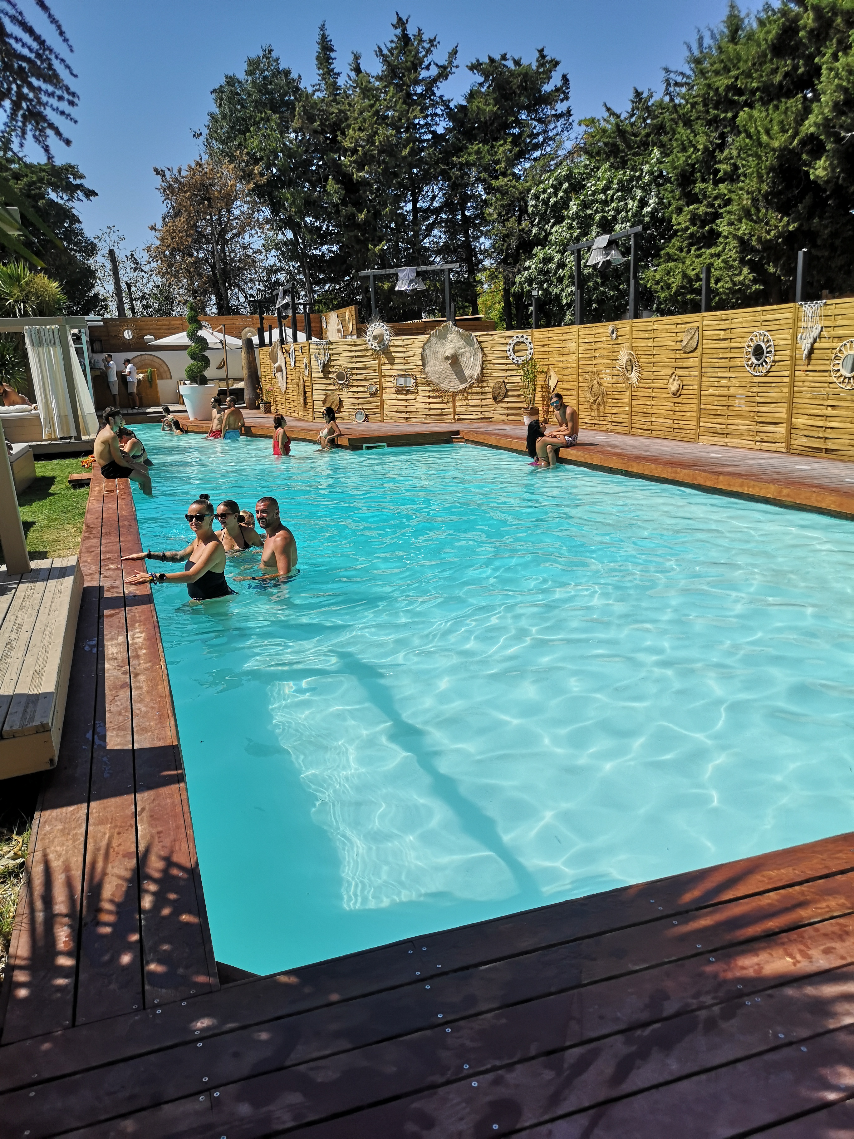 Lieu décoré avec goût,le thon cuit à la flamme délicieux, le voiturier est extrêmement sympathique, il nous a gardé notre place à l'ombre car à peine arrivée, nous avons du repartir chercher de l'argent liquide pour payer les matelas, personne ne nous avait averti lors de la réservation !!! La clientèle Marseillaise n'est pas à la hauteur du lieu, la piscine très sale dés notre arrivée à 11h,avec des bouchons de champagne, des cheveux, des insectes... Aucune échelle pour rentrée et sortir de la piscine !! Très déçu, 1ere et dernière expérience.