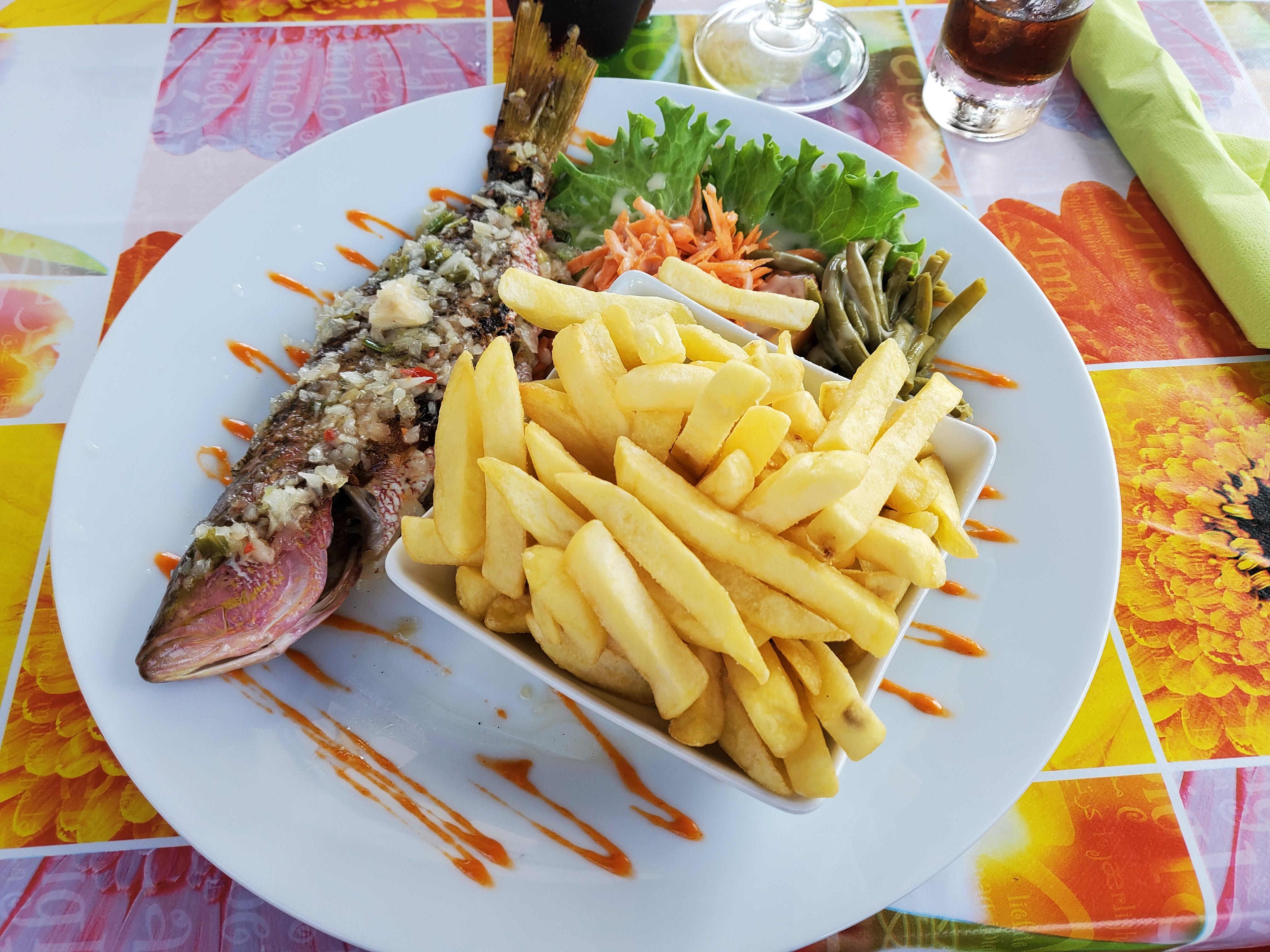 Excellent langouste, poulet, riz et frite vraiment parfait. Prix vraiment abordable, et l'accueil au top souriant très gentil vous pouvez y mangé les yeux fermer !