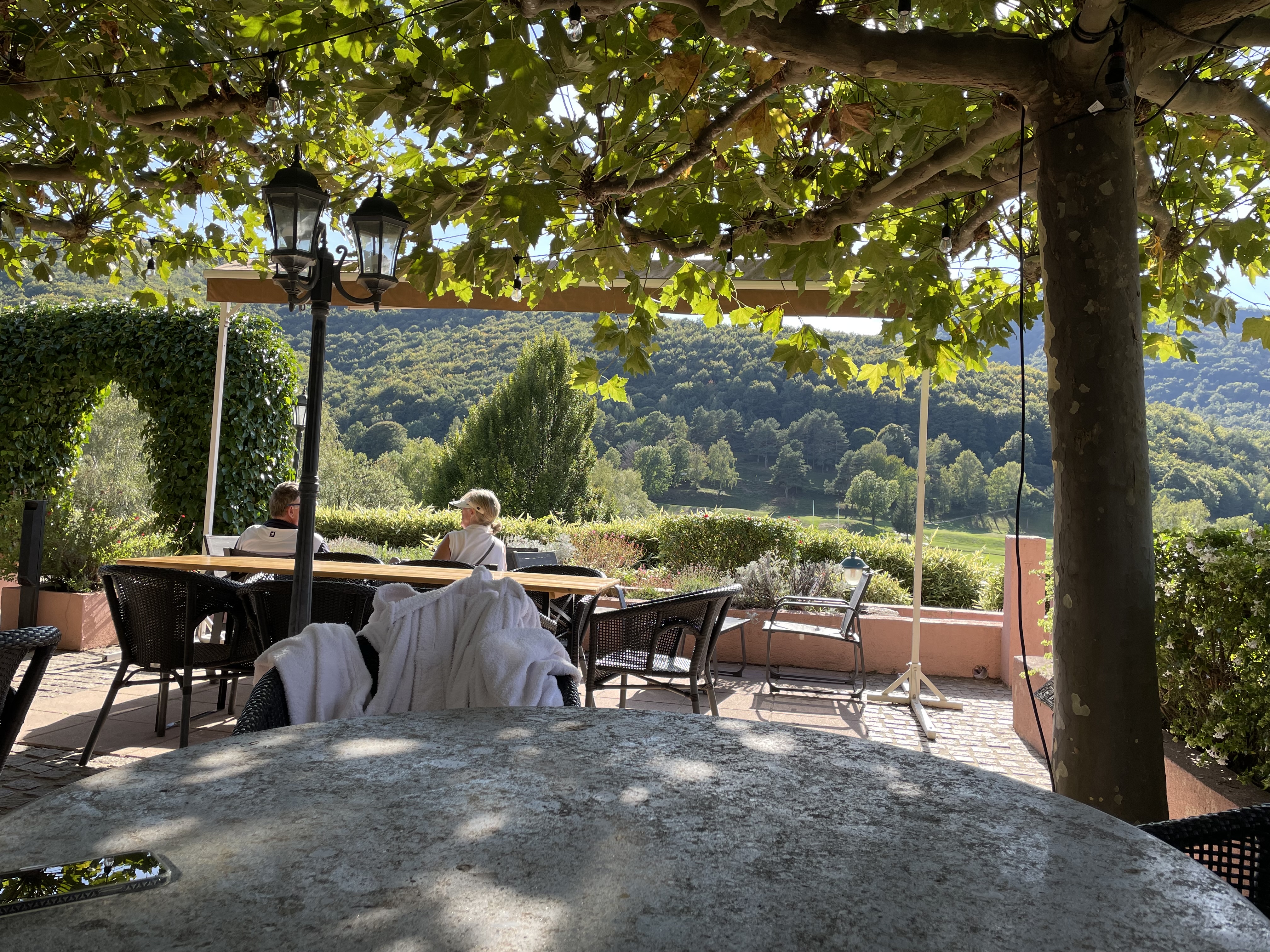 Le domaine est entoure d'un golf il y a un spa avec piscine et une terrasse avec une vue magnifique. Le restaurant est joli avec une belle terrasse ombragée .le repaas est correct sans plus le personnel sympa et poli le service rapide