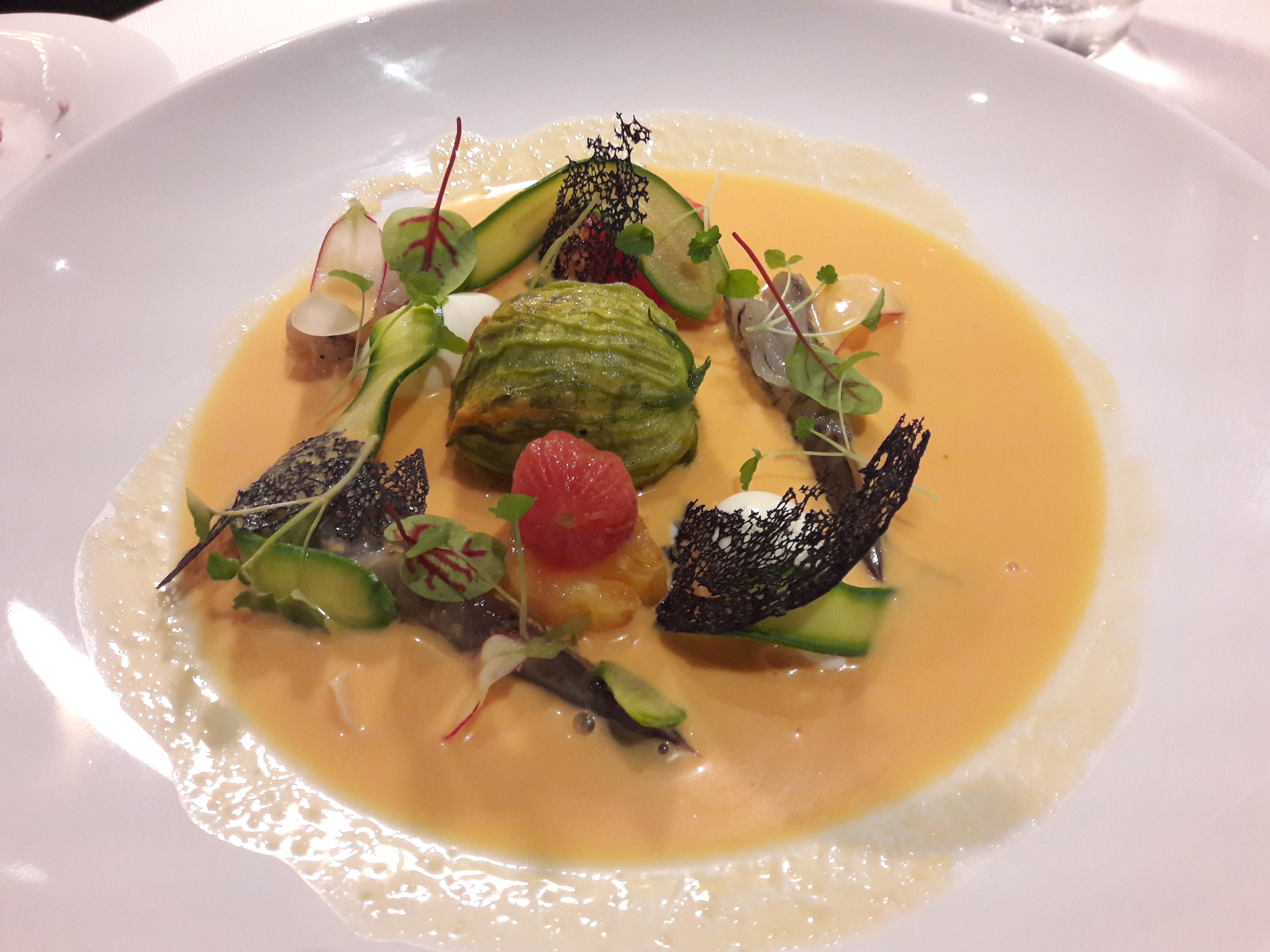 Retour de Pen Bé, les cantines habituelles sont prises d'assaut par les touristes: l'affaire va se terminer au Mc Do (Beurk !) quand me vient l'idée d'appeler la Bretesche au cas où... Restaurant gastronomique complet, seule la Brasserie dispose encore de places. Heureuse découverte, ambiance pro sans être trop guindée. Courgette aux coquillages à tomber par terre. Excitation des papilles gustatives au maximum, mélange de saveurs légèrement sucrées, et à dominante salées, sauce en parcimonie légèrement épicée au piment, dont seul le chef a le secret, courgette craquante à souhait. Dos de merlu accompagné de son champignon mi cuit: le Chef laisse place à l'aliment... La barre est haute et nous ne sommes qu'à la Brasserie. A consommer sans modération ! Merci pour ces belles et bonnes choses.