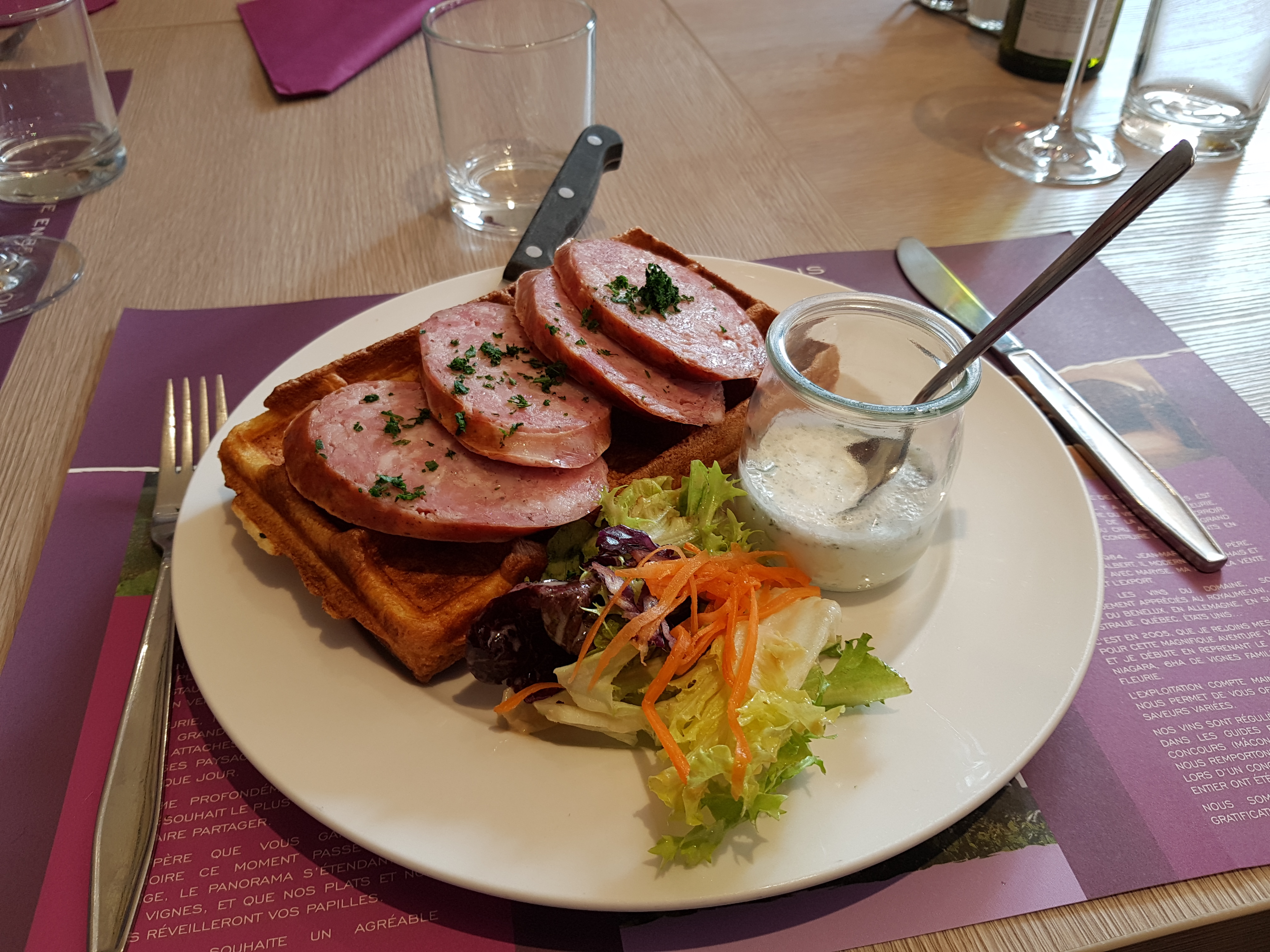 Vue magnifique…et c’est tout… Mais cuisson des viande pas respectée, même pâte à gaufre pour les gaufres salées et sucrées, donc fade en version sucrée et gaufre pas assez cuite donc pâteuse à l’intérieur. Andouillette préparée peut être selon une recette de la région mais cela fait un peu bouillie et non grillée ou croustillante du coup, texture assez décevante. Personnes gentilles et accueillantes mais très professionnelles.