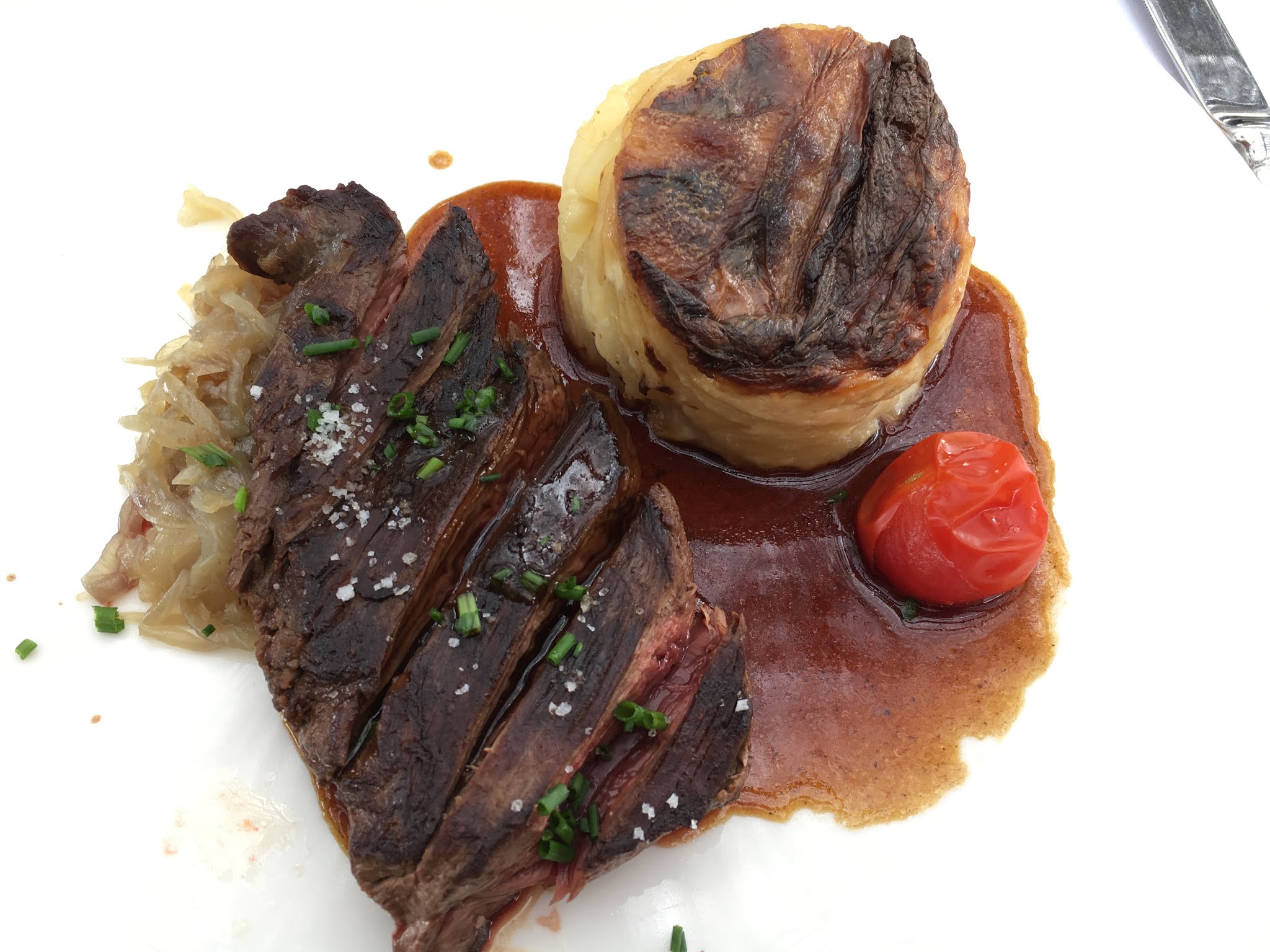Nous avons commandé ma compagne et moi la pièce de boeuf premium rassi sur l os avec sa sauce béarnaise et sa garniture au choix selon la carte. Nous avons choisi les frites maison ( vraie frite maison). Les assiettes sont arrivées avec le boeuf, une purée de pommes de terre et des haricots séchés, sans béarnaise. Après demande de notre part la béarnaise arrive en fin de repas. Déçus d avoir dégusté cette viande savoureuse avec deux accompagnements incompatibles. Quel dommage... En compensation une coupe de champagne sur une création glacée décevante.