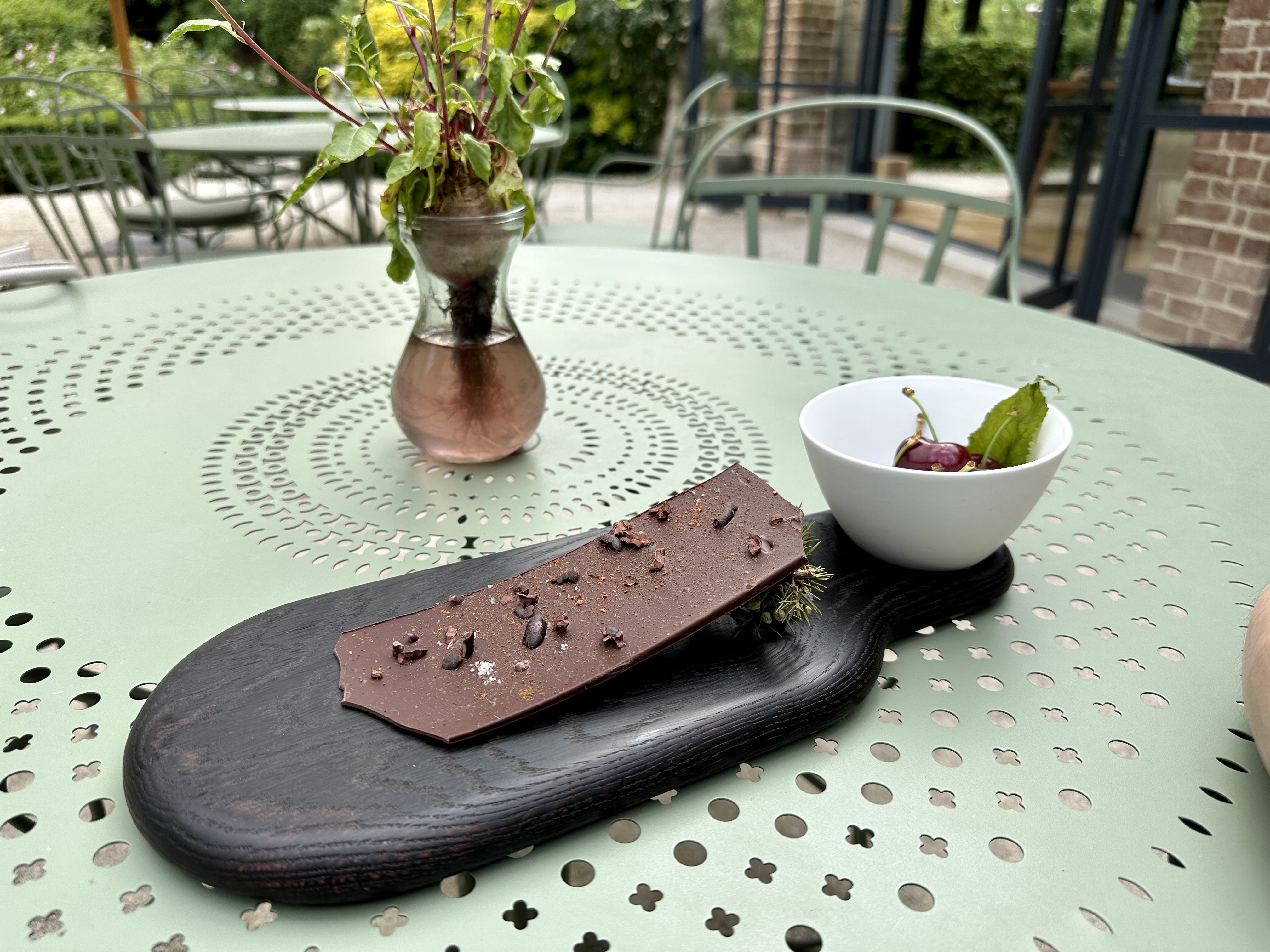 Cadre verdoyant et apaisant, dont le maître mot est NATURE. Le restaurant est très intimiste avec moins de 20 couverts, situé dans une salle baignée de lumière ouverte sur le parc et la terrasse bordée d’une roseraie🌹. L’accueil y est chaleureux et détendu. Le personnel de salle est attentif et au service total des convives. Les échanges y sont constructifs. Bravo à eux! Le menu, que vous trouverez en photo, est centré sur la nature et change presque à chaque service : légumes du potager du domaine, poisson et fruits. Vous n’y trouverez pas de viande. Le menu suggèré par le chef Romain Meder est unique, le choix n’est que sur le nombre de service souhaité. Donc pas de carte ici. Côté gustatif, l’ensemble est léger, ni trop gras ni trop sucré. On découvre des nouvelles associations de saveurs végétales tels que chocolat/café/lentilles, fraise/sapin/pélargonium, des ketchups de poivrons 🫑,de fraises 🍓 … Les petites quantités servies permettent d’opter pour le plus grand nombre de services sans n’en plus pouvoir. Les tarifs sont élevés €€€€€, à hauteur de restaurant étoilé: 200€ par personne pour le plus gros menu avec cocktail. Pour résumer, une échappée naturelle à tester mais « Je ne vous en dirais pas plus » (l’intéressé se reconnaîtra 😋!)