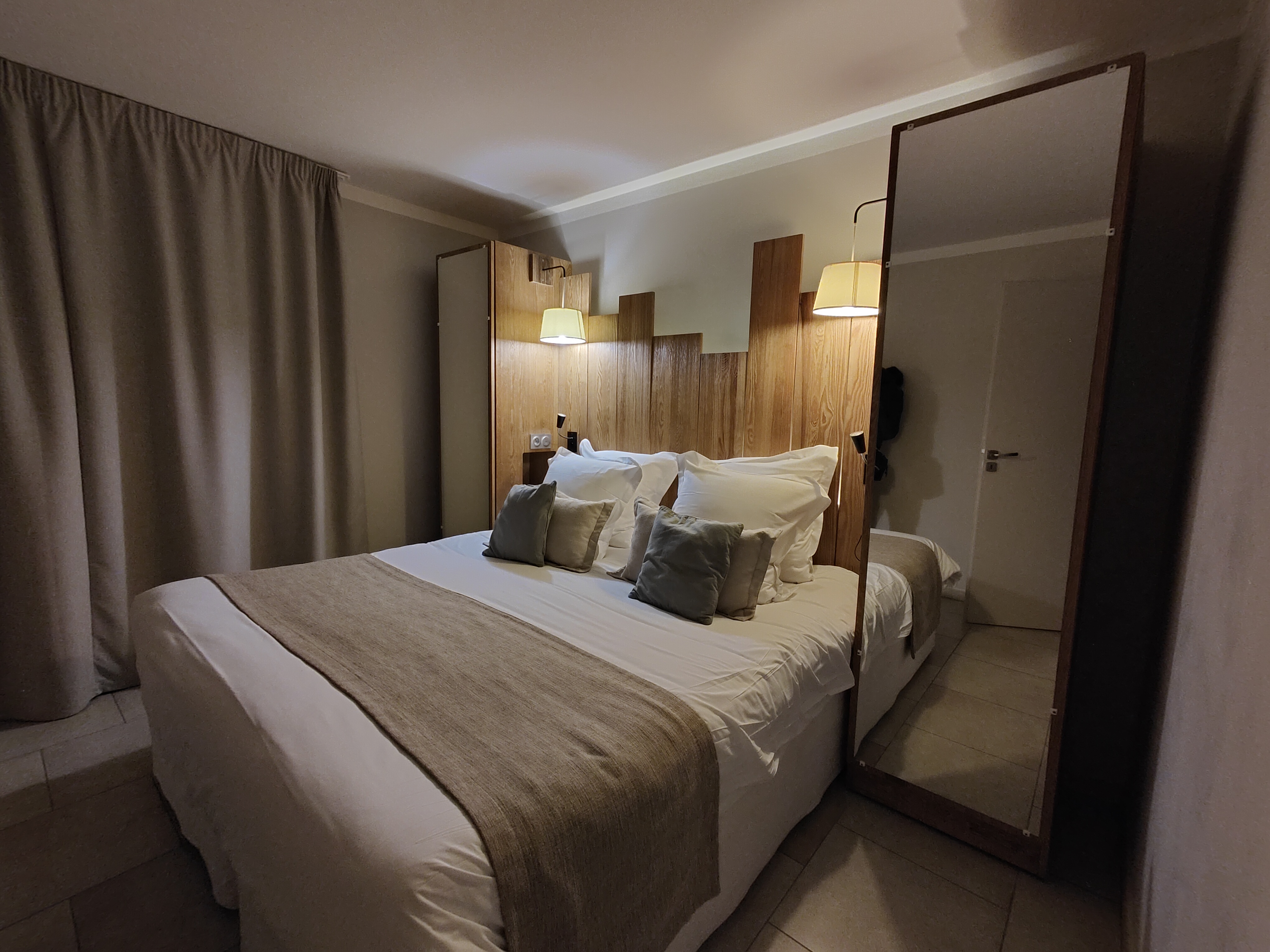Trop mauvais rapport qualité/prix, sur côté! L’hygiène est plus que moyenne (moisissure plafond, objets suspects entre meuble et paroi de douche, araignée et ses toiles, joins de la douche pourris), les serviettes de toilettes sont rêches et ne sentent pas bons. La literie est similaire à une planche de bois, par contre lit très grand. Vous croisez du personnel dans le domaine, ils ne vous disent même pas bonjour. Ceux de l’accueil rien à dire, gentils et agréables!! La réservation d’un soin ou spa relève du parcours du combattant, il m’a fallu 6j pour arriver à avoir une personne au téléphone qui m’indique que tout est complet … A ÉVITER !!
