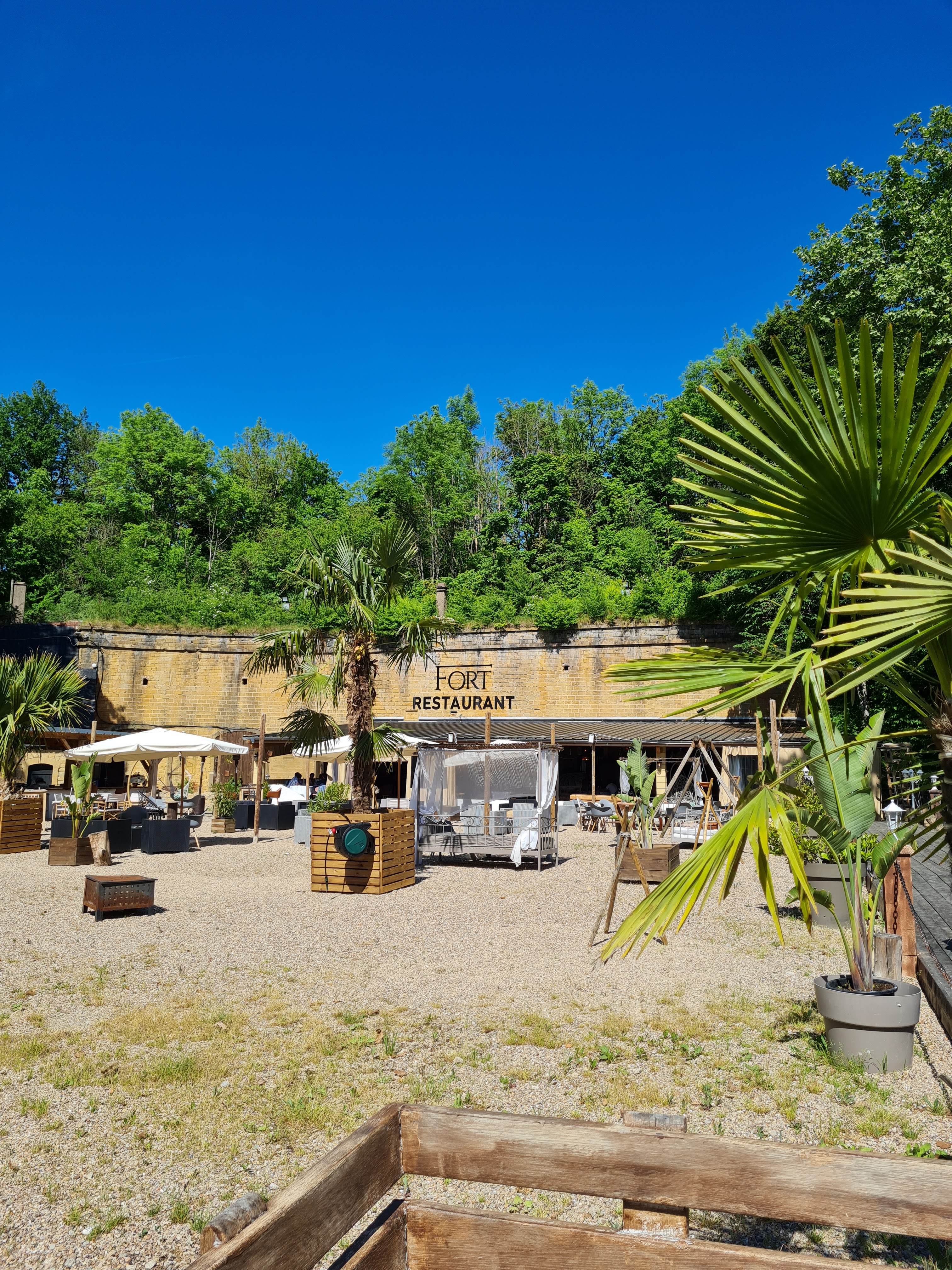 Restaurant qui se mérite, au cœur d'un ancien fort, en plein travaux de paysage. Restaurant au design et ambiance sympa, toilettes propre. Serveur super. Flam à partager, salade copieuse, un peu moins le plat.