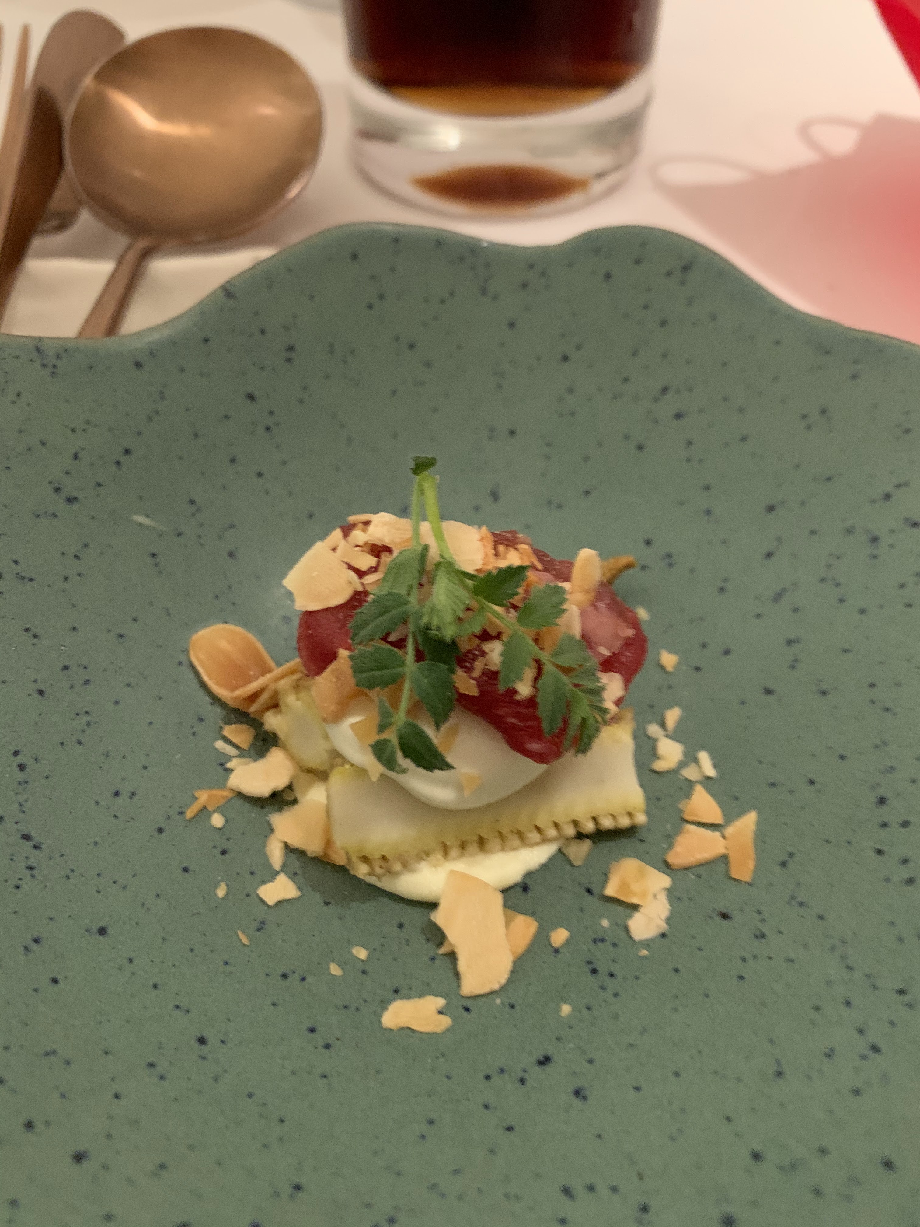 Quelle déception, nous avions un menu unique à 7 soit disant plats, il faut savoir que le pain et du beurre ça fait un plat !!!!!! Une chips de lentilles ou je ne sais quoi aussi ! Et quelle horreur en dessert des cookies de boudin noir sérieux !!!! Nous nous demandions pourquoi les autres tables laissaient les cookies on a vite compris pourquoi ! Il y avait une sorte de mousse de foi gras tellement dure qu il fallait trancher sec pour la couper, Très cher pour ce que C est, une bonne note au service C est au moins ça, nous ne reviendrons pas