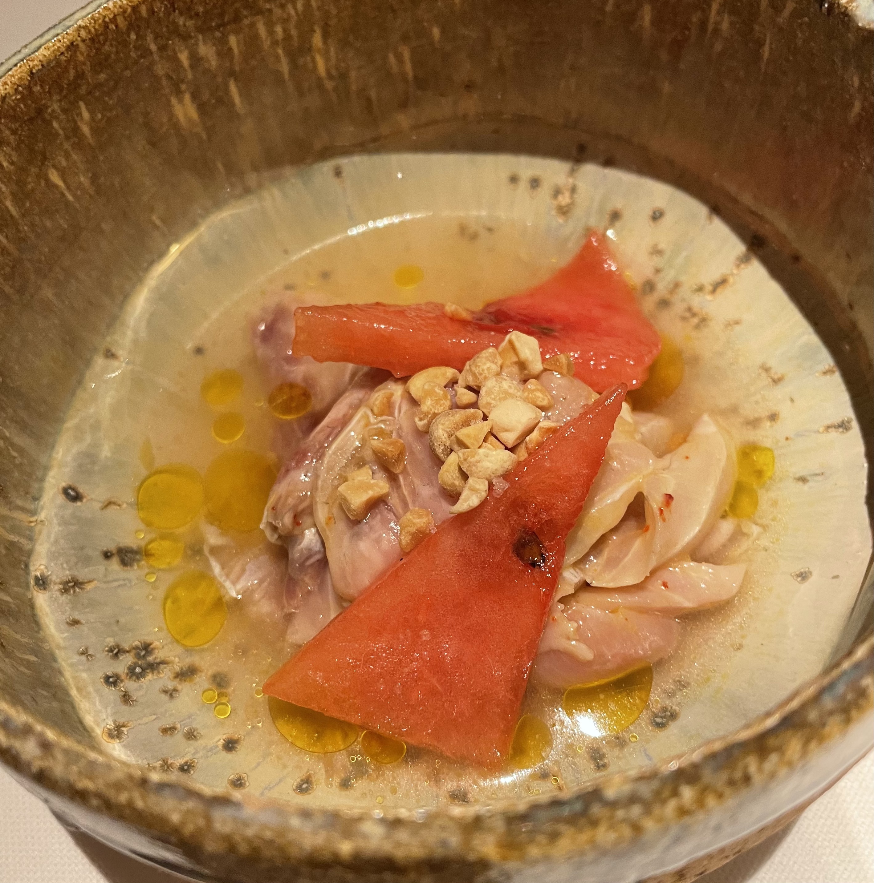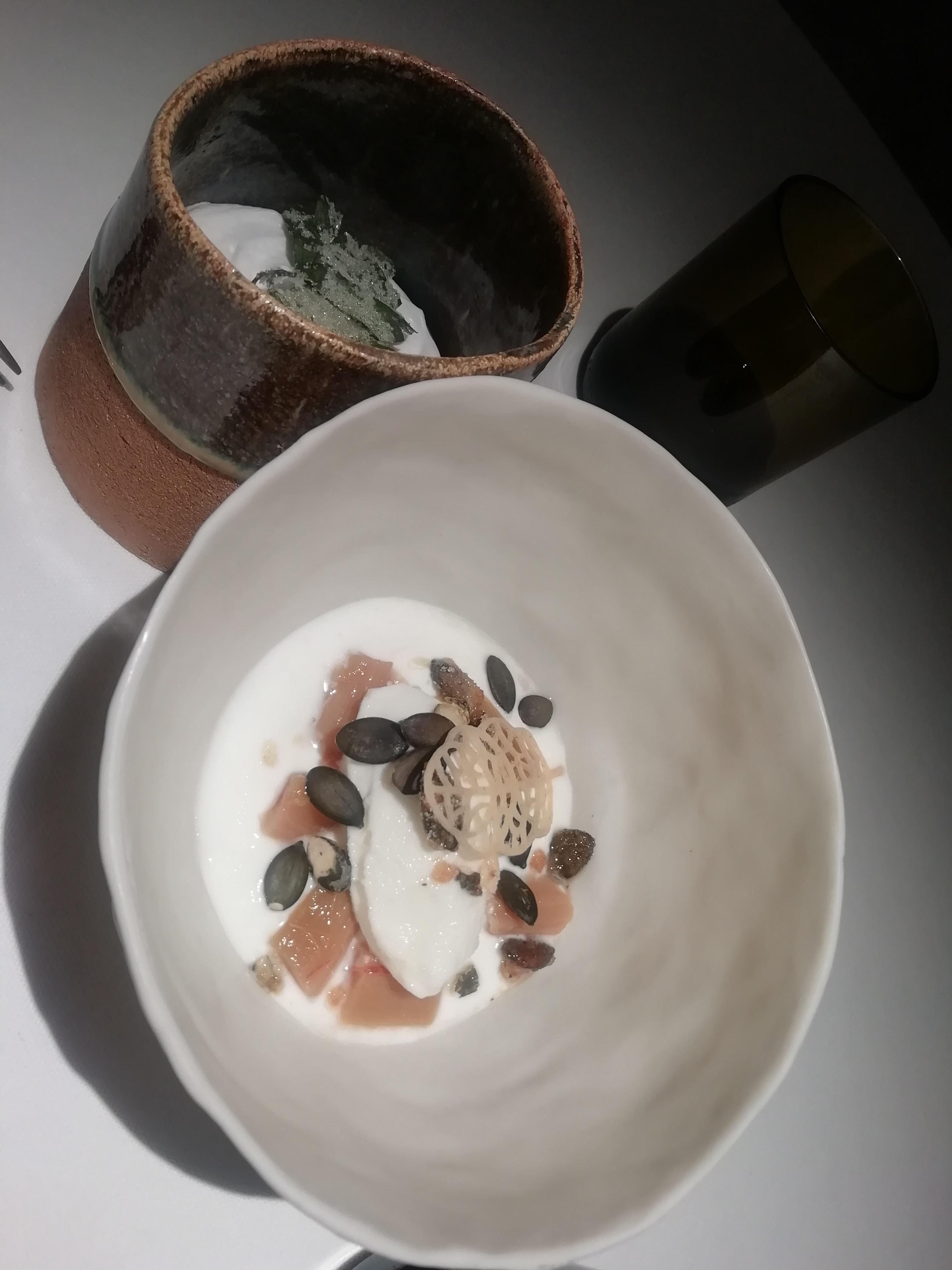 Nous avons passé une excellente soirée, la salle est spacieuse, les tables éloignées les unes des autres, l'éclairage intimiste et la service impeccable. Nous nous sommes régalés tous plats confondus et n'en avons pas laissé une miette. C'était si bon que j'en ai oublié de prendre des photos après l'entrée. Très bon point : chacun peut prendre le menu qui lui plaît, toute la table n'est pas obligée de choisir un même menu !
