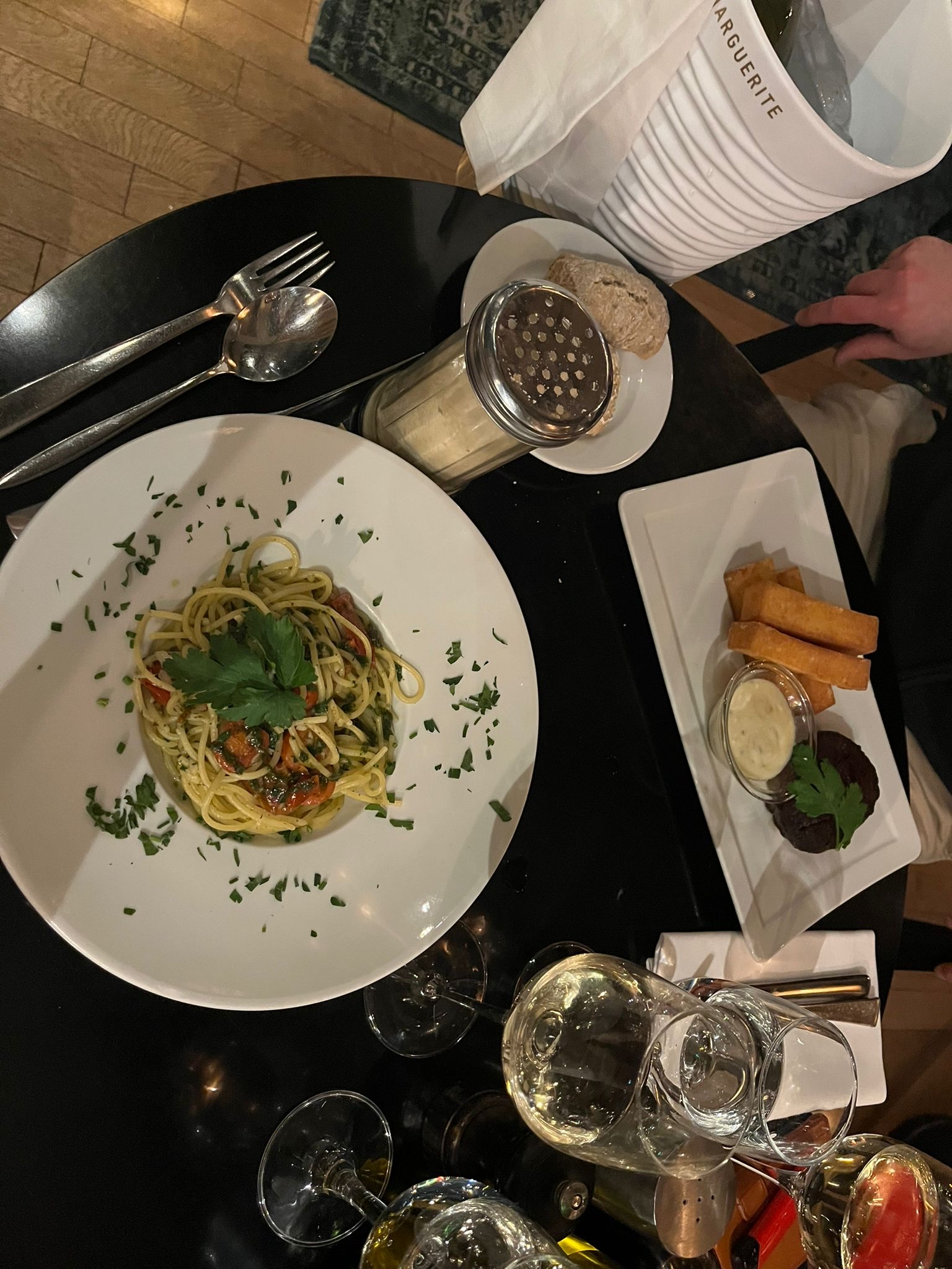 Lasagne très bonne très goûteuse, spaghetti bolognaise bonne mais manque un peu de goût. Dommage pour la quantité il y a vraiment peu dans l’assiette, il ne faut pas avoir très faim pour des prix qui sont bien élevés. ( 30€ les pâtes bolo et 35€ la lasagne, désert 19€) Moelleux au chocolat bon. Serveuse gentille.