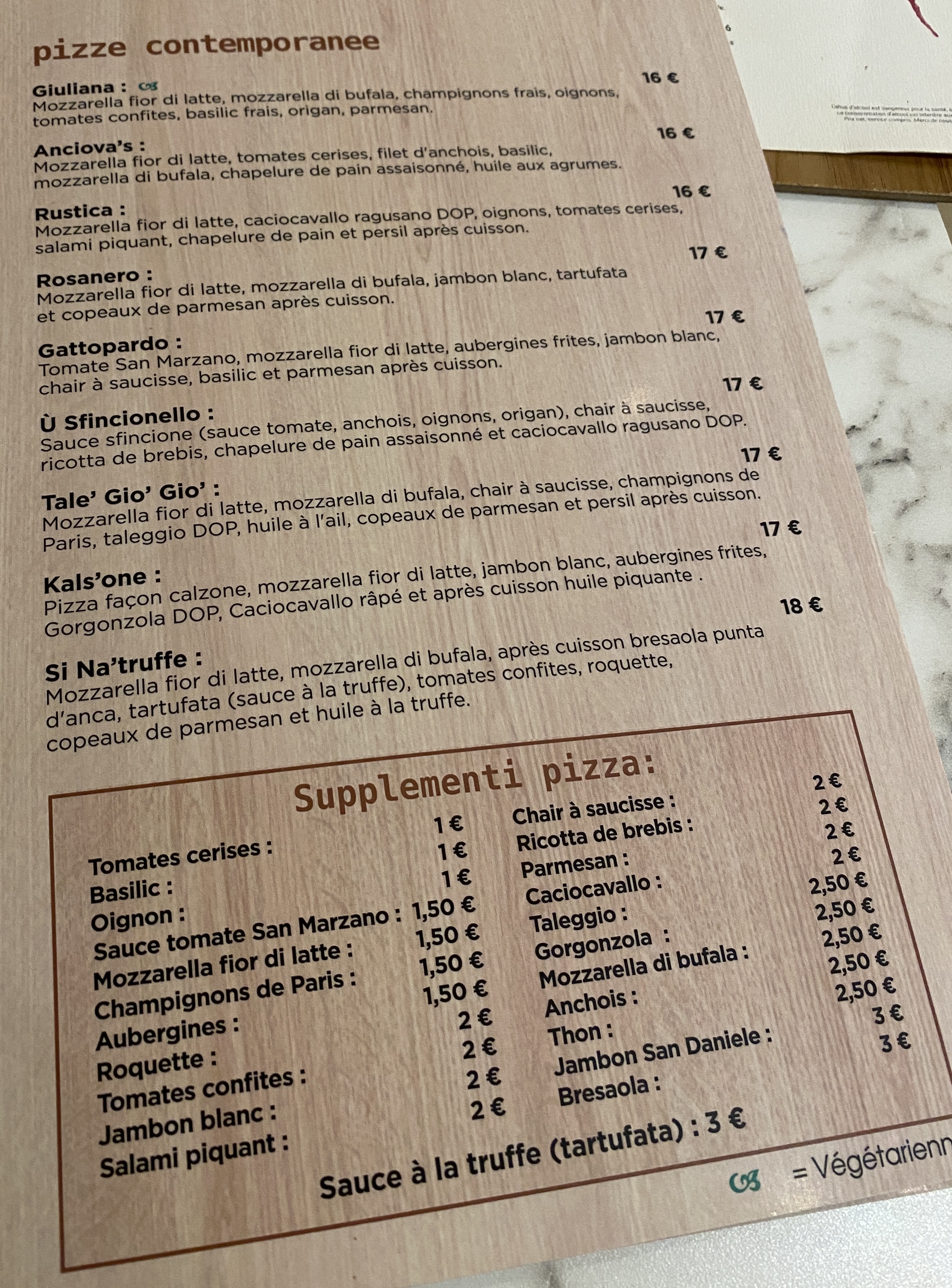 Absolument incroyable ! Pizzas, pasta, turamisu etc.... Je n ai pas encore testé toute la carte mais compte bien le faire ! Cuisine excellente un vrai régal, c est bon, c est beau, c est frais ! Et l accueil et le service sont chaleureux et efficaces, bref un 10 sur 10
