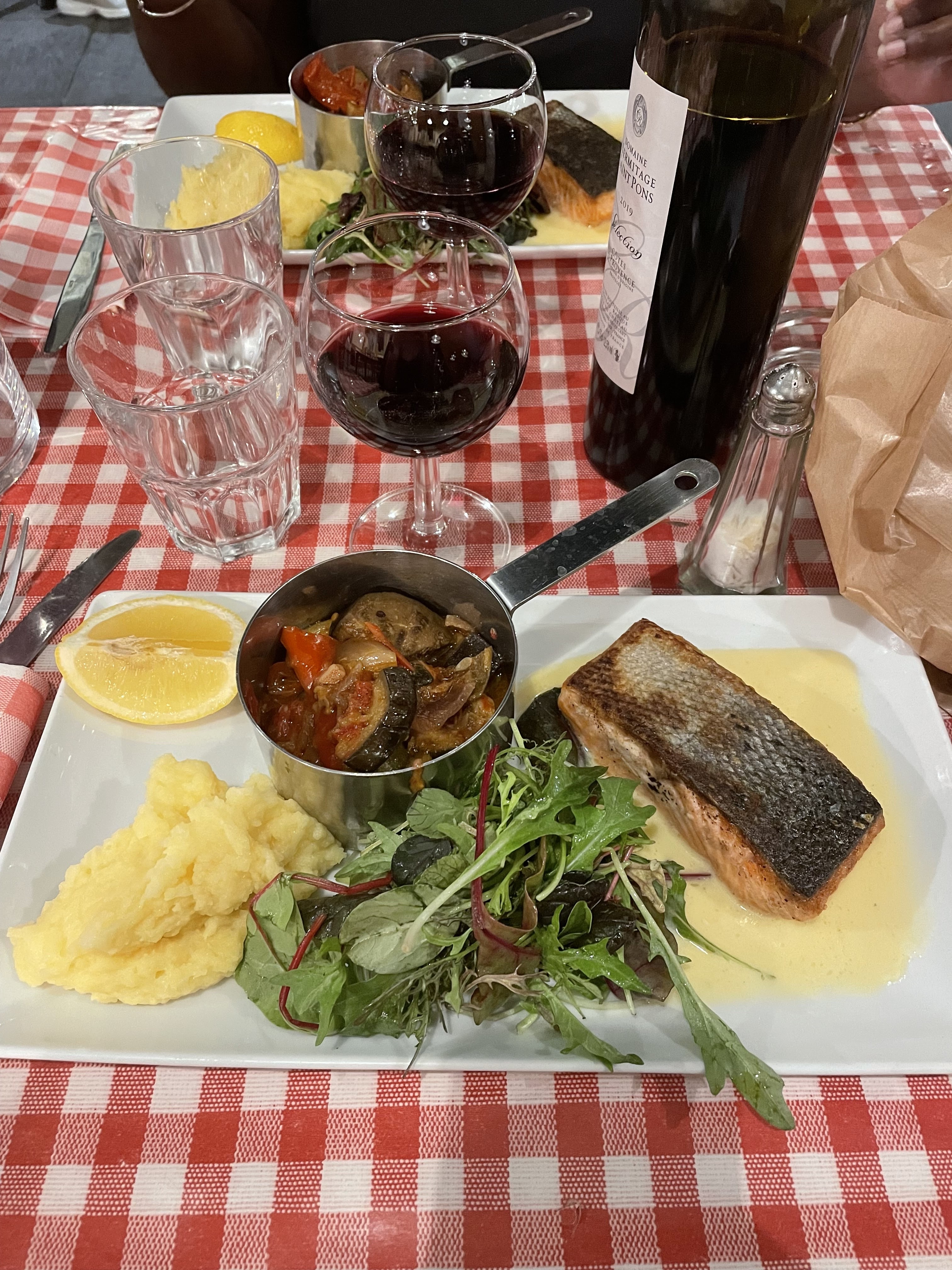 Nous avons eu la morue avec de l'aoli, elle était parfaitement cuite et. Ale avec légumes et pots, le meilleur aoli !! Et la Salade Nidcoise était magnifique ! Belle table extérieure pour s'imprégner de l'atmosphère et du vin rosé pour couronner le tout. Parfait. Service un peu lent, mais peu importe quand il y a tant de monde qui regarde et quand votre nourriture arrive et qu'elle est délicieuse, vous l'oubliez totalement et le dessert était tellement crémeux. Recommande fortement.