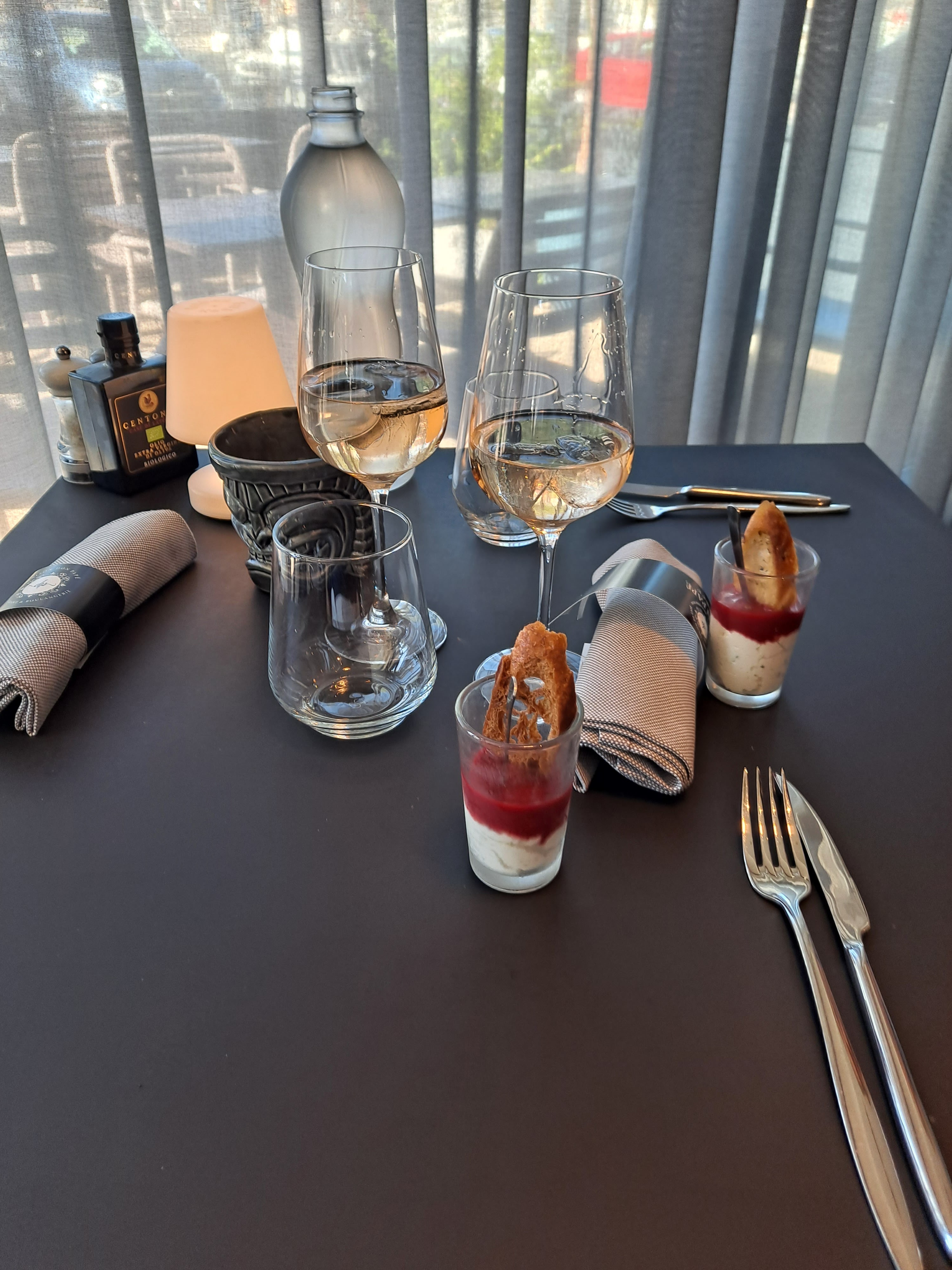 Apéritif offert si on est client de l'hôtel, petit amuse bouche, très bons vins et on y mange bien. Le service est fait avec le sourire et très efficace. Oui c'est un poil cher mais les produits sont de qualité.