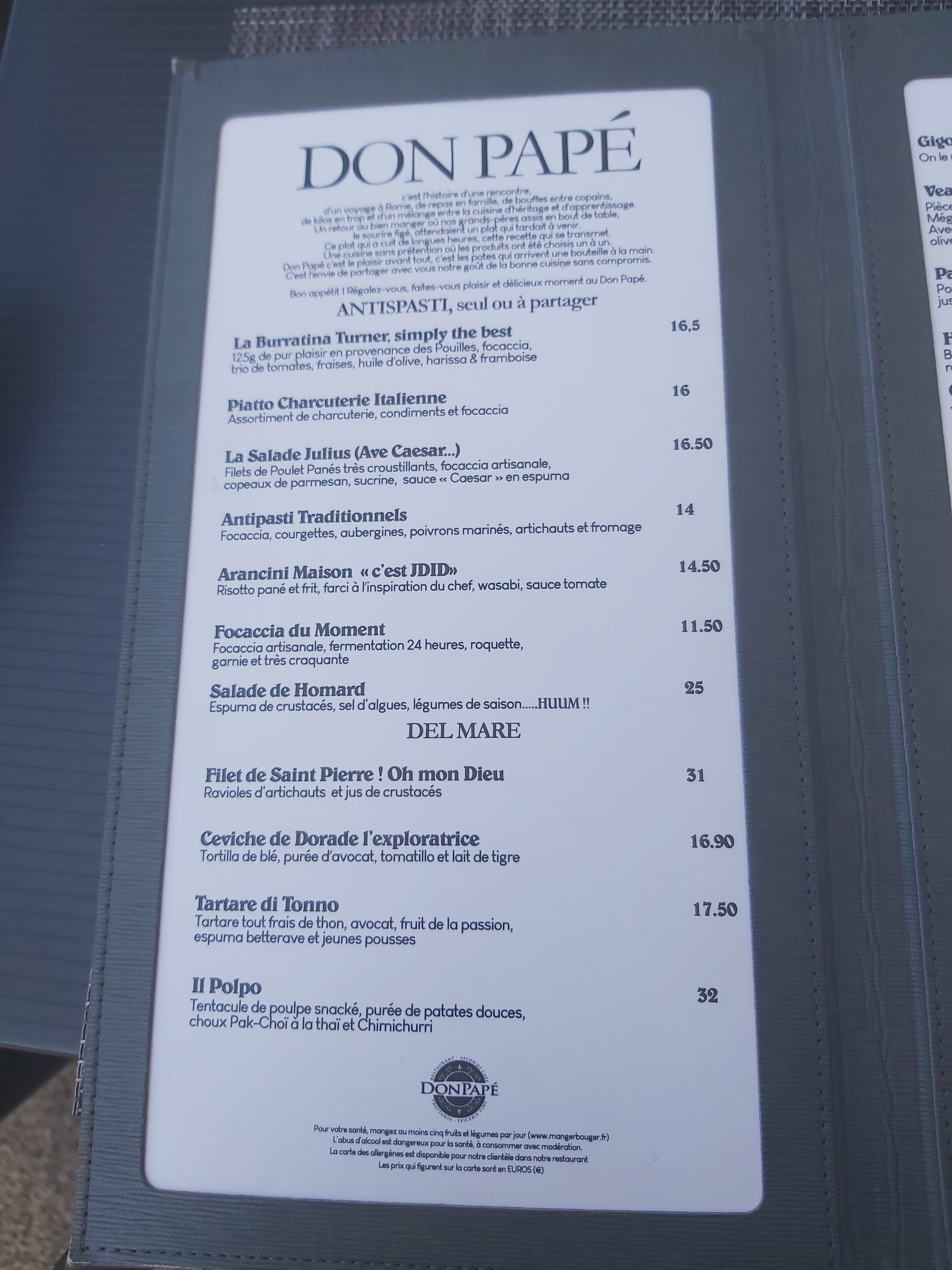 Don Papé est un restaurant sur le thème de l'Italie mais pas que, il propose évidemment des mets italiens mais pas que, il y a des coquilles Saint Jacques, du magret, de l'agneau... Tout le monde y trouvera son compte. Ce restaurant a le gros avantage d'être un des seuls ouvert le lundi. Les coquilles saint Jacques étaient très bonne mais le plat un peu chiche en accompagnement. Le mousse d'avocat en dessert est originale et bonne. C'est une belle découverte mais les tarifs sont un peu élevés, comme le spritz à 12 euros. Pensez à réserver. Restaurant à côté du mercure mais indépendant.