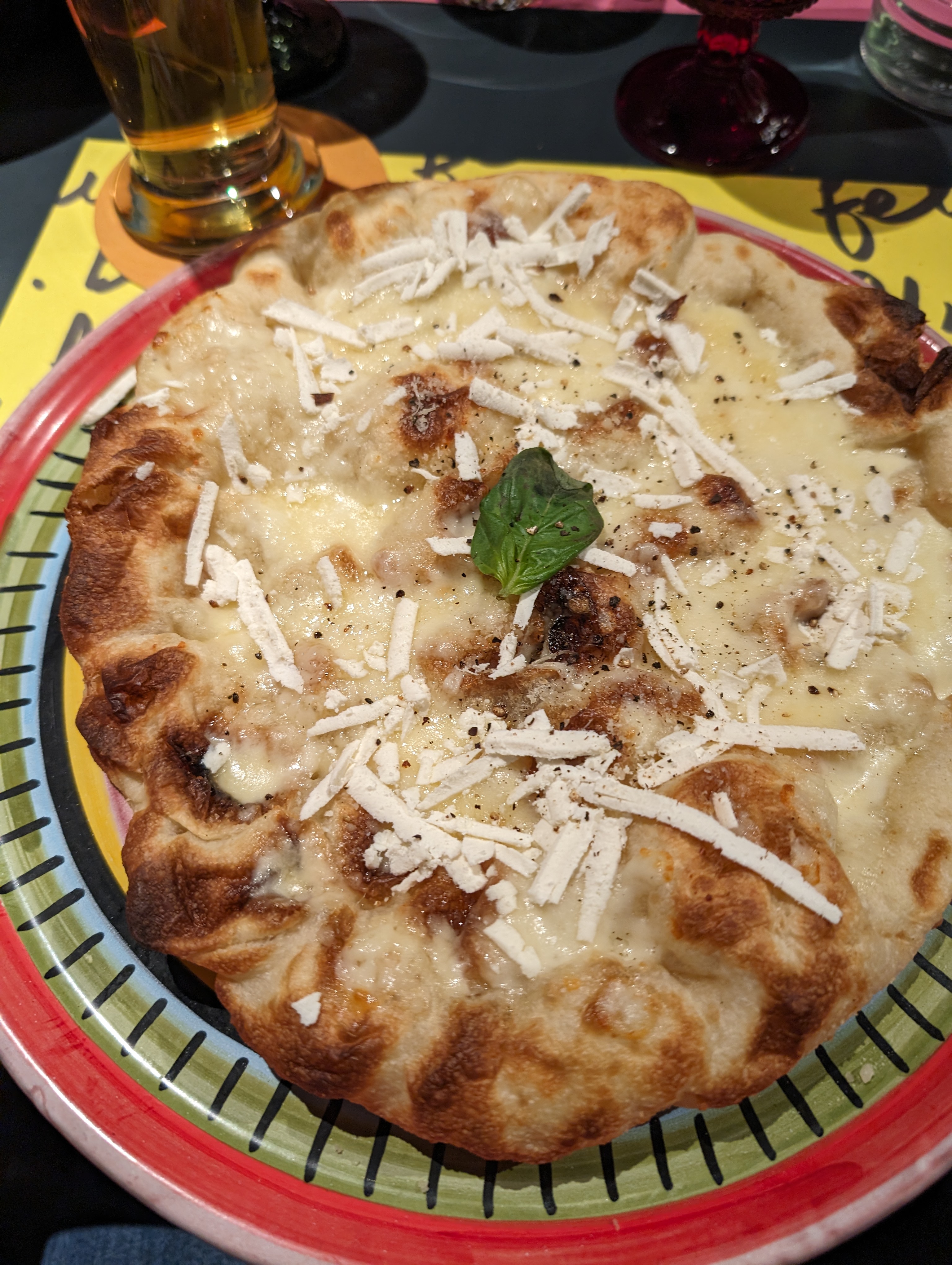 Super découverte ! Nous sommes venus diner en grande table avec les collègues, pour fêter le départ de l'un d'entre nous, et c'était une très bonne idée. Le lieu est très joliment décoré, farci de détails et de couleurs, on peut passer un temps certain rien qu'à observer. L'ambiance Brasserie italienne un peu surjouée fonctionne très bien ! Coté accueil, rien à redire, on a vraiment eu la sensation d'être les bienvenus, c'était très agréable. Notre table était juste en face des cuisines ouvertes, qui avaient l'air propres et rangées, ce qui est un premier contact très rassurant. La carte est richement fournie, mais on s'est quasiment tous orientés vers les pizzas, car c'était notre obsession de la soirée. La prise de commande et le service ont été hyper rapides, et on a toustes pris une claque en mangeant. Enorme surprise sur la qualité des ingrédients notamment, on s'attendait à quelque chose de moins soigné et plus axé brasserie de grand service, mais les pâtes étaient d'une qualité surprenantes, quasi feuilletées, craquantes, un parti pris que je n'avais pas encore croisé ailleurs. Dans les grandes lignes, on n'avait ni attentes ni exigences, mais on a pris une petite claque. On a passé une super soirée- pot de départ, et on reviendra avec plaisir :) Gros point supplémentaire pour tous les jeux présents sur place : On peut venir pour une bière de débauche et la soirée peut rapidement dégénérer en tournoi de basket ou Billard jusqu'à relativement tard, la glissade est vite arrivée.