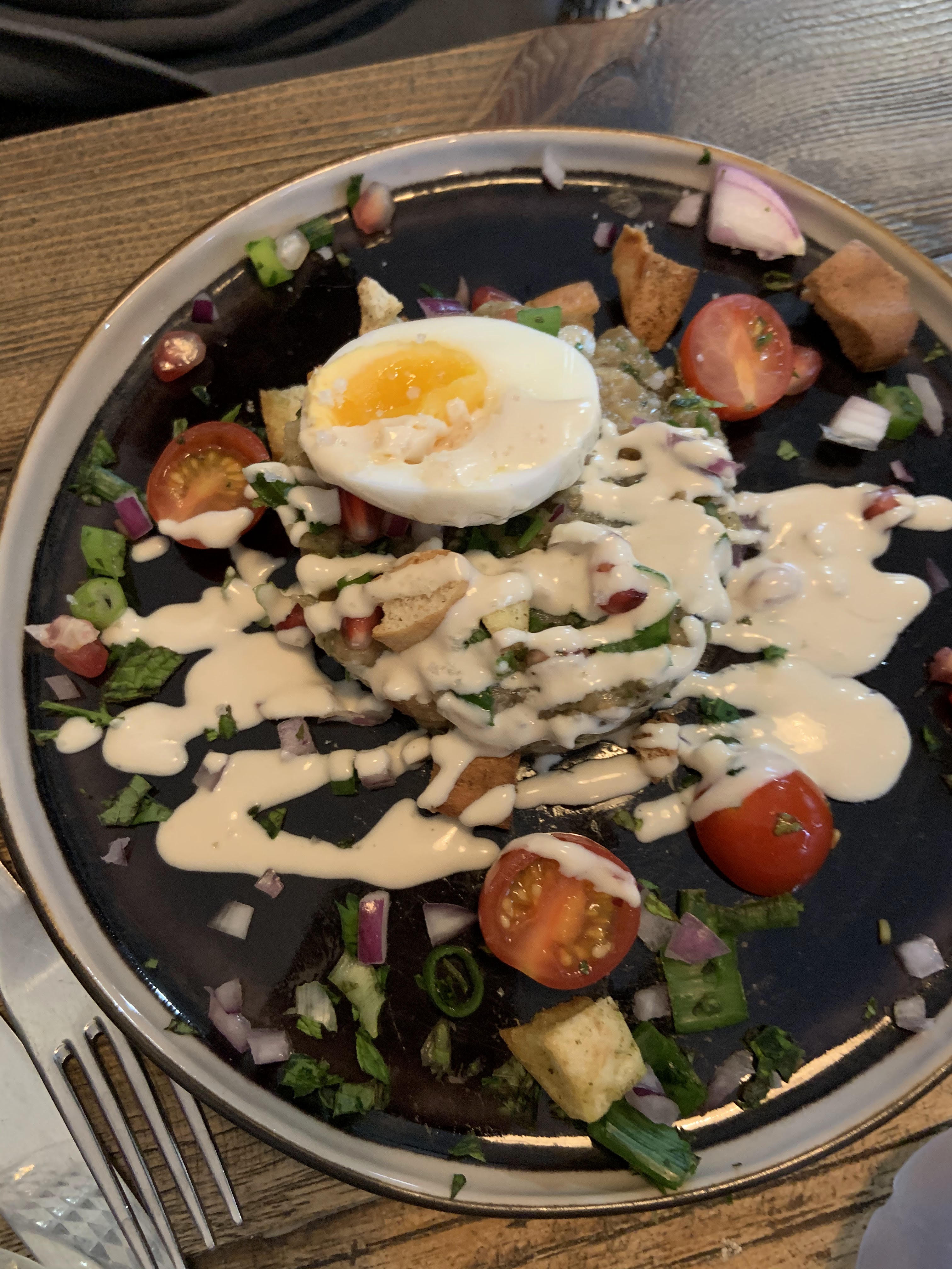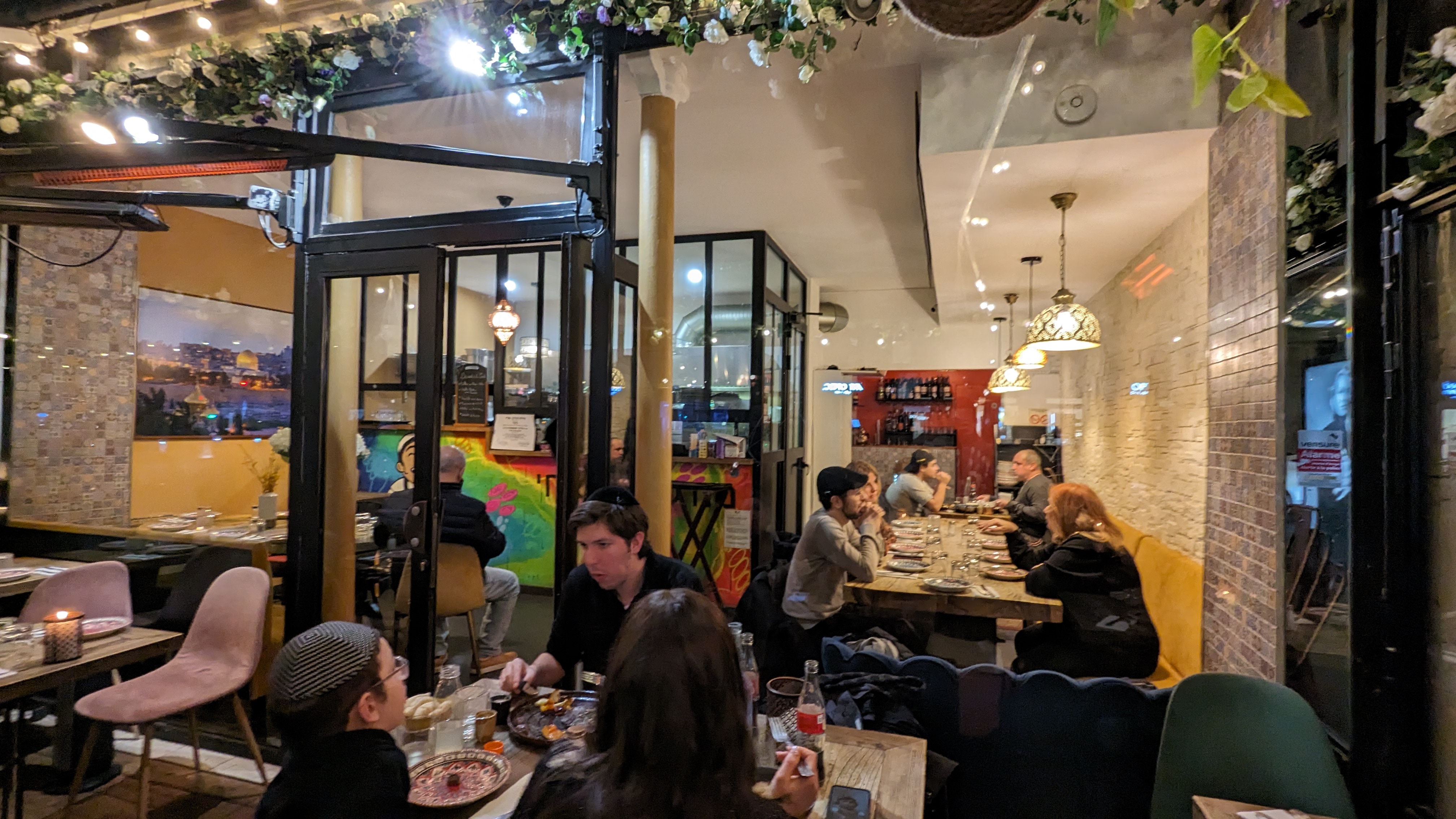 Restaurant de cuisine israélienne . Le cadre est sympa mais dommage car le restaurant est vraiment petit ... Ce qui est dommage c’est que sur des tables de 4 seulement 2 personnes sont assises. Du coup si on arrive à 4 on doit être placé en extérieur ou attendre notre tour alors que plusieurs tables de 2 étaient libres ... Petit bémol : aucun plat adapté aux enfants ... pas de frites ou autres Donc je déconseille d’y aller avec ses enfants Sinon le service est très rapide , les aliments sont frais Les plats bien présentés et goûteux. Le dessert était un brownie que je recommande il était très bon et fondant !