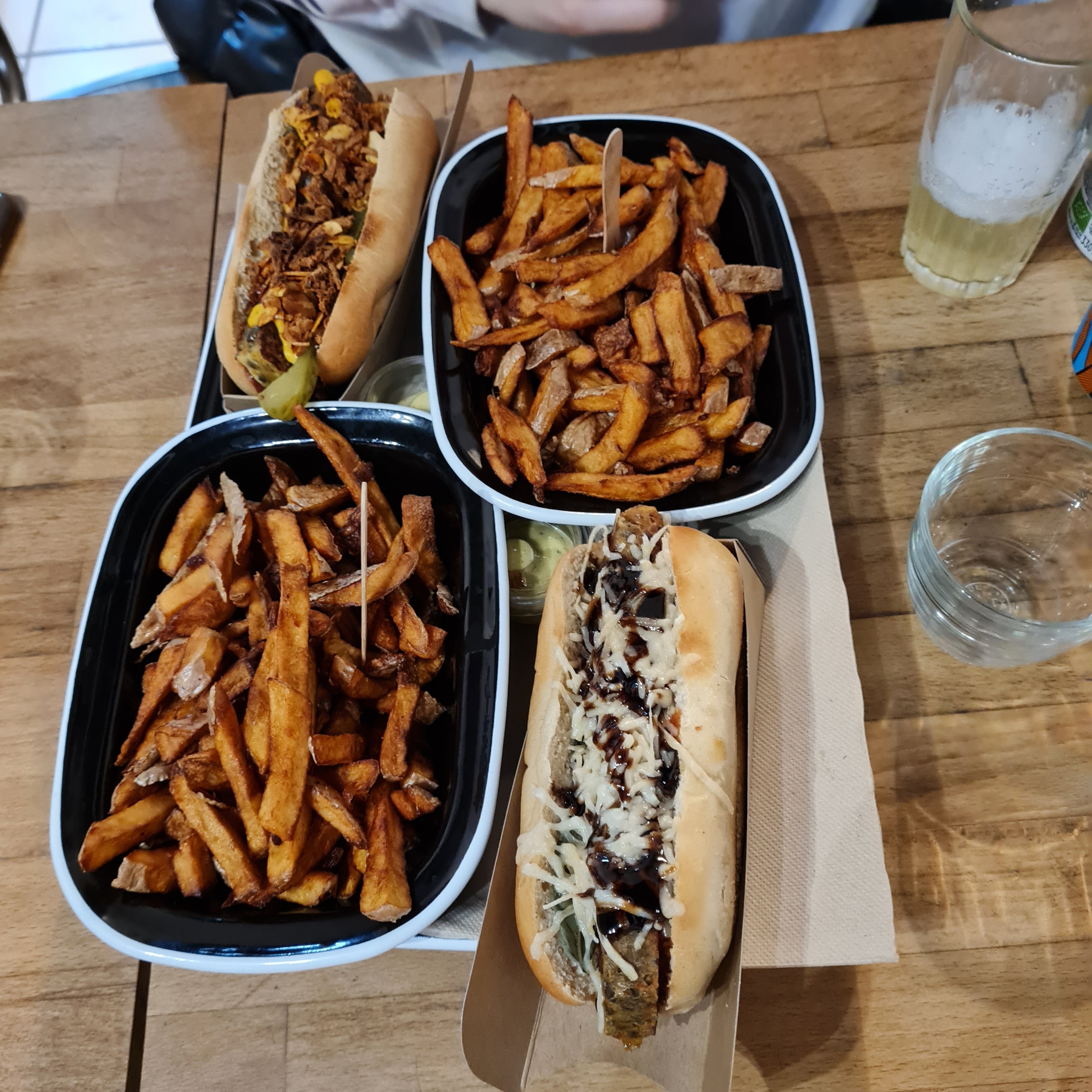 Frites bonnes mais sans plus, portion généreuse cependant. Pour les hot-dog avec saucisse vegan, pensez à vérifier qu'il s'agit bien de votre commande et pas d'une classique. On oubliera peut-être de vous l'indiquer si vous commandez en même temps que quelqu'un. Desserts intéressants mais pas exceptionnels. Service long mais geste commercial pour l'erreur de commande apprécié. Je ne recommande pas plus que ça ce fast-food, un peu cher d'ailleurs.