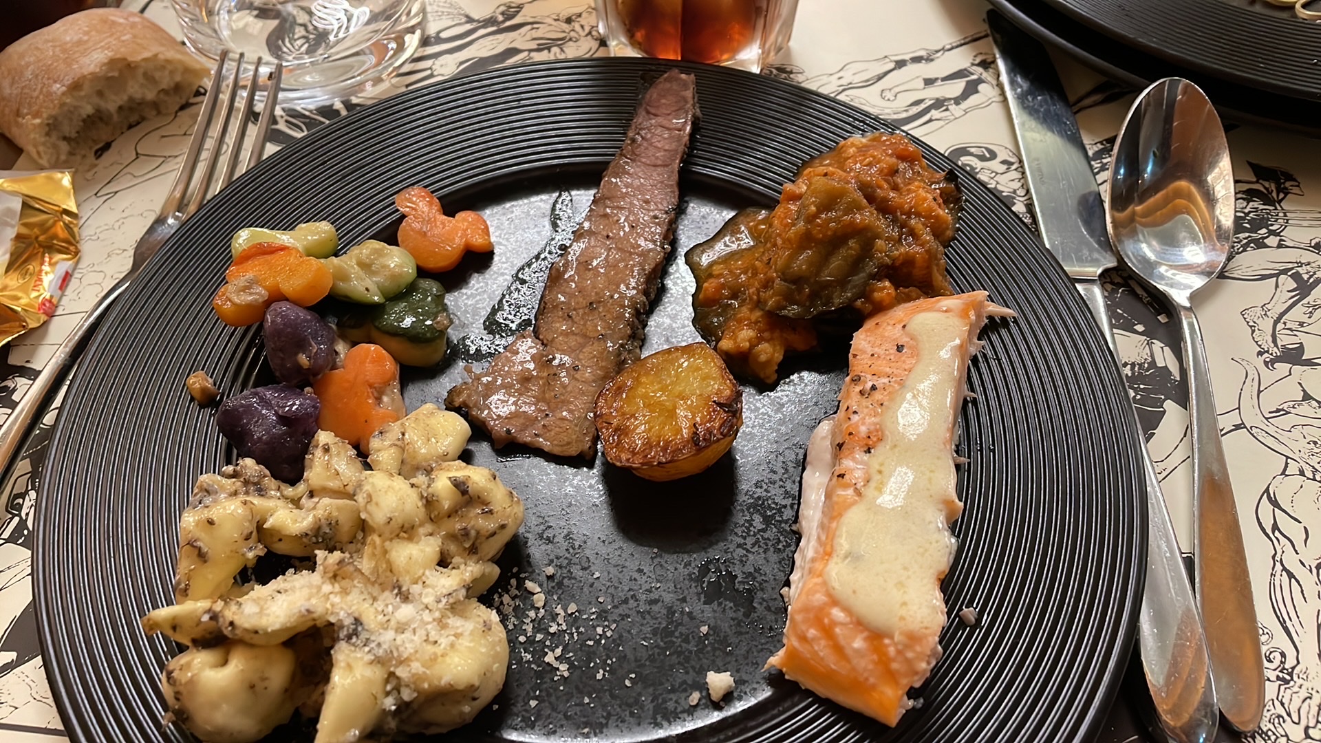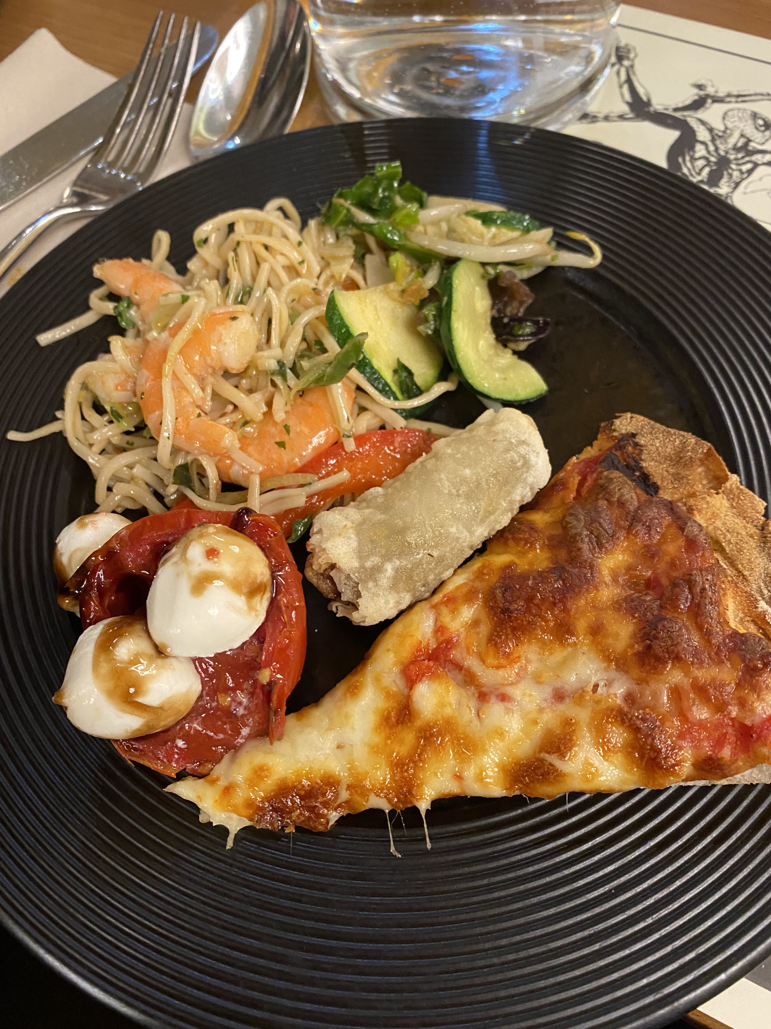 Ici, de bons dîners : il y en a pour tous les goûts, du texmex à la cuisine asiatique en passant par la cuisine italienne : tout est cuisiné et présenté avec soin. Un immense merci à Guido : il a fait de nos dîners un véritable rêve du 14 au 19 août (chambre 8204 Hôtel New York).