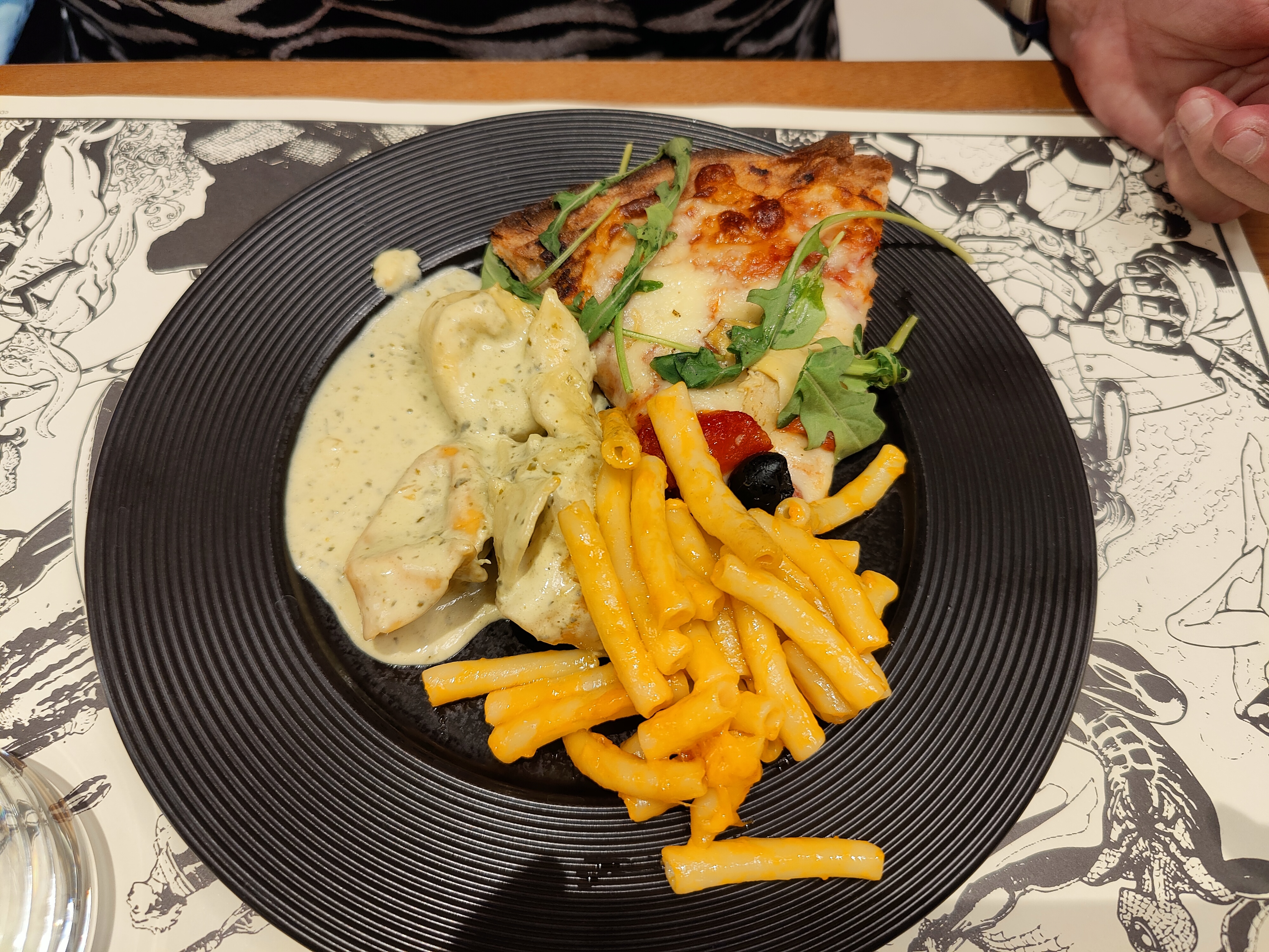 Très bon repas, un restaurant buffet qui se décline sous 3 versions : américaine, italienne et chinoise. Il y en a pour tous les goûts, c'était bon, c'est pas de la haute gastronomie mais pour un restaurant buffet disney, j ai vraiment bien mangé, compté 40e par adulte sans boissons
