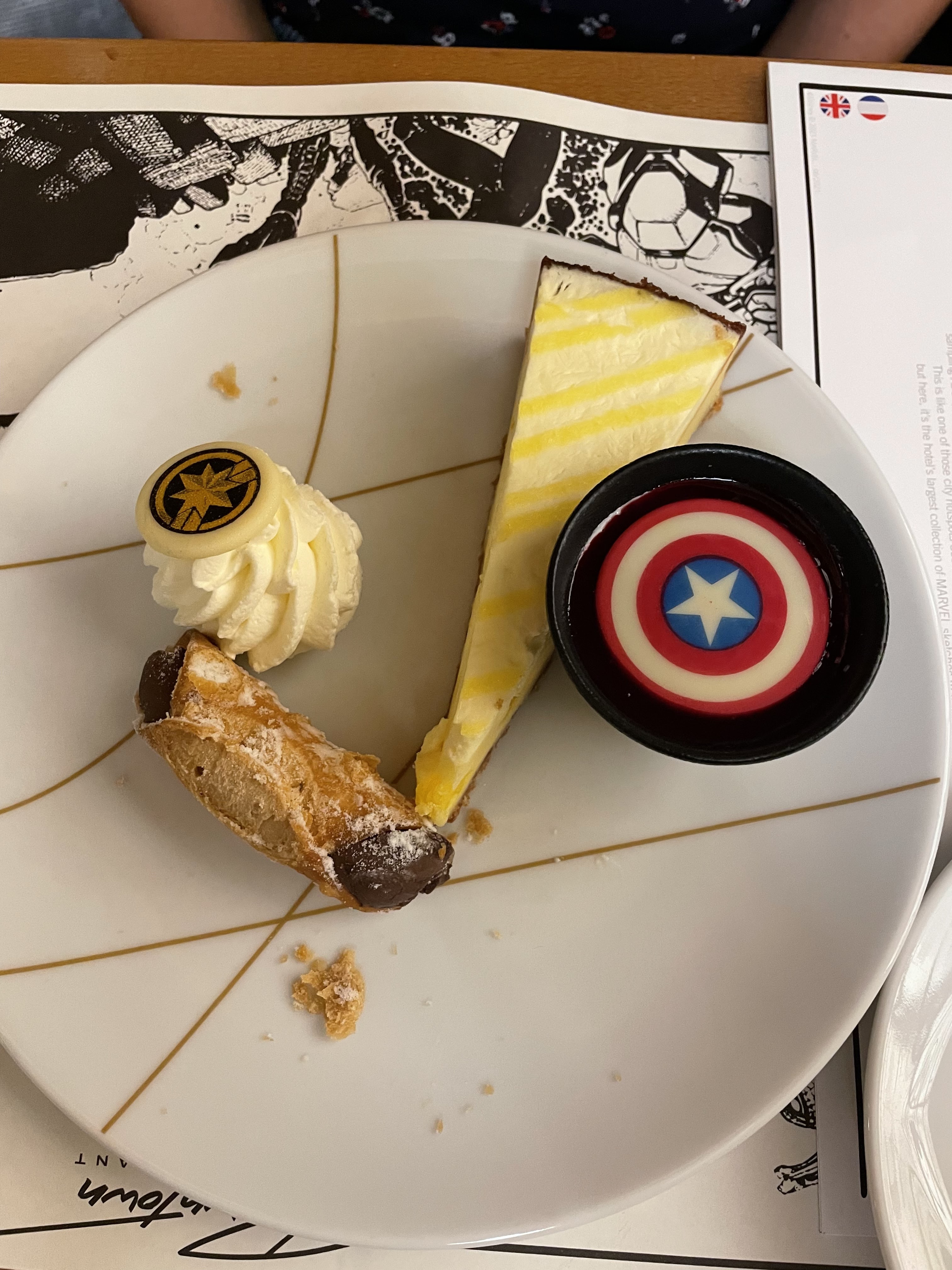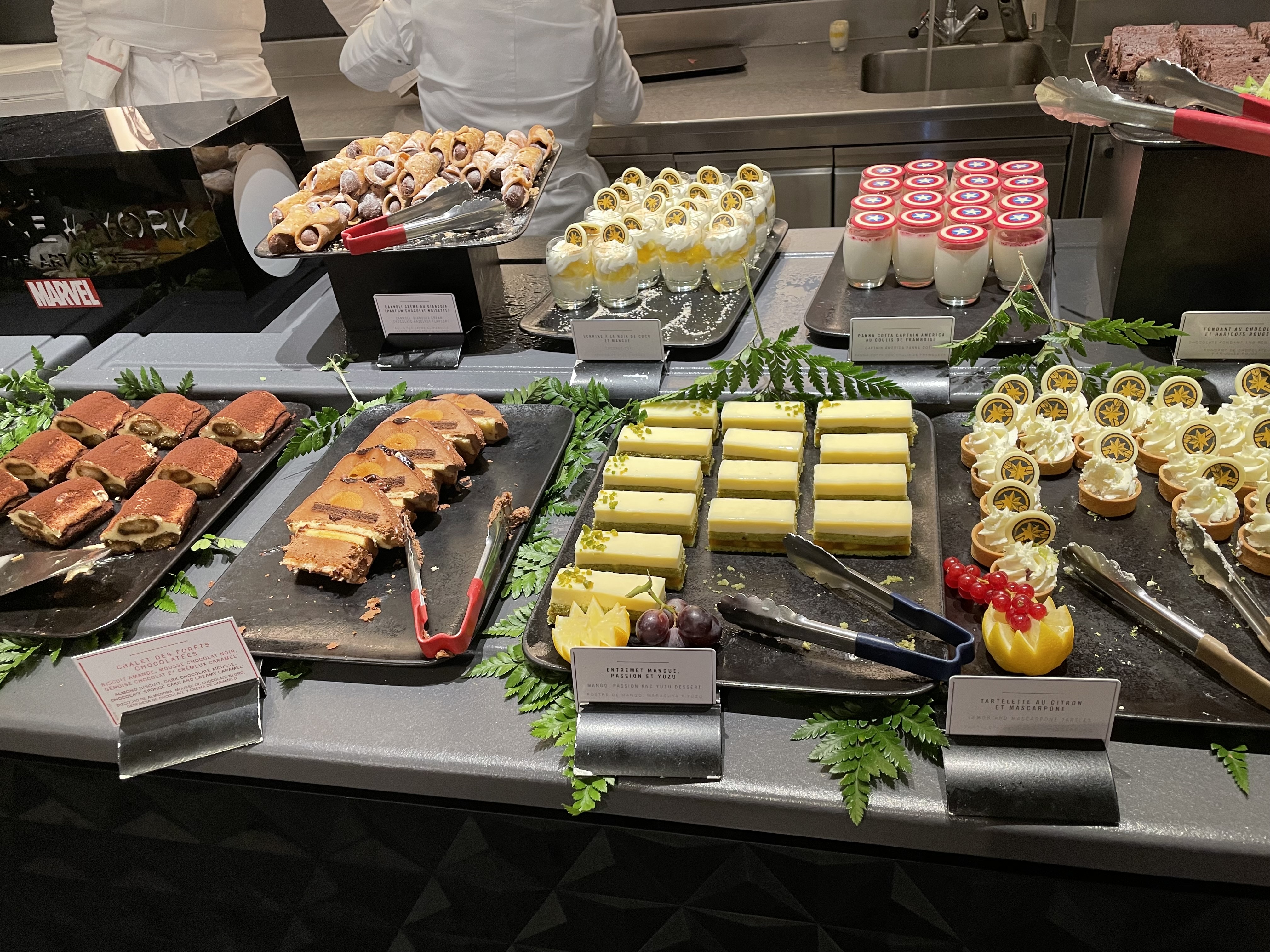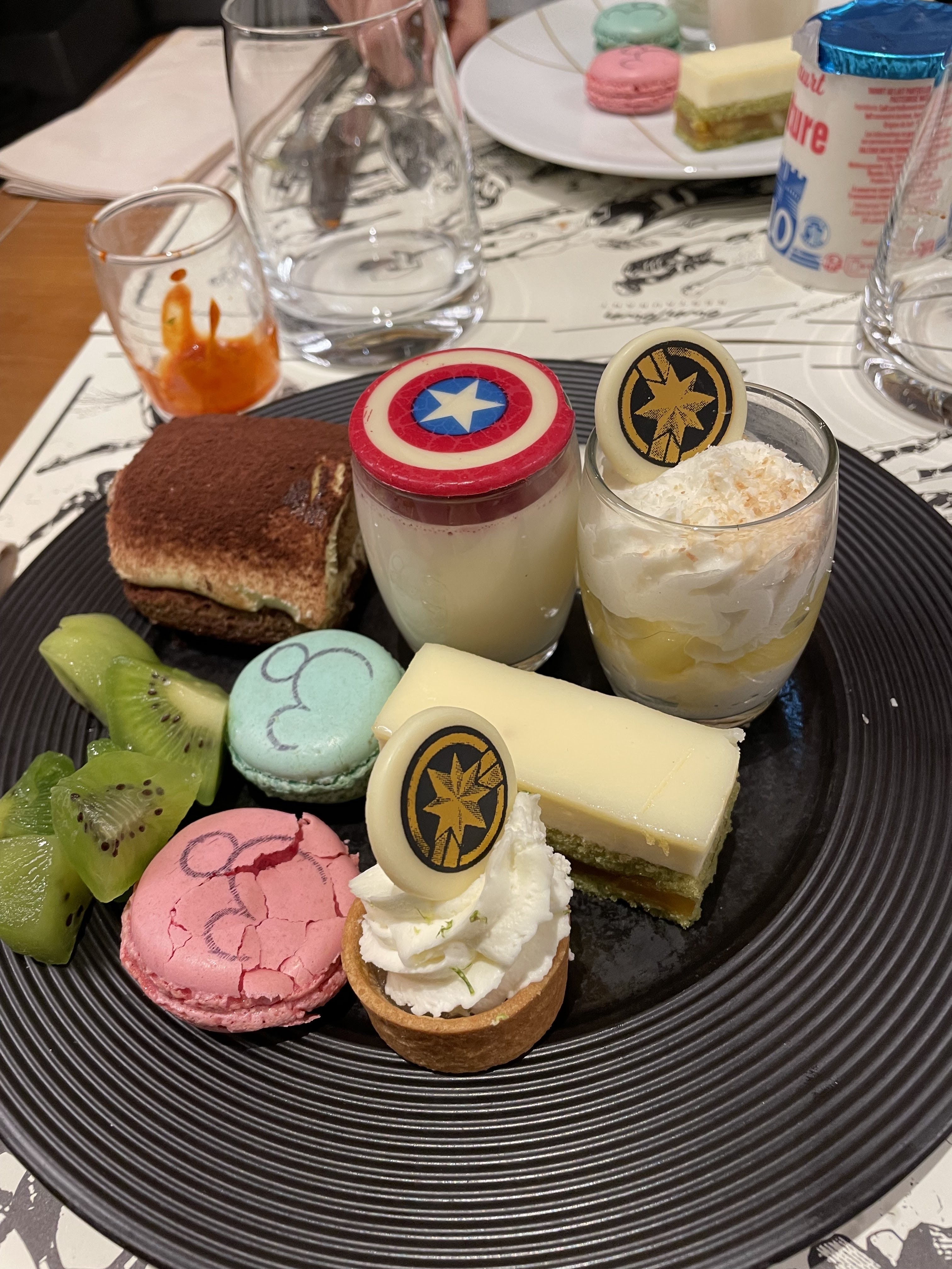 Salle un peu bruyante, personnel à l'écoute et au petit soin, nourriture variée, tout y était pour ce qui semble être selon moi le meilleur buffet à volonté de Disneyland Paris. Vous avez des choix tels que de la nourriture asiatique, italienne, est américaine tout en présentant autant de salée que de sucré. Les desserts sont bien entendu à l'image de Marvel car on y voit beaucoup de petits gâteaux en forme de personnage Marvel et c'est une clé en plus pour le côté spectacle et divertissant. Si vous souhaitez faire un repas buffet à volonté à Disneyland Paris je vous conseille vivement de réserver le Downtown de l'hôtel New York The Arts of Marvel 🌟