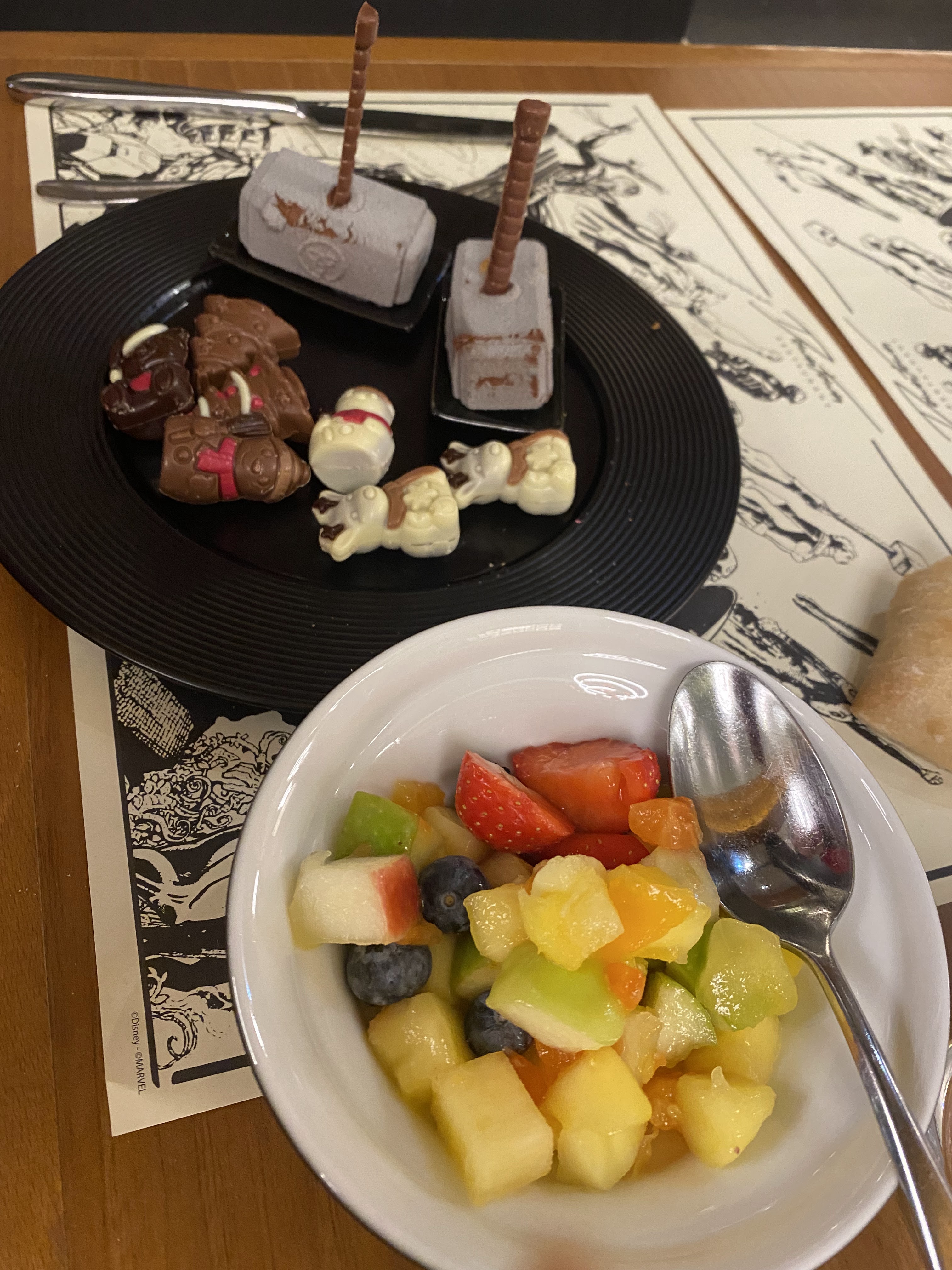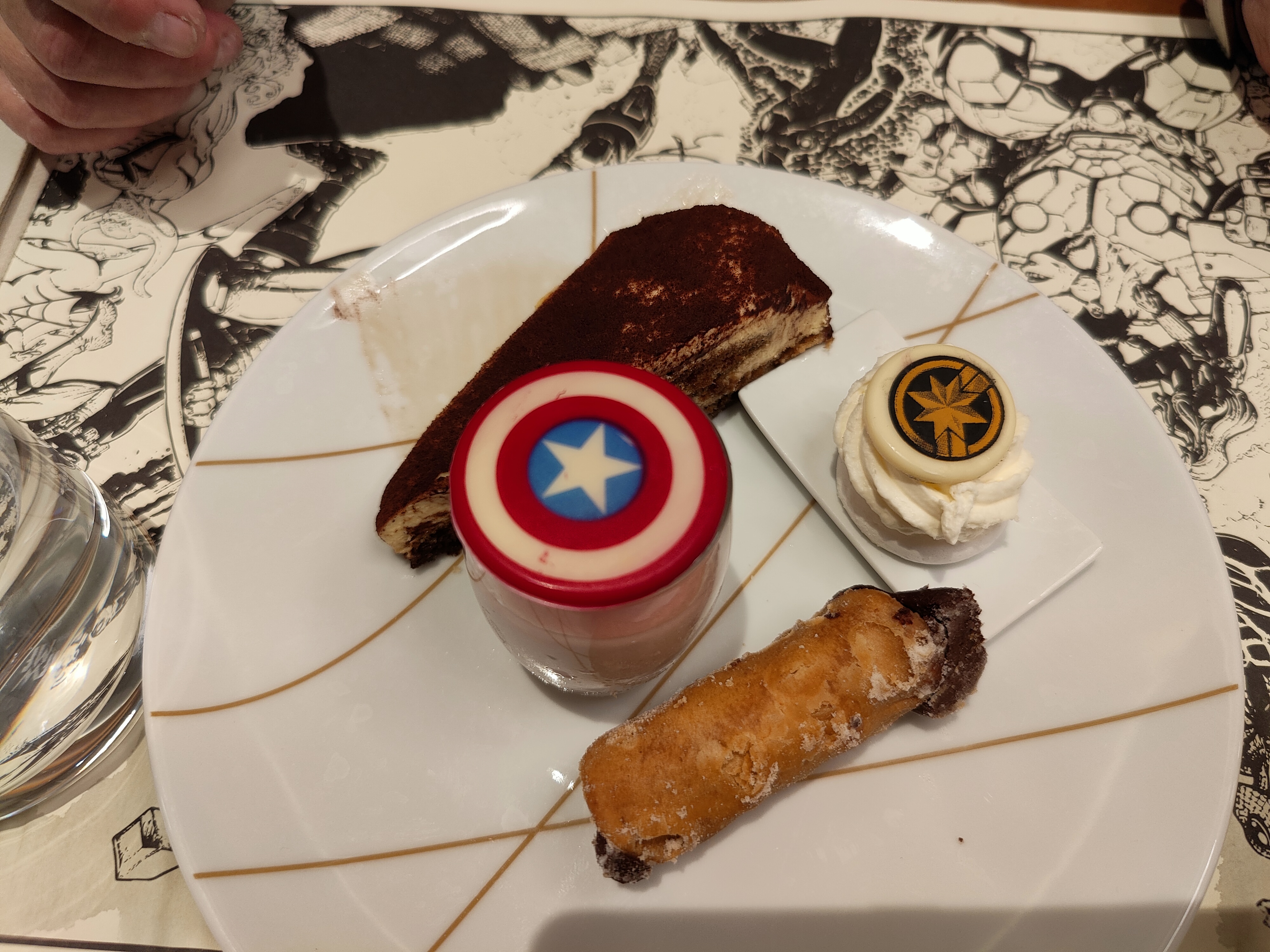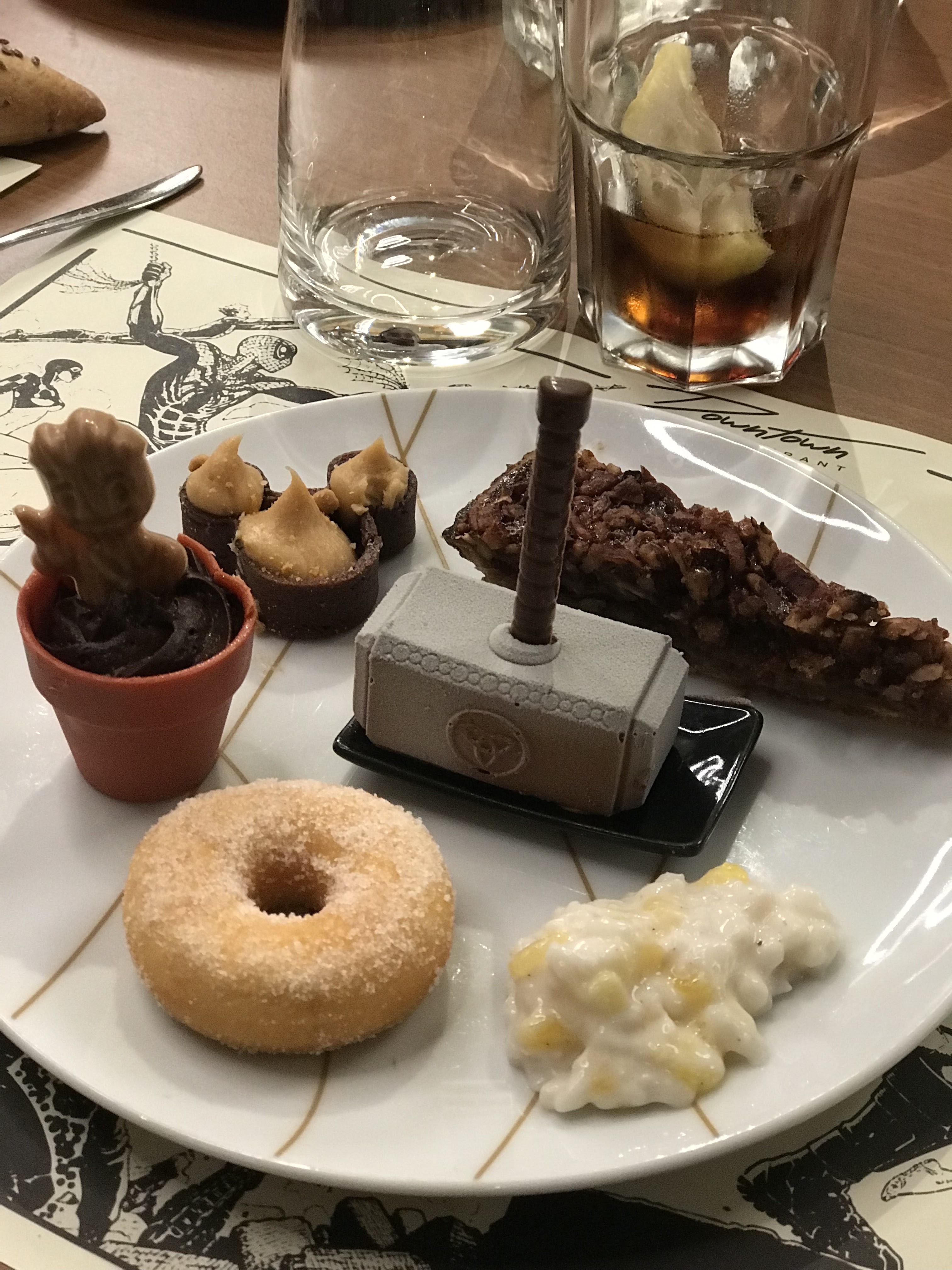 Salle un peu bruyante, personnel à l'écoute et au petit soin, nourriture variée, tout y était pour ce qui semble être selon moi le meilleur buffet à volonté de Disneyland Paris. Vous avez des choix tels que de la nourriture asiatique, italienne, est américaine tout en présentant autant de salée que de sucré. Les desserts sont bien entendu à l'image de Marvel car on y voit beaucoup de petits gâteaux en forme de personnage Marvel et c'est une clé en plus pour le côté spectacle et divertissant. Si vous souhaitez faire un repas buffet à volonté à Disneyland Paris je vous conseille vivement de réserver le Downtown de l'hôtel New York The Arts of Marvel 🌟