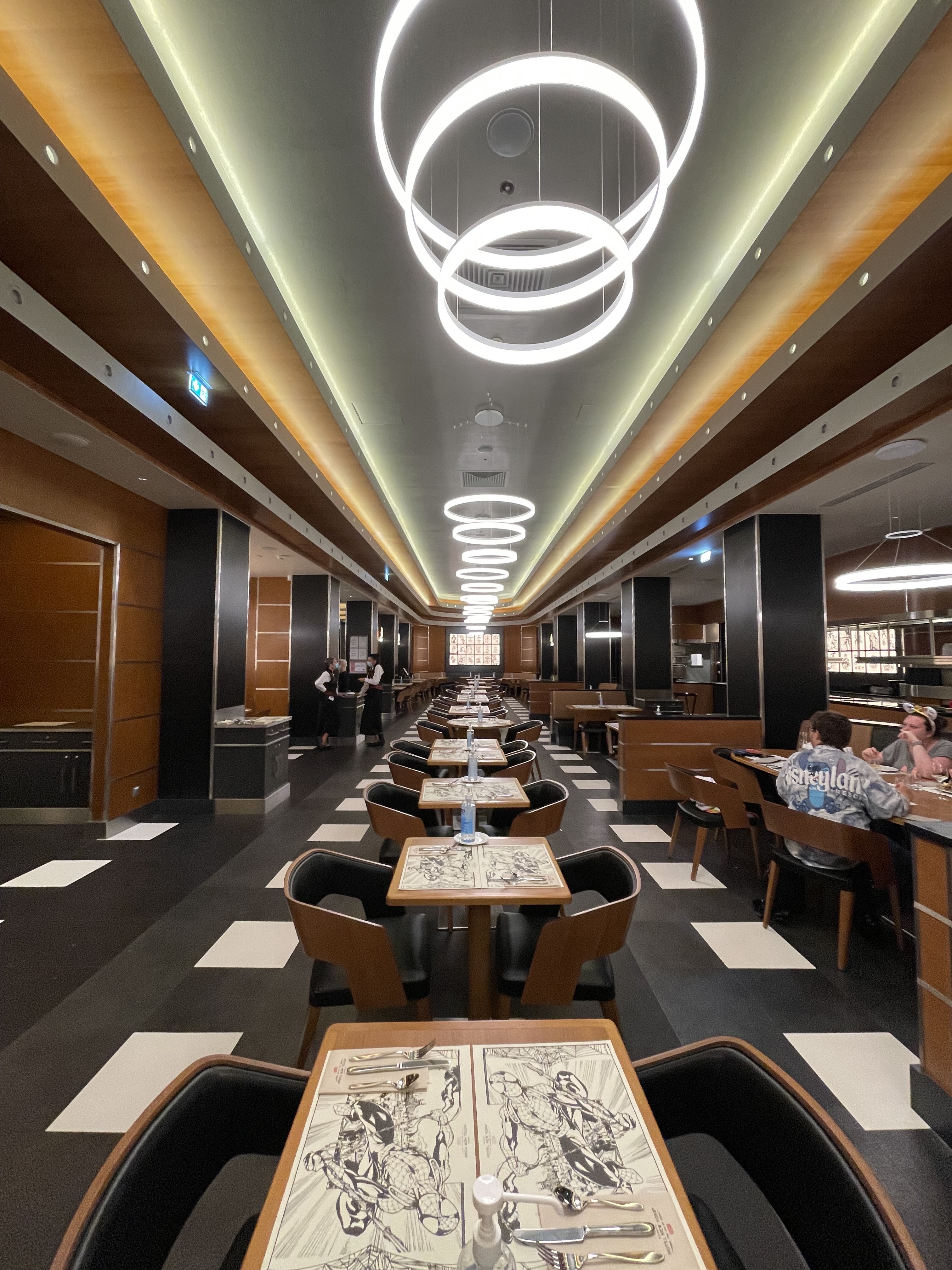 La nourriture était vraiment bonne. Il y a beaucoup de variété et la qualité était vraiment bonne. Il y a de la nourriture italienne, asiatique et américaine. Il pourrait avoir plus de détails Marvel, il n'est pas très décoré en comparaison avec les autres restaurants Disney. Le personnel était sympathique.