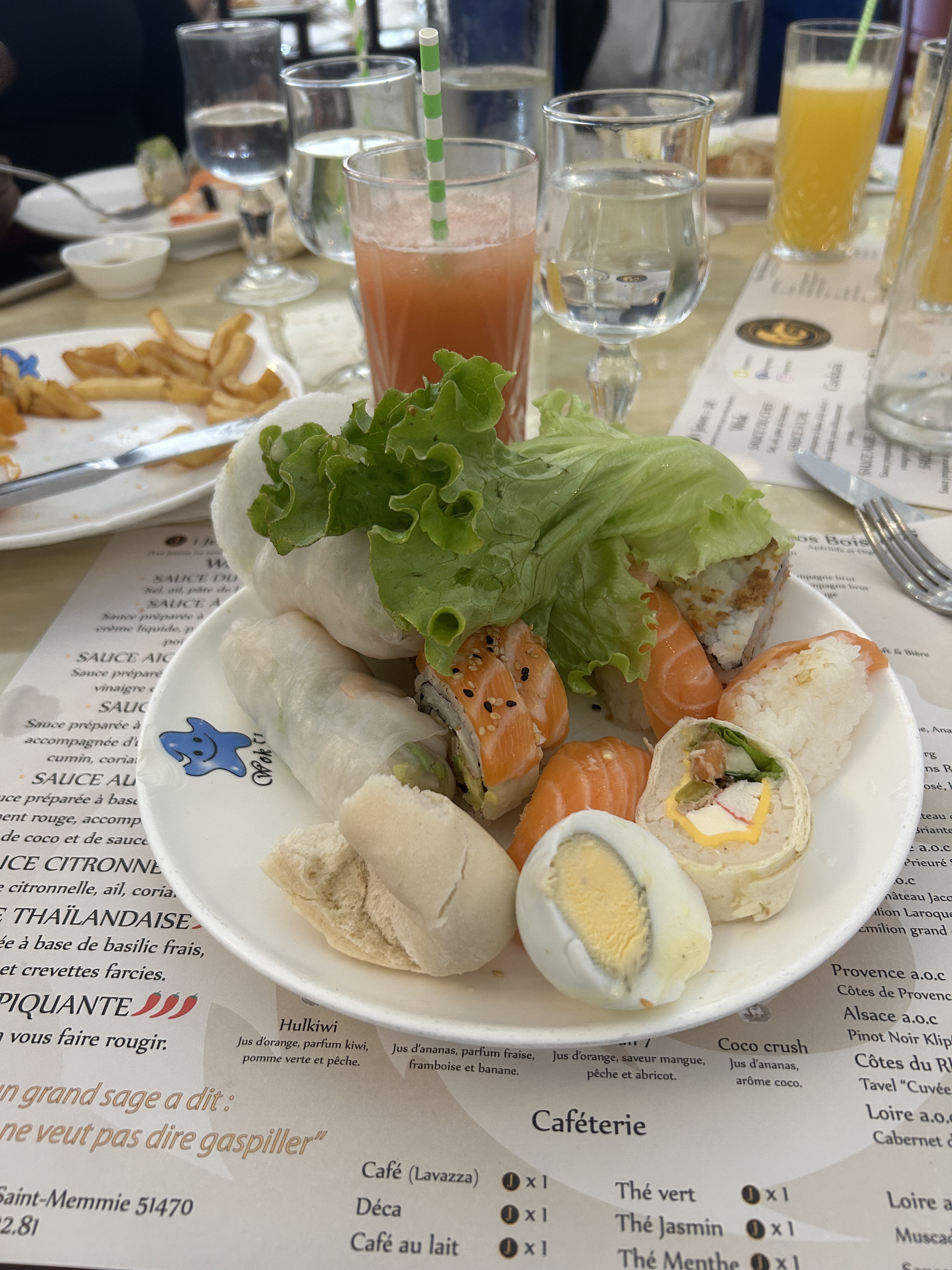 Des plats froids ( saumon, frite, nouilles ect) mais le pire... C'est les yaourts périmés 😱... Je trouve cela pas très professionnel et surtout au prix pour le soir !