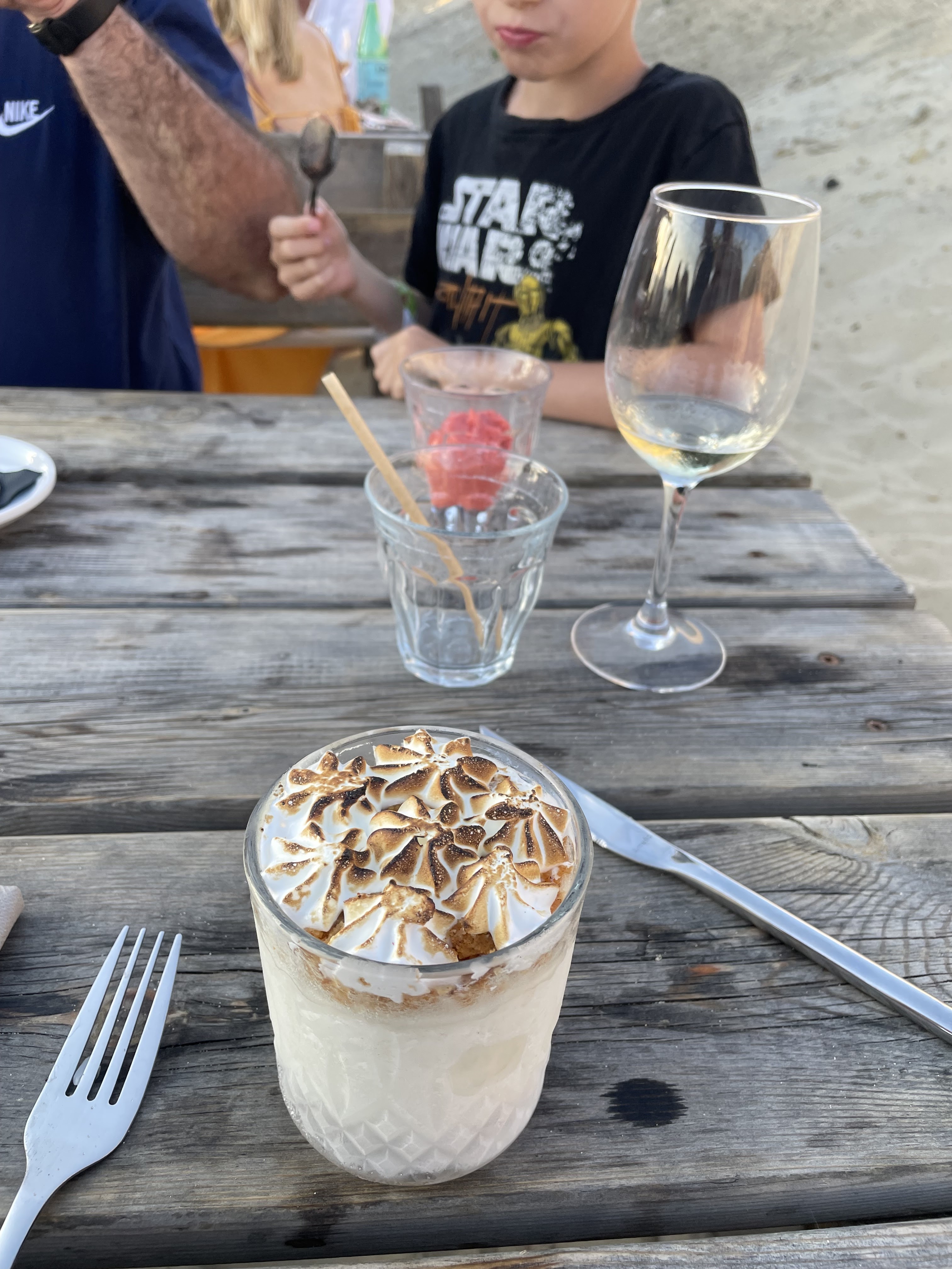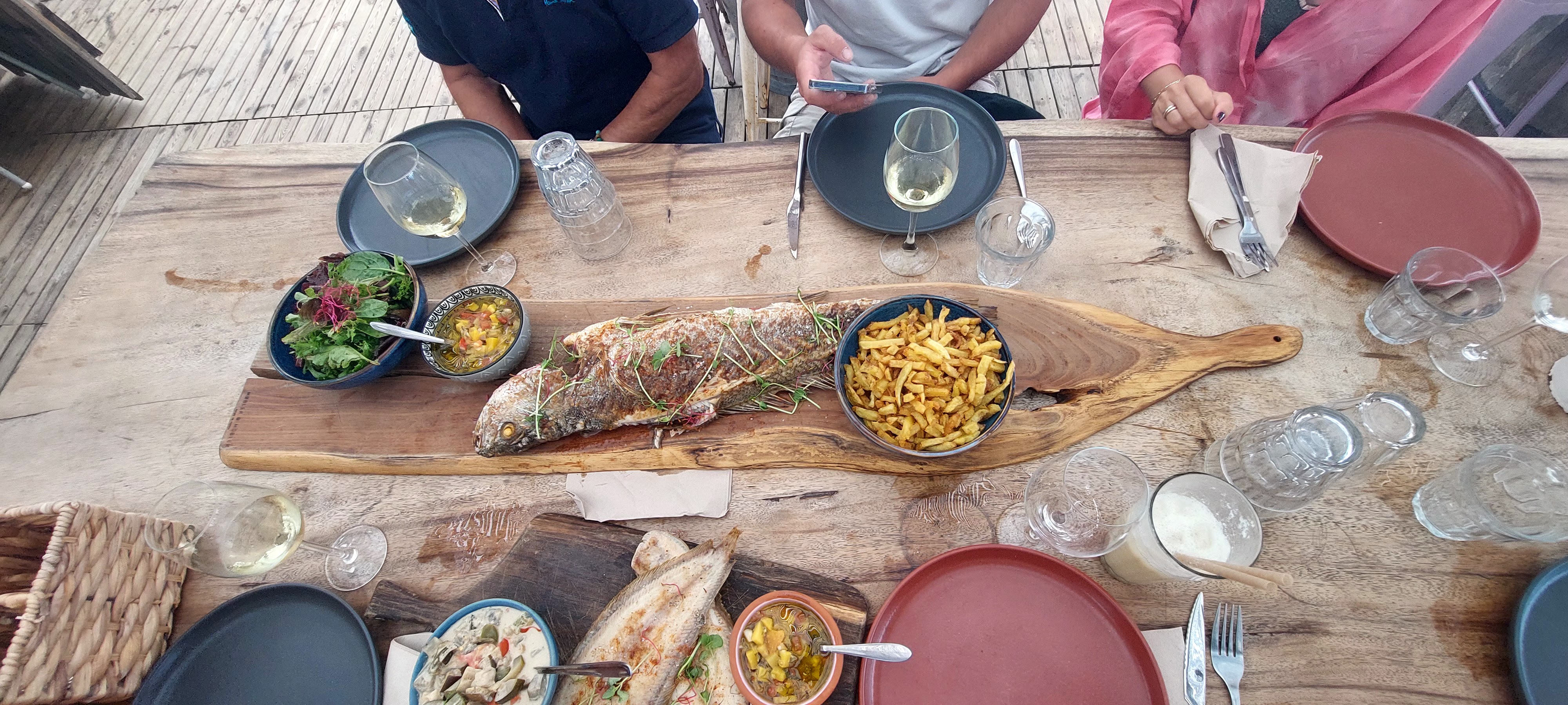 OK le cadre est splendide. Réservé 2 jours avant avec le patron car on partage la même passion du kitesurf pour le samedi soir 21h30. Premier plat servi à 23h15 pour les enfants, nous 23h30. Dorade et merlu froid. Le serveur adorable, s excuse et nous offre 2 get27 que l on retrouve facturé sur la note. 180€ pour diner froid, pas de dessert hormis une boule de glace pour la petite..franchement dégoûté