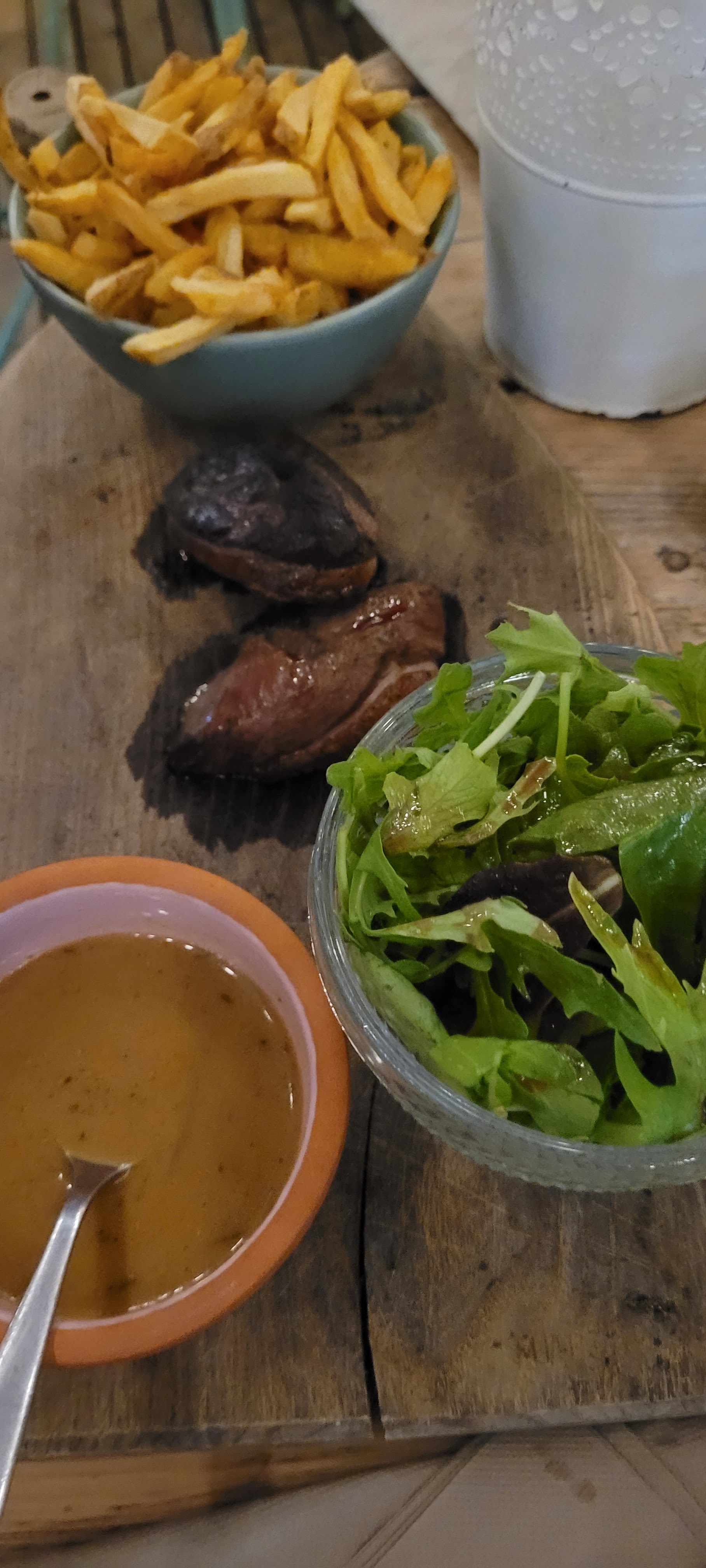 Nous avions réservé pour 19h, en période de couvre feu donc, avec l’espoir de sortir avant 21h, malheureusement nous avons été servi avec 1h de retard, la commande était incomplète, les frites sont arrivées à 21.10... De plus le calcul de la note n’était pas correct et nous avons payé 10€ de plus...néanmoins régulé après vérification de notre part. Cependant, le cadre est très chouette, et le patron a été compréhensif. Pas de plats végétariens, mais il y a des entrées vg Les chiens sont bienvenus, il y en a beaucoup qui circulent partout et peuvent s’inviter à votre table, ça peu en déranger certains
