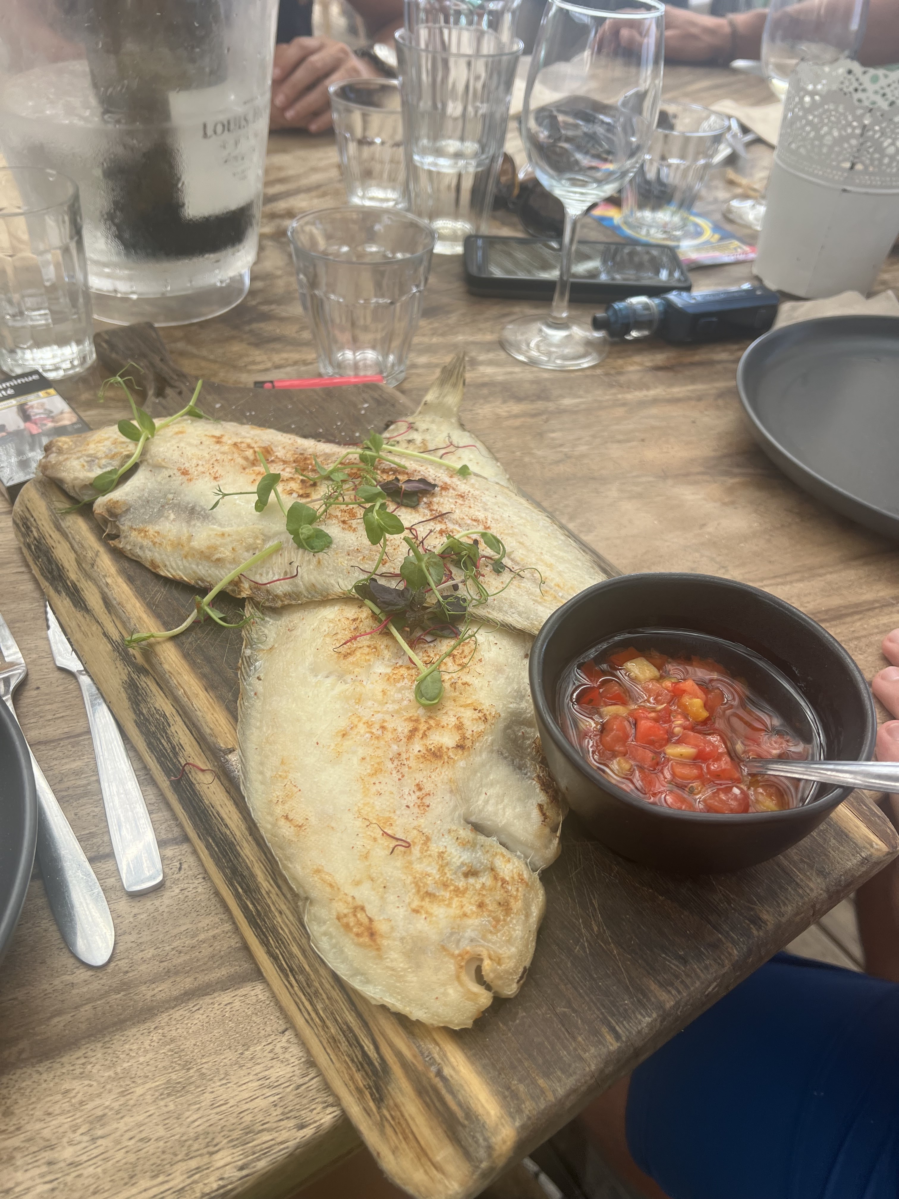 On a dû manger tard en fin de service (pas de commande après 15h30, fermeture cuisine à 16h), du coup on a pâtit d’un service moyen, pas à la hauteur de la dépense. Belle situation. Cocktails et assiettes fraîches sympas. Plats du jour à 35 euros… Faut pas regarder à la dépense.