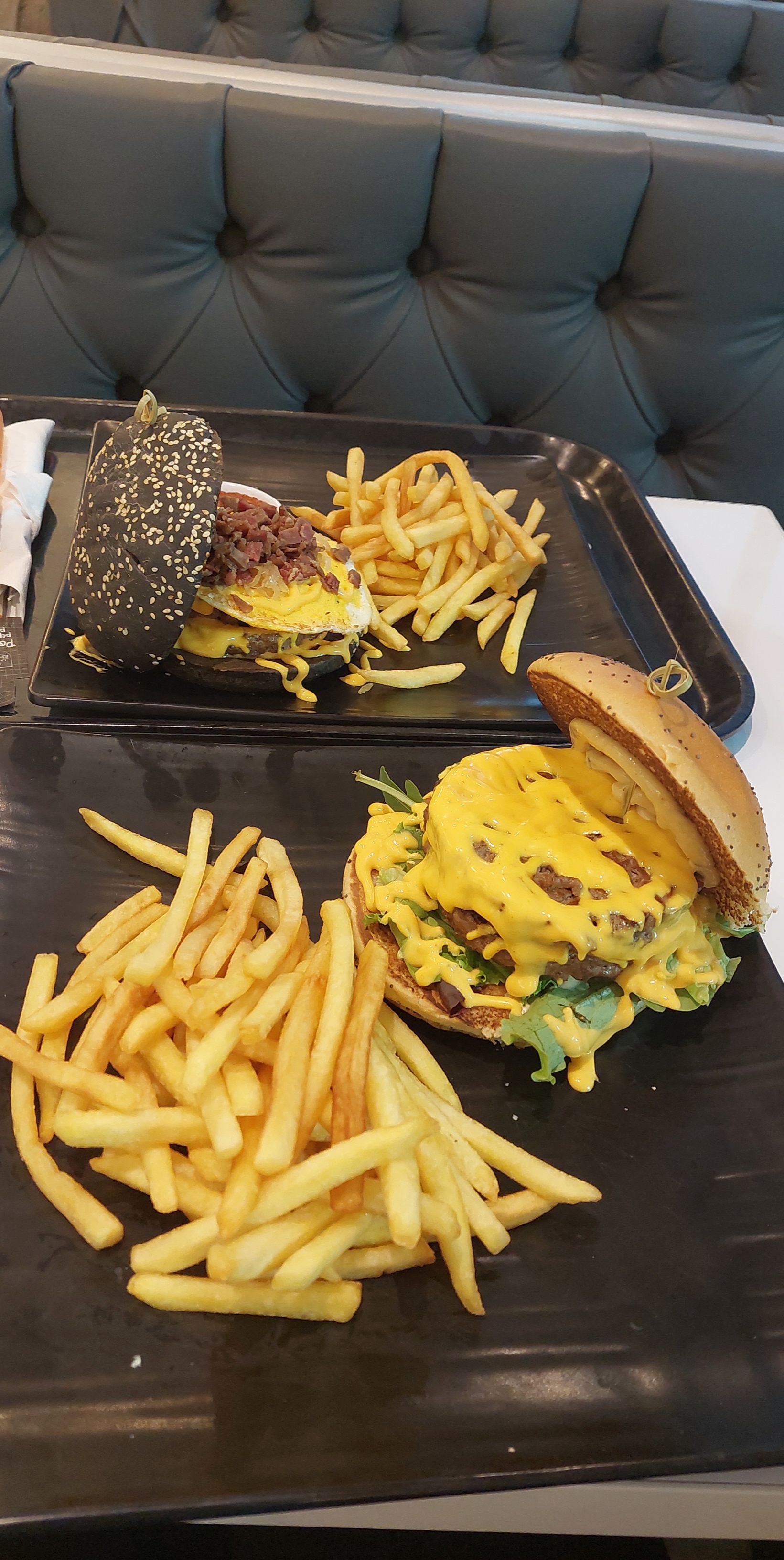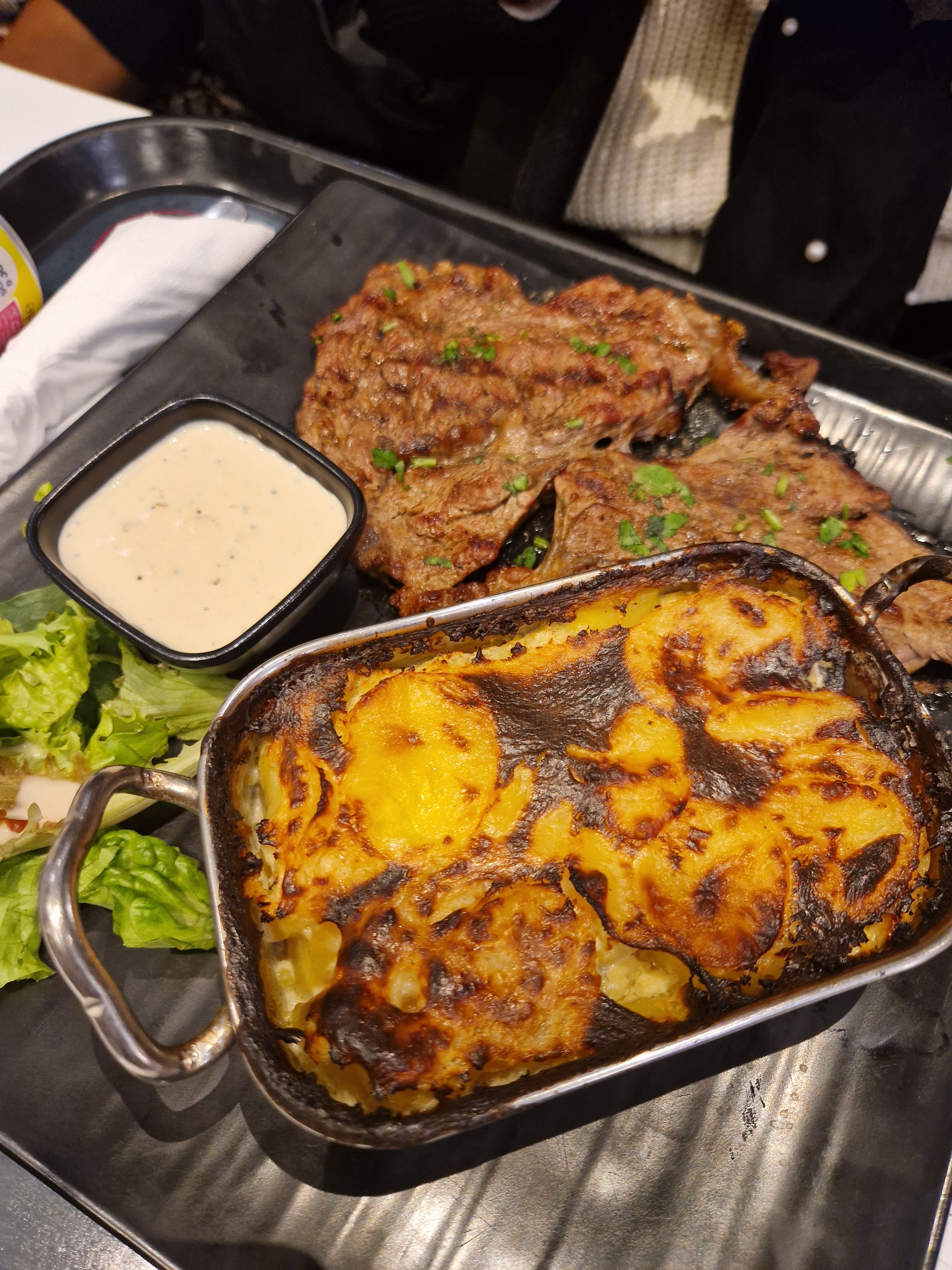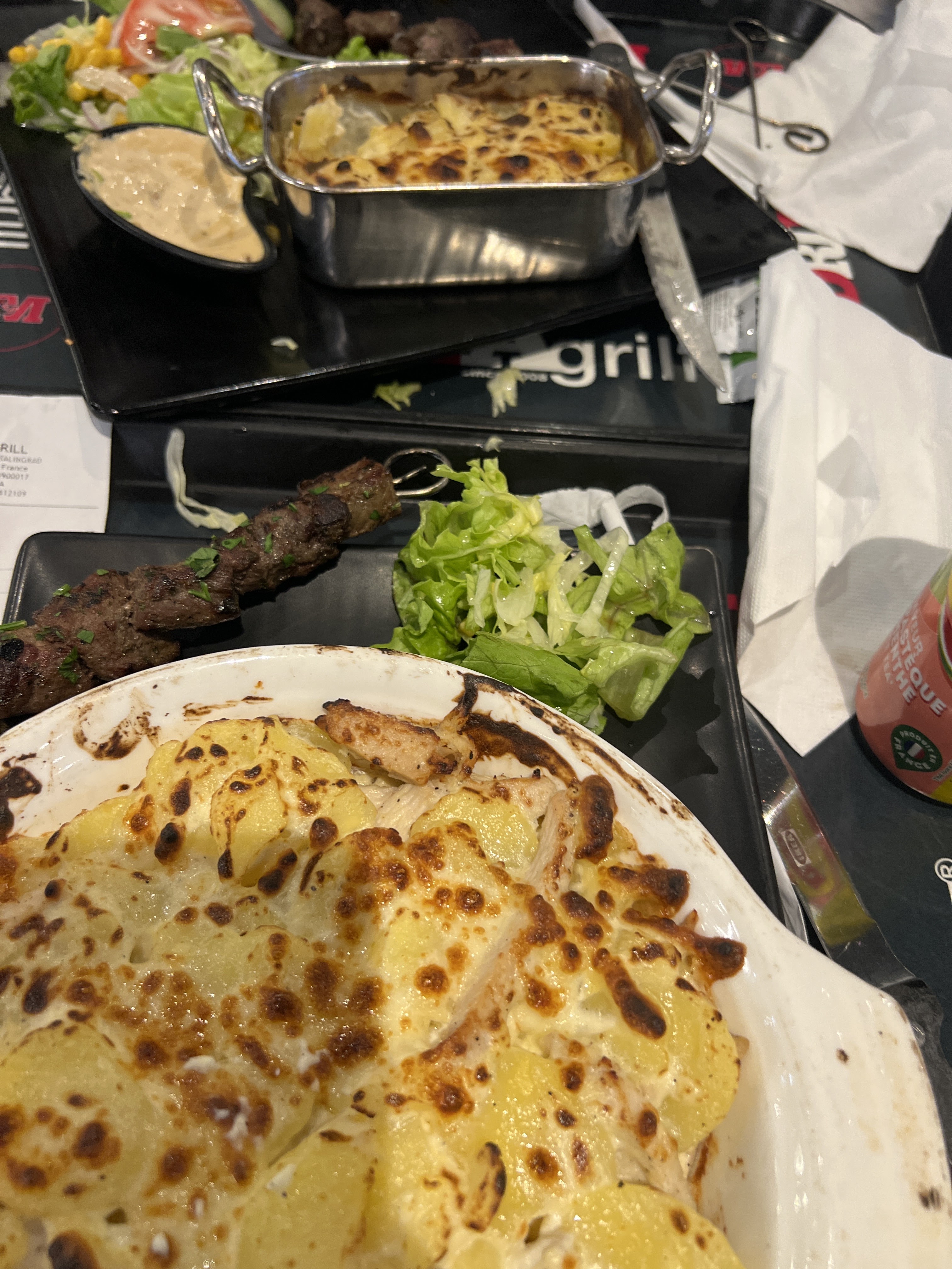 2 burgers et 1 gratin dauphinois Nous avons terminé de manger et débarrassé nos plateaux que le gratin dauphinois n'était toujours pas arrivé (un geste commercial a été effectué) Honnêtement l'endroit est agréable mais gustativement et organisation c'est à revoir On vient au restaurant pour partager un repas convivial et ensemble, pas en recevant nos plats en décalé. (Changer les frites, on a l'impression qu'elles sont cuites depuis plusieurs heures tellement elles étaient sèches)