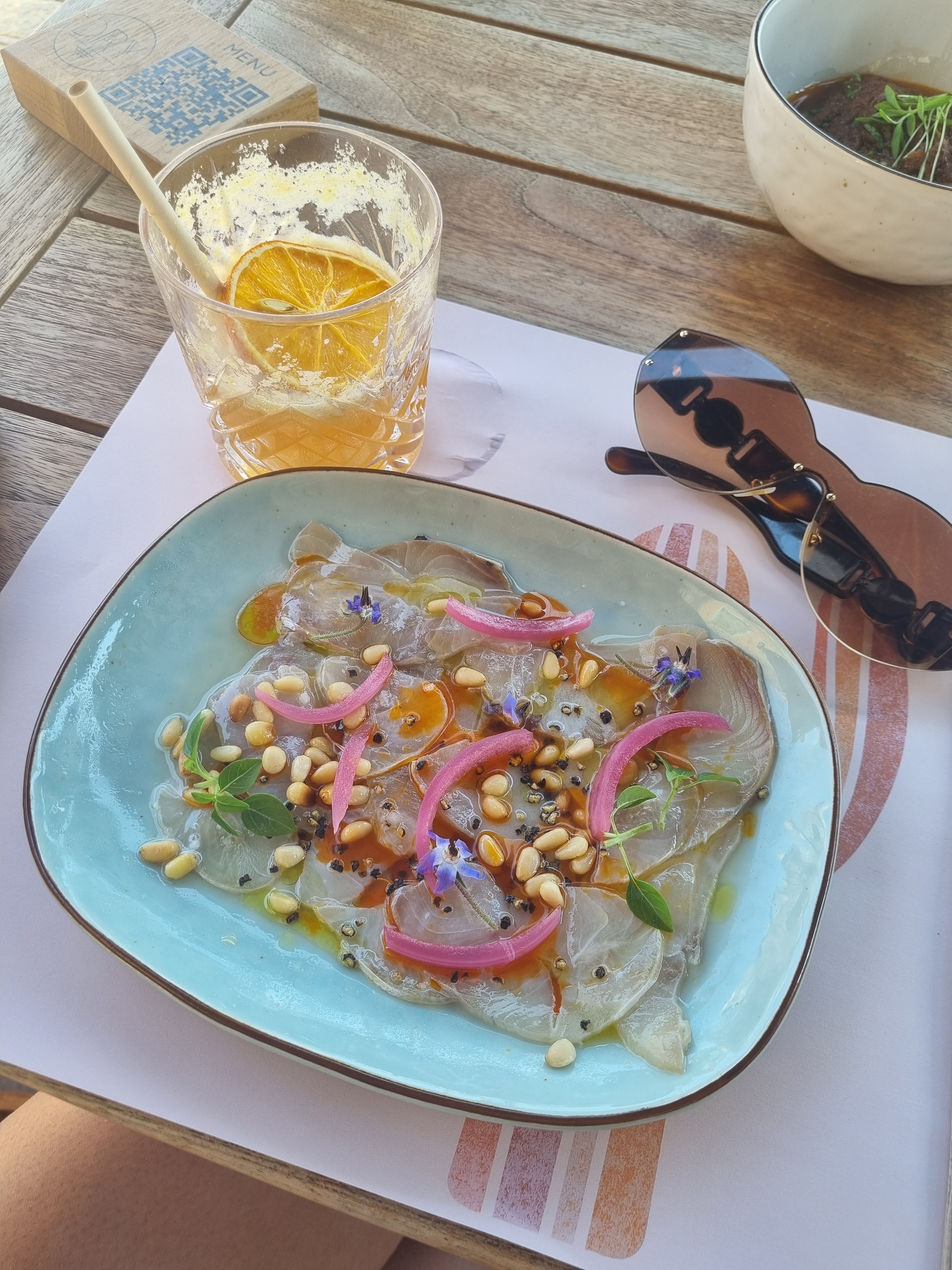 Beau restaurant au bord de l'eau près de la plage. J'ai adoré le concept d'un bar de plage confortable. L'équipe était très chaleureuse et nous avons été très bien accueillis. Nous avons commandé le gyoza (extrêmement bon), le tartare de thon sur riz à sushi, les tacos et le pulpo. Le cheesecake à la lavande et aux myrtilles était assez spécial. Ils servent également des cocktails raffinés et disposent d'un coin salon confortable pour les clients prenant un verre. Tout a été fait avec amour.