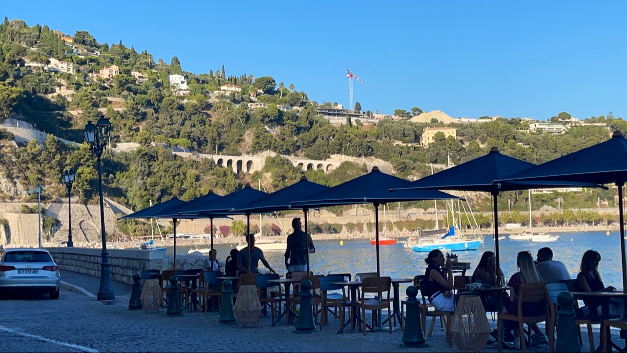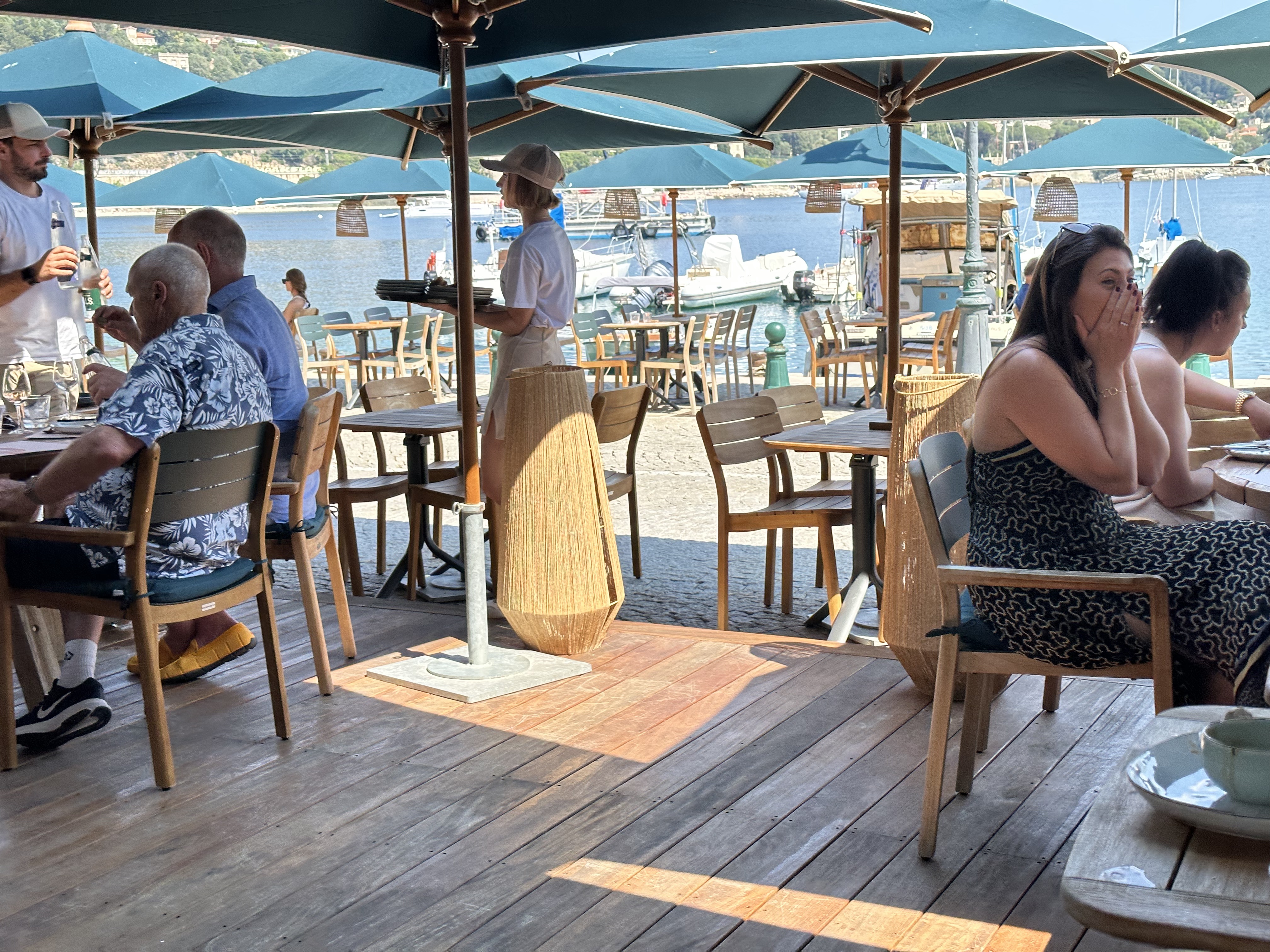 Ambiance agréable avec des sièges au bord de la mer. Prix un peu élevés mais probablement similaires à ceux d'ailleurs à Villefranche.