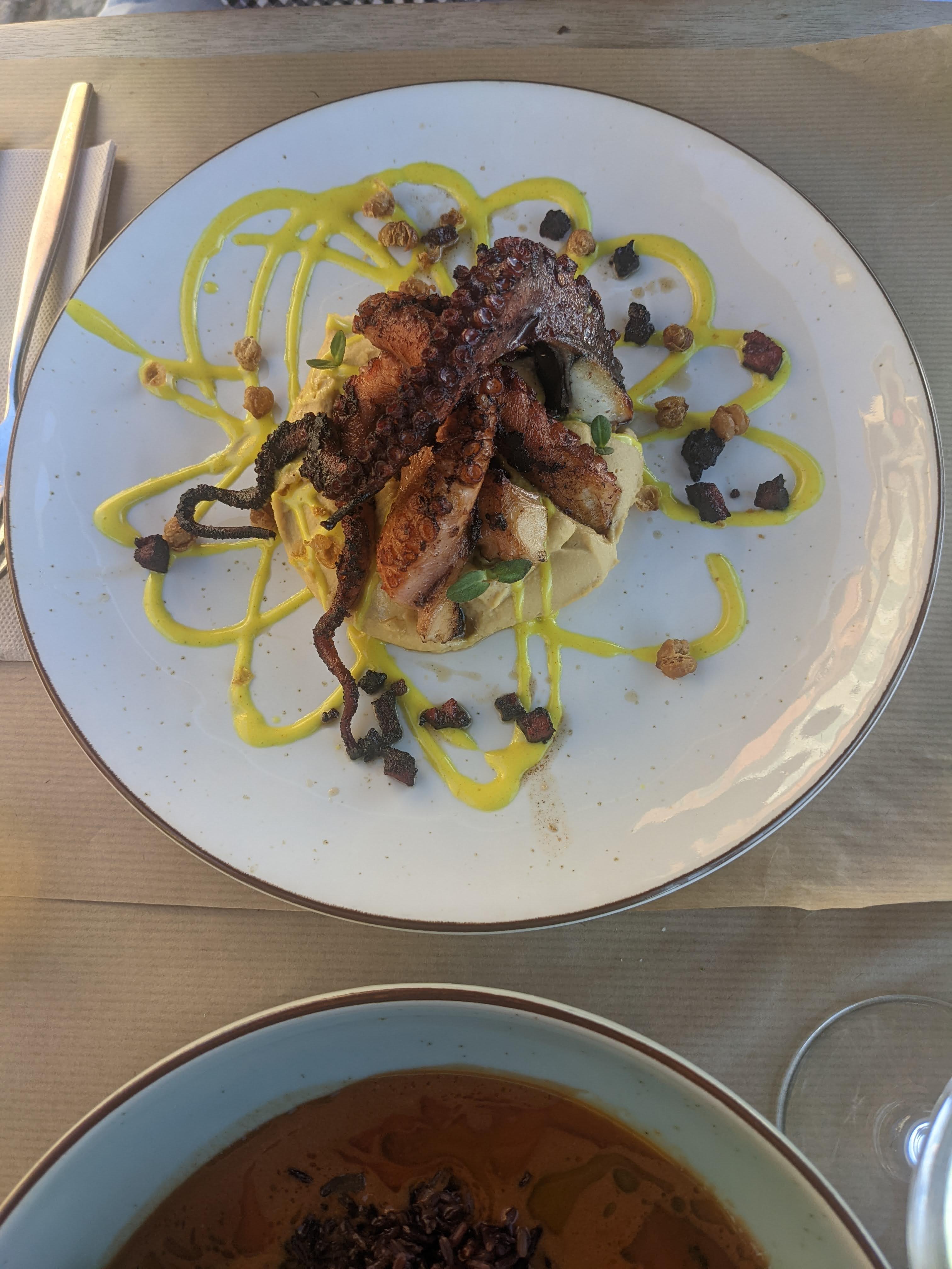 La nourriture était délicieuse. Mon poulpe était bien grillé et ma copine l'a aimé aussi. Elle a pris le curry de noix de coco avec des chips et elle a adoré. Le personnel était très sympathique.