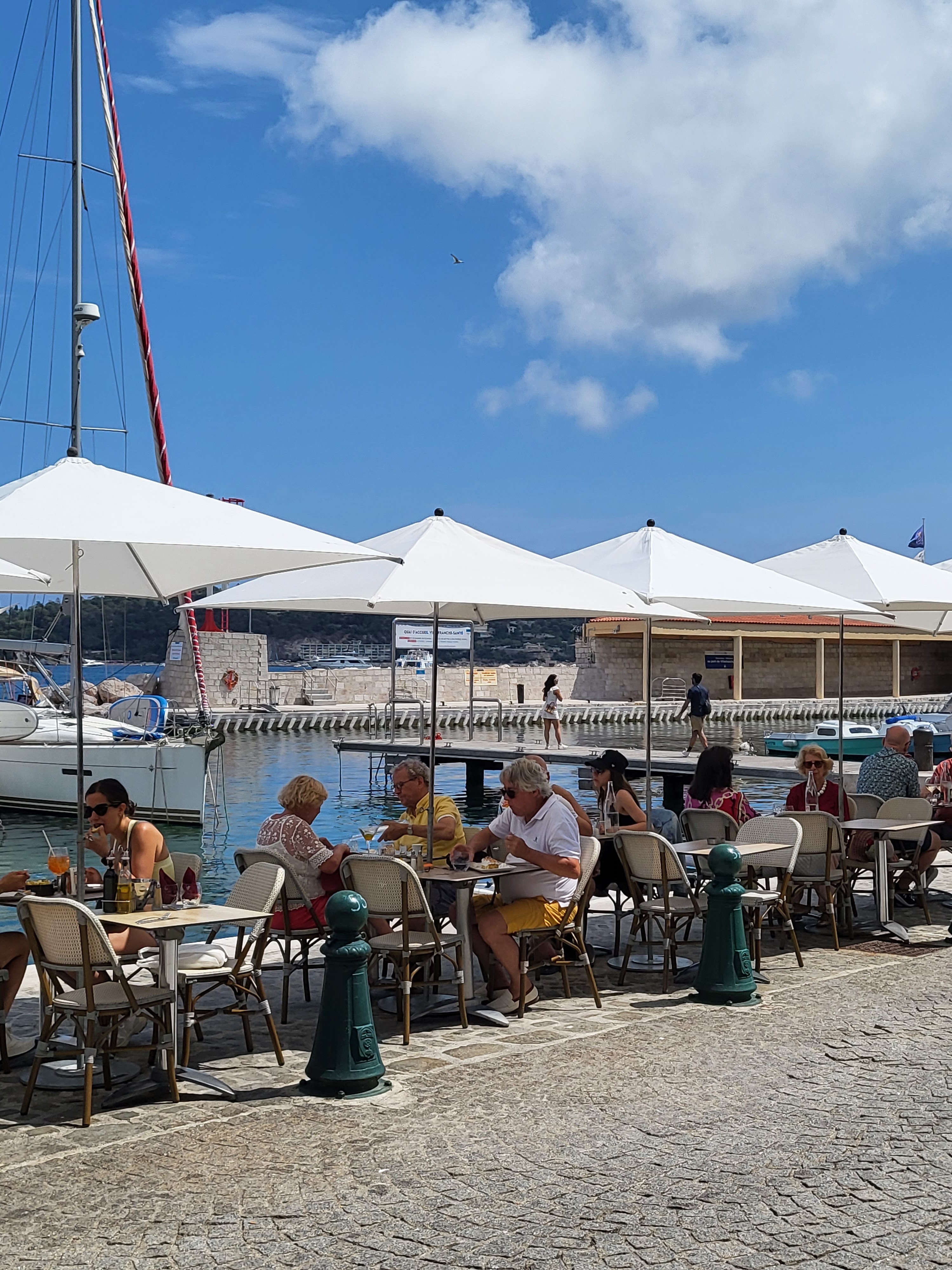 Un bel endroit où l'on peut profiter de la vue sur le port à condition d'être la au bon moment. Ces places là sont chères. Le service est agréable et efficace. Les plats et desserts sont bons. Un petit regret l'eau gazeuse est espagnole.