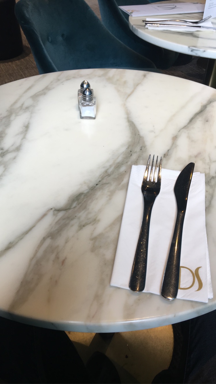 Déco à la fois épuré et cosy, le DS Café intrigue. Ci-dessous un petit résumé des fois où j'y suis allée avec les collègues. Côté glaces, il y a plutôt le choix (quand ils les ont toutes) et elles sont bonnes (mention spéciale pour la glace au yaourt nature). Toutefois, si la 1ère fois j'ai été ravie du service avec un cornet bien garni, la 2e fois a été décevante : 3 misérables boules qui ne dépassaient même pas du cornet. Ce n'était pas la même personne qui m'avait servie ces 2 fois. De plus, je ne suis pas certaine de l'agencement à l'intérieur du café pour les glaces. En effet, aux heures de pointe, vous avez vite fait de patienter en plein milieu du café avant d'être servi; ce qui dérange clairement les serveuses. Pas pratique du tout. Côté carte du déjeuner, il y a le choix est cela donne envie. J'ai opté la dernière fois pour la formule tartine (tartine et dessert à choisir d'après une sélection + un expression pour 14 euros) en remplaçant l'expresso par un thé. On m'avait parlé d'un thé Ceylan. J'ai donc pensé à celui de Mariage Frères comme indiqué sur leur carte. Je me suis retrouvée avec un thé Lipton yellow. Dans la mesure où le prix de la formule n'avait pas été modifié, cela ne me dérange pas que le thé soit imposé, mais cela aurait pu être précisé que ça allait être du Lipton. Au moins pour m'éviter la surprise. Du côté de l'assiette, j'aurais sans doute préféré avoir un autre type de salade que de l'iceberg. La mousse au chocolat était bonne. Côté service, nous avons été servies rapidement car nous sommes arrivées tôt mais une fois le restau rempli, il faut avoir un peu de patience. Nous avons attendu pour les desserts en tout cas... Dommage. Du coup, globalement, c'est correct avec ses + et ses - mais pas le coup de cœur non plus. Je n'irai pas y manger tous les midis par exemple... car il reste toujours possible de trouver plus intéressant en rapport qualité / prix dans le coin.