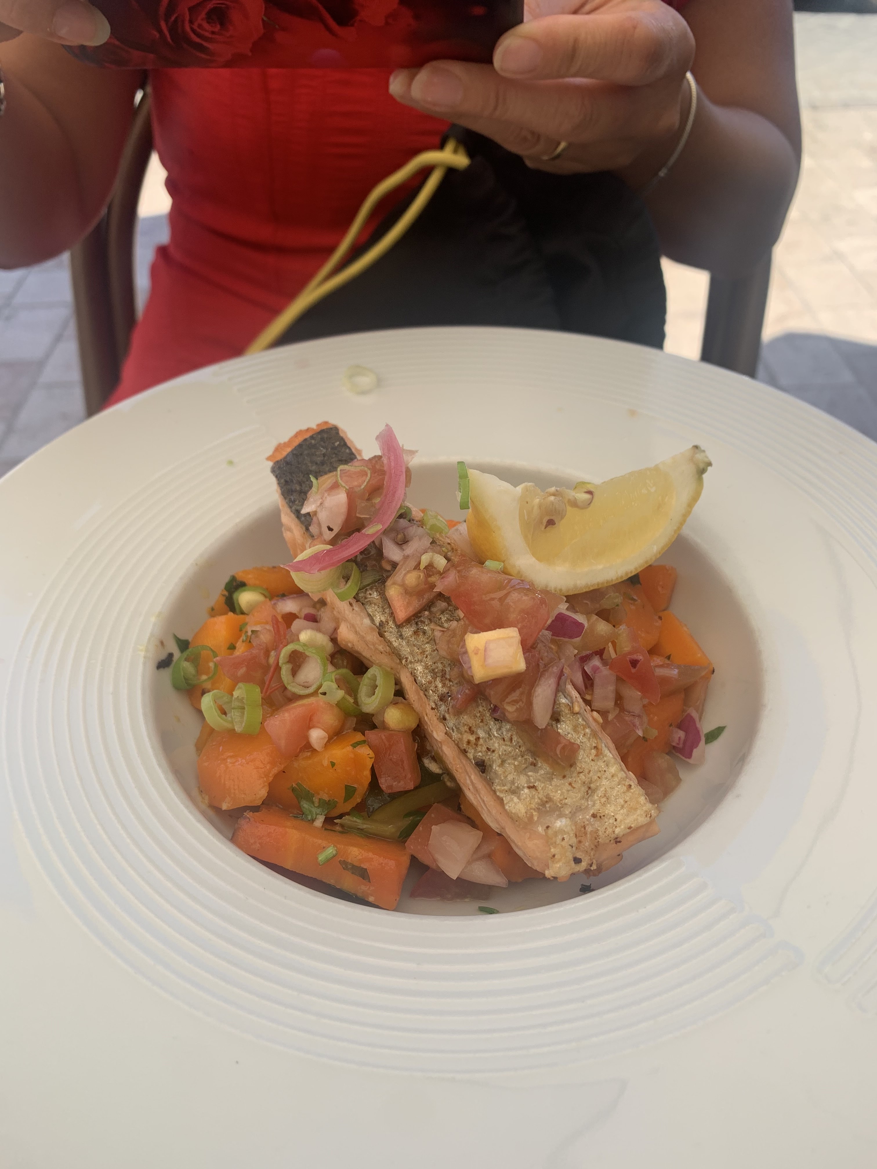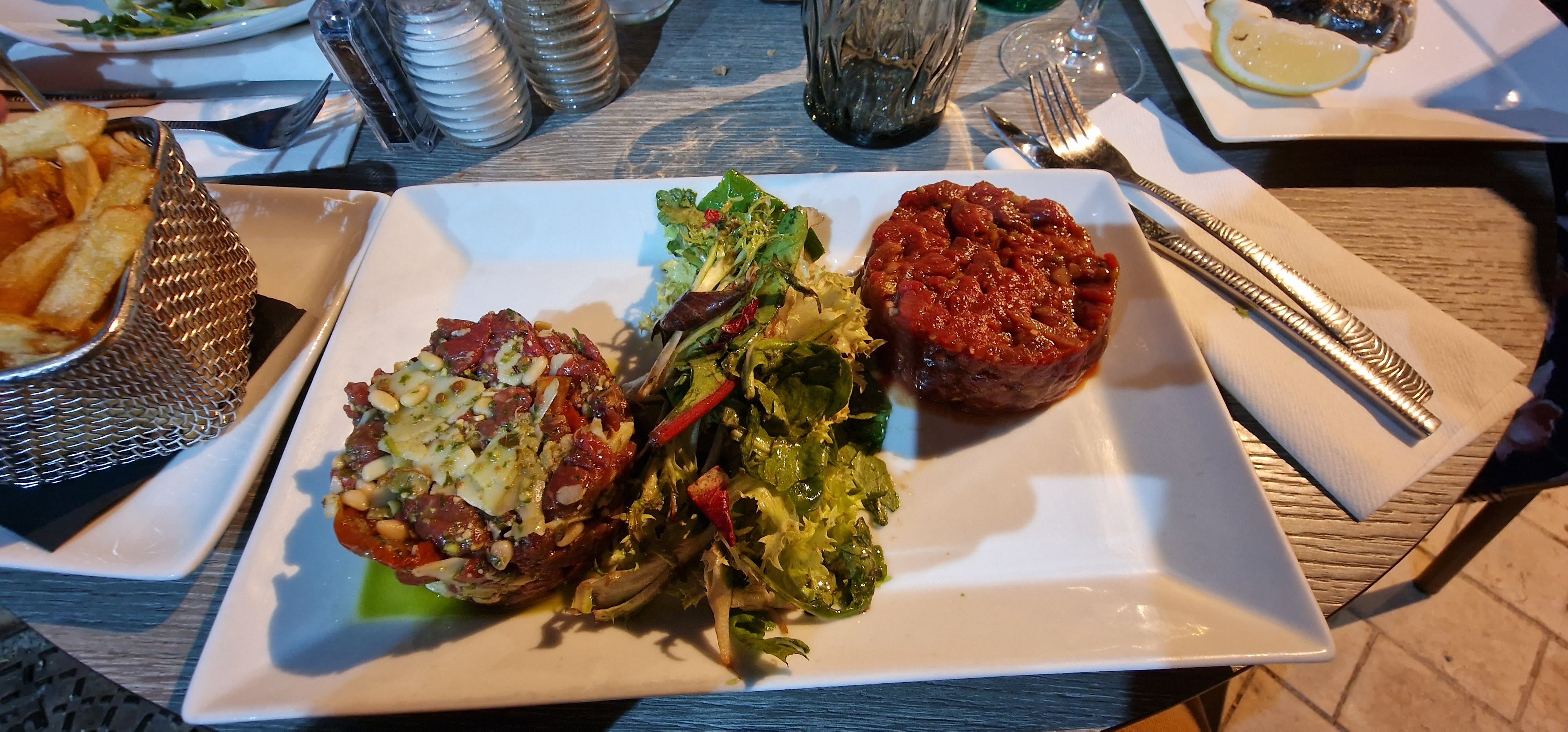 Parfait un tartare de saumon frais et préparé minute un filet de bœuf tendre et savoureux accompagné d'un minuty rosé top. Service impeccable