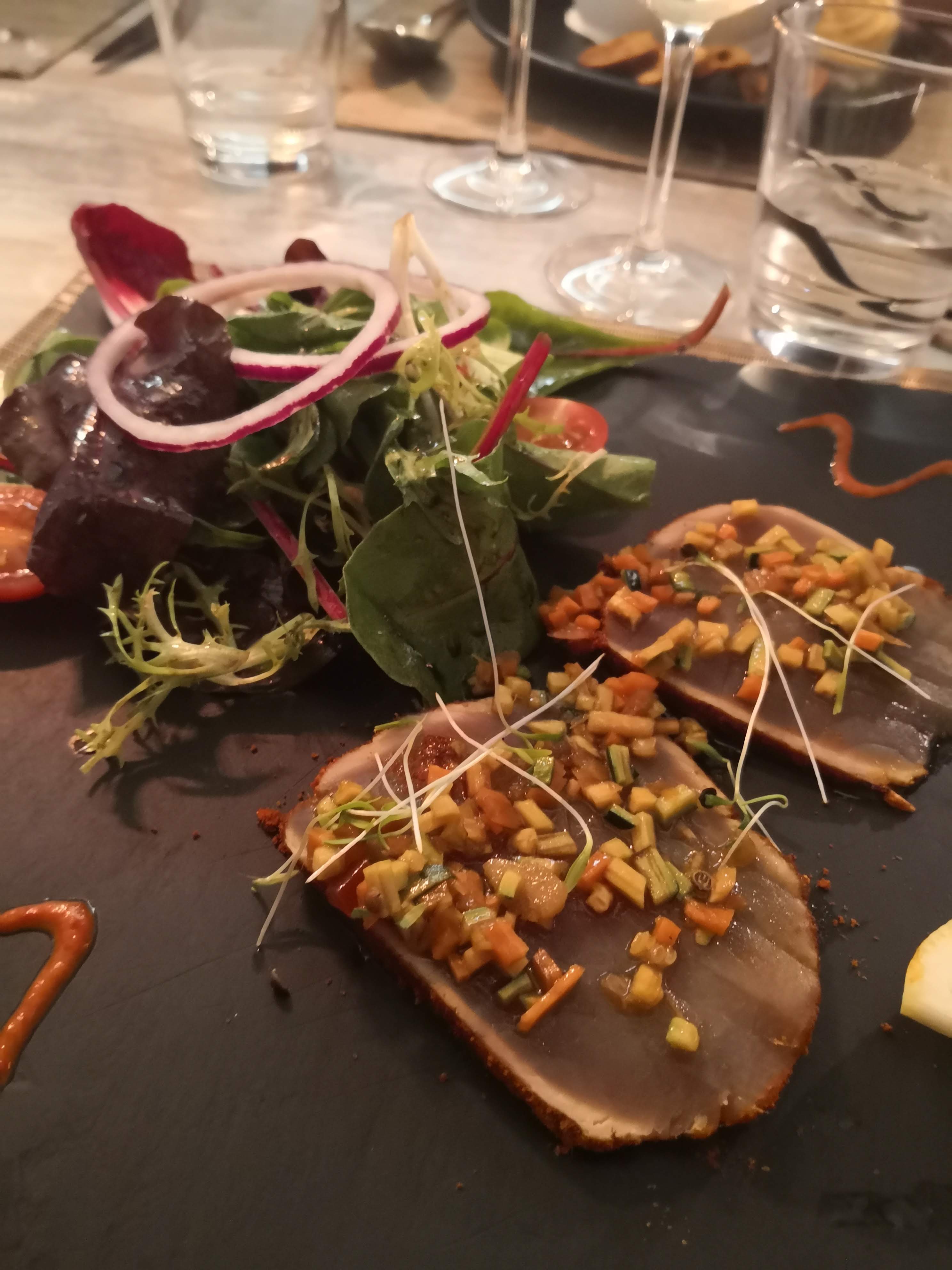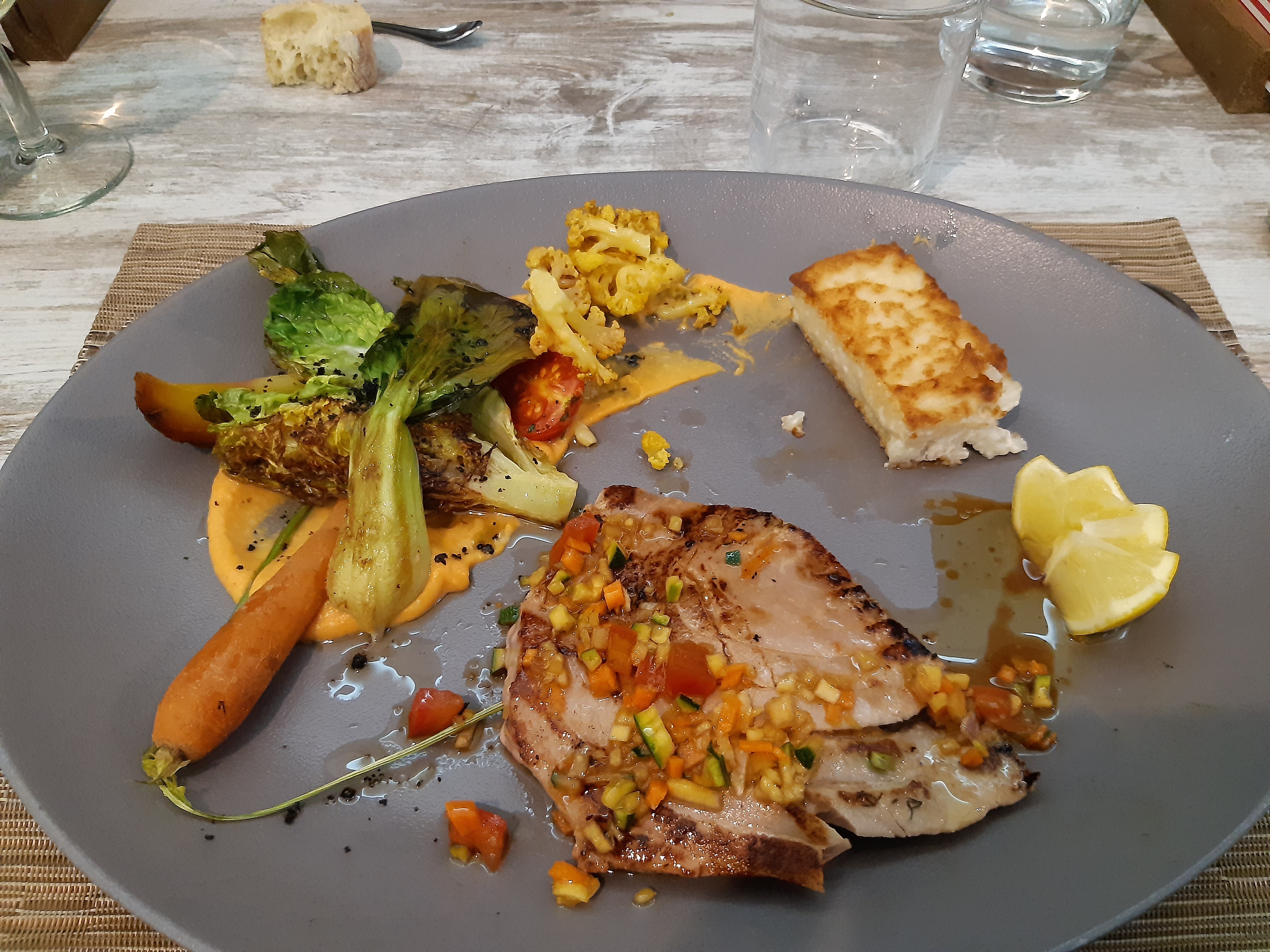 Ma fille qui n avait jamais mangé de Thon rouge s est régalée, un plaisir pour les yeux tout d abord , avec tout une variété de petits légume de couleur et ensuite pour les papilles .Le chef Fred, toujours le sourire et une petite visite auprès de ses clients pour voir si tout se passe bien . Je recommande vivement si vous voulez une bonne cuisine préparée par un très bon chef