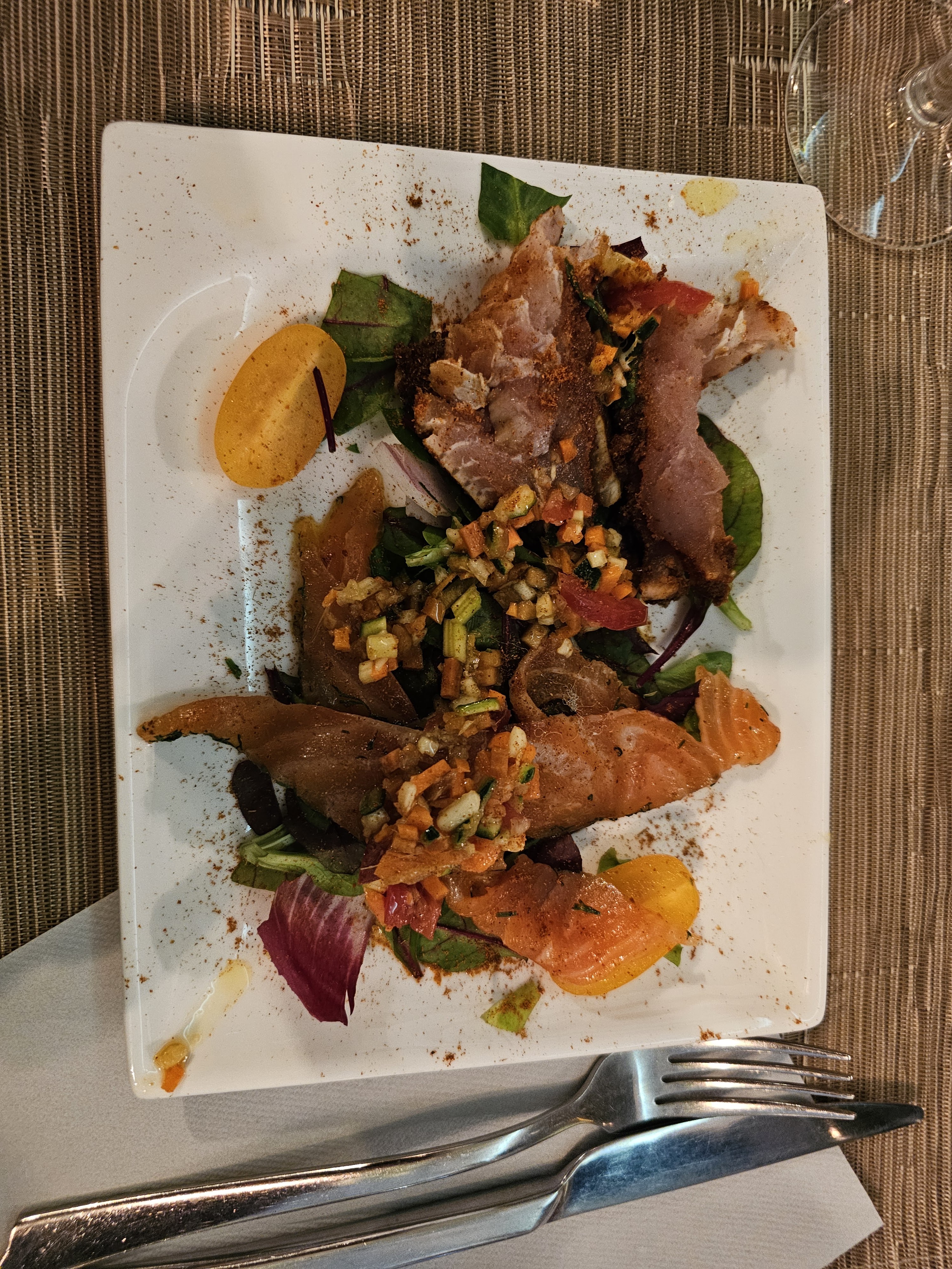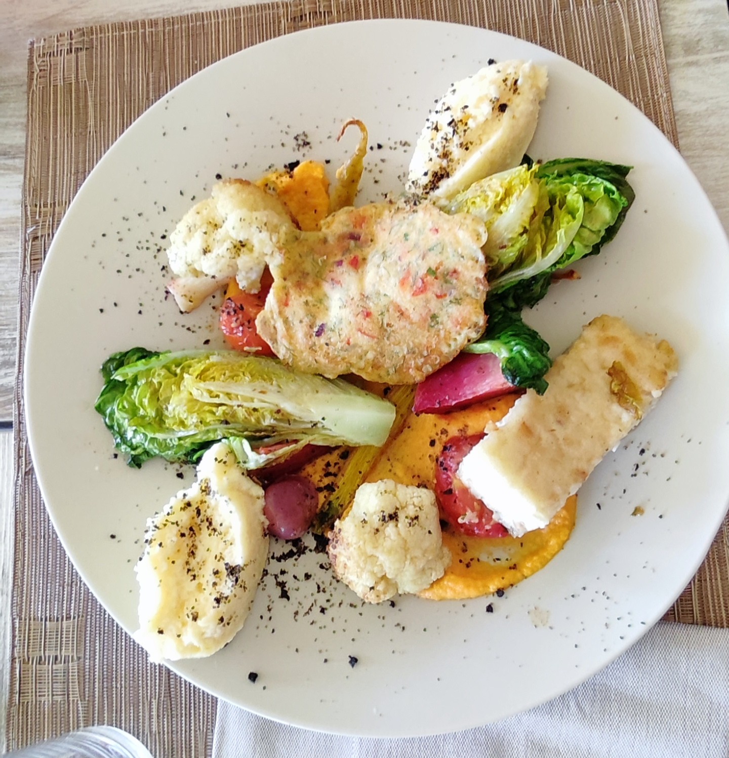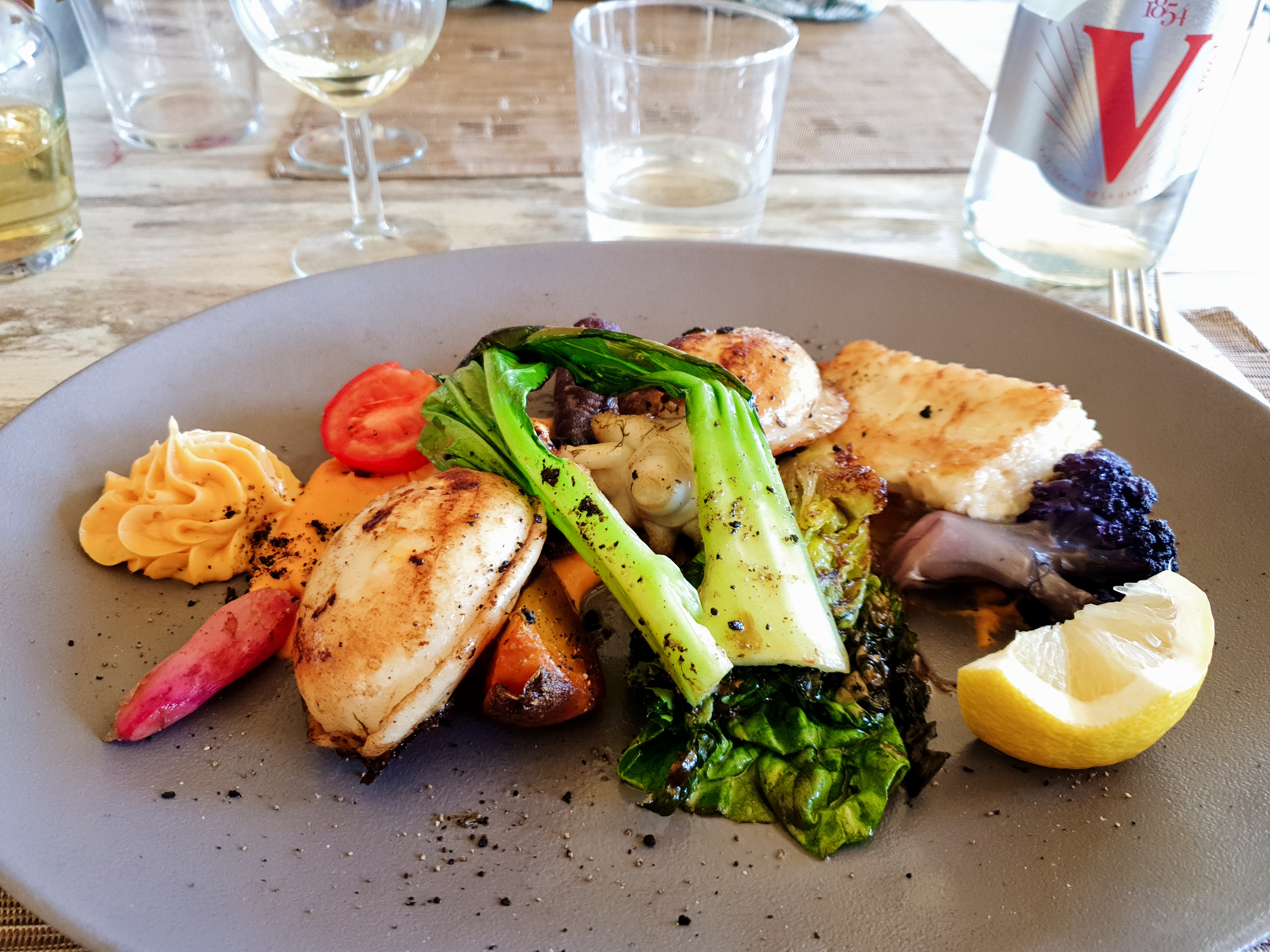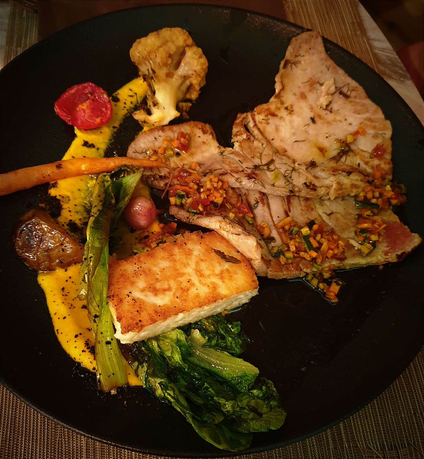 Excelent au tant pour les yeux sur pour le palais 9legumes différent et cuit de plusieurs façons et poisson 'crustacé maitrise un plaisir merci au cuistots😁