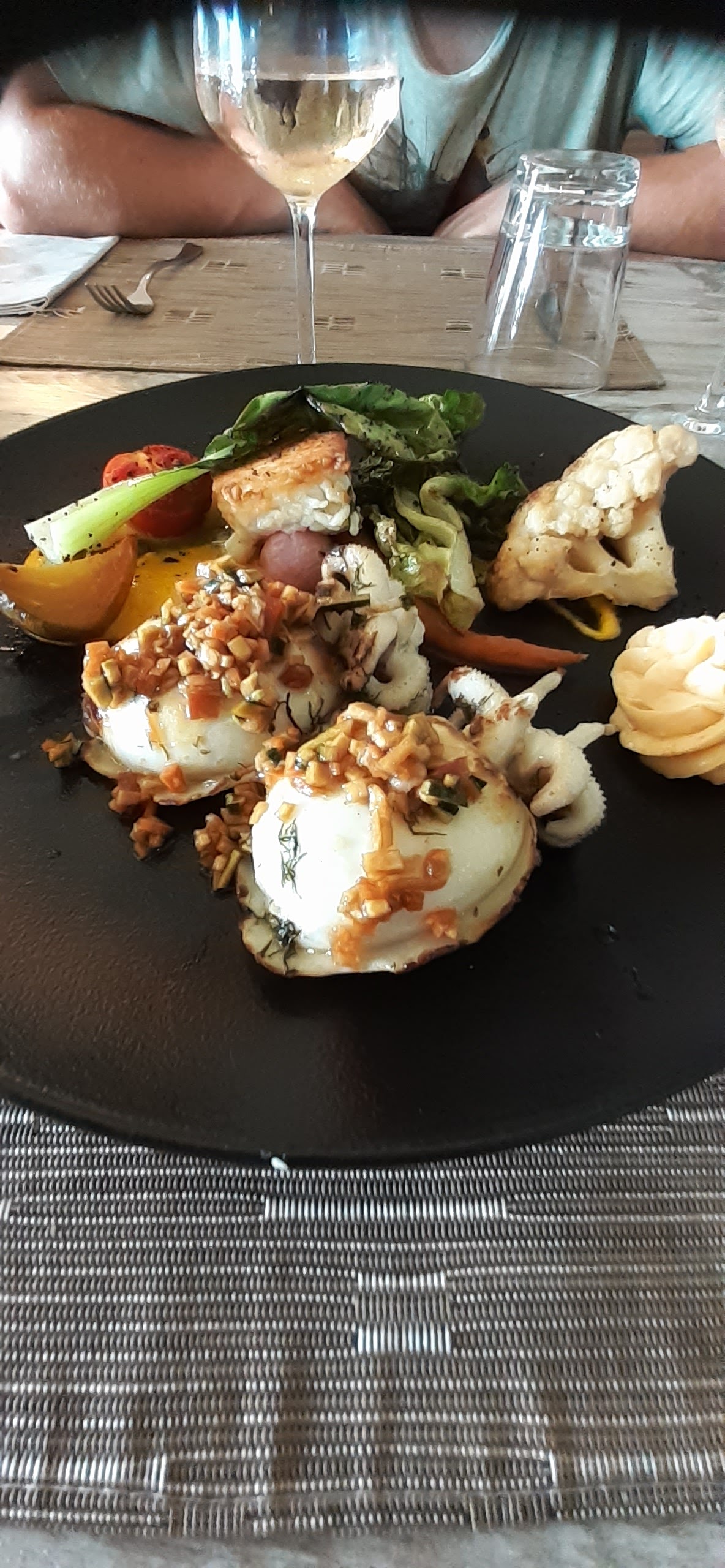 Au vu des commentaires élogieux j’ai réservé dans ce restaurant en famille mais mauvaise surprise : verres sales et cuisine bien au dessous des commentaires. Assiette Setoise : quelques calamars, 3 moules et 3 quenelles incipides Risotto au chorizo 25€ avec chorizo bas de gamme Enfin c’est bien dommage Service sympathique