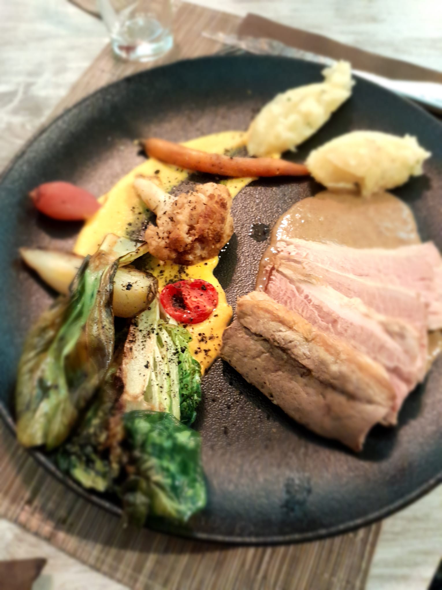 Servixe au top, plat de poisson excellent et tiramisu aux marrons très bon. Le porc était par contre un peu trop cuit, à point alors qu'il était annoncé rosé. Je l'ai indiqué à la serveuse sans être non plus à me plaindre, elle a tout de suite proposé un digestif, j'ai apprécié le geste (et n'en demandai pas tant) Le prix un peu élevé est compensé par la qualité des produits et le dressage qui sont au rendez vous.