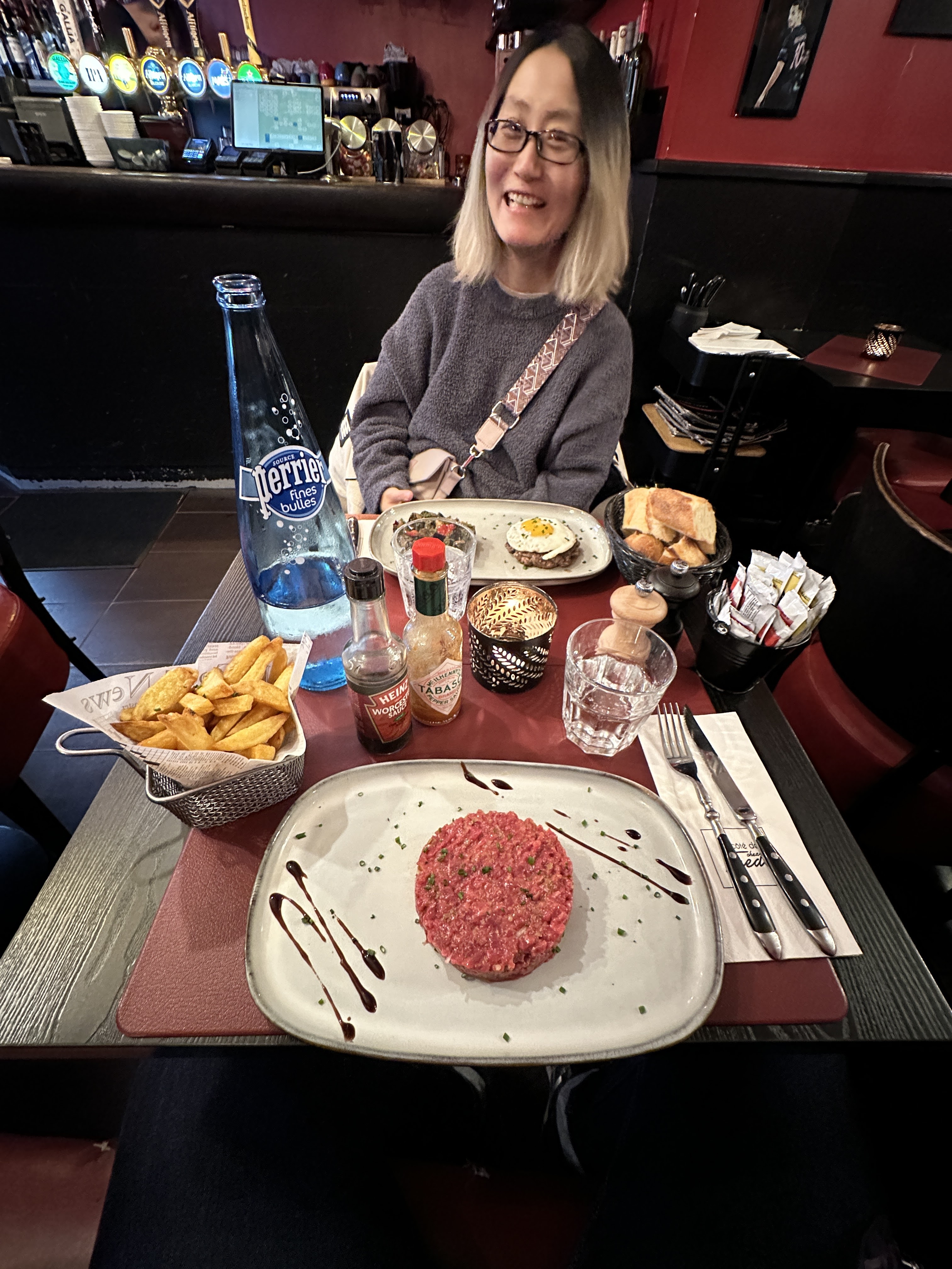Ma femme et moi avons un petit bébé et avions des affaires dans le quartier de ce restaurant. Nous avons donc tenté notre chance pour notre tout premier repas ensemble depuis la naissance du bébé. Le personnel était très accueillant - je dis cela à propos de nombreux endroits que j'évalue, car je n'évalue que ceux que j'aime et que je souhaite recommander, et c'est un critère primordial pour moi - et a fait de la place pour nous et le bébé dans son siège auto. Heureusement, le bébé a dormi pendant tout le repas et maman et moi avons pu à nouveau nous amuser comme des gens normaux pour la première fois depuis des mois. J'ai adoré la nourriture - je mange habituellement du tartare de bœuf lors de ma première fois dans un restaurant français, et le leur était l'un des meilleurs que j'ai jamais mangé. Ma femme était une grande fan de son steak burger et de son choix de légumes - c'était aussi des aubergines, des oignons et des poivrons, très bons. Les serveurs étaient tous très sympathiques et nous ont mis très à l'aise avec le bébé, lui roucoulant et lui souriant. La prochaine fois que nous passerons par là, nous y retournerons exprès maintenant que nous l’avons découvert. Merci surtout à la jeune femme blonde qui nous a aidé à commander en anglais, puisque mon français est nul et que ma femme commence tout juste à l'apprendre.