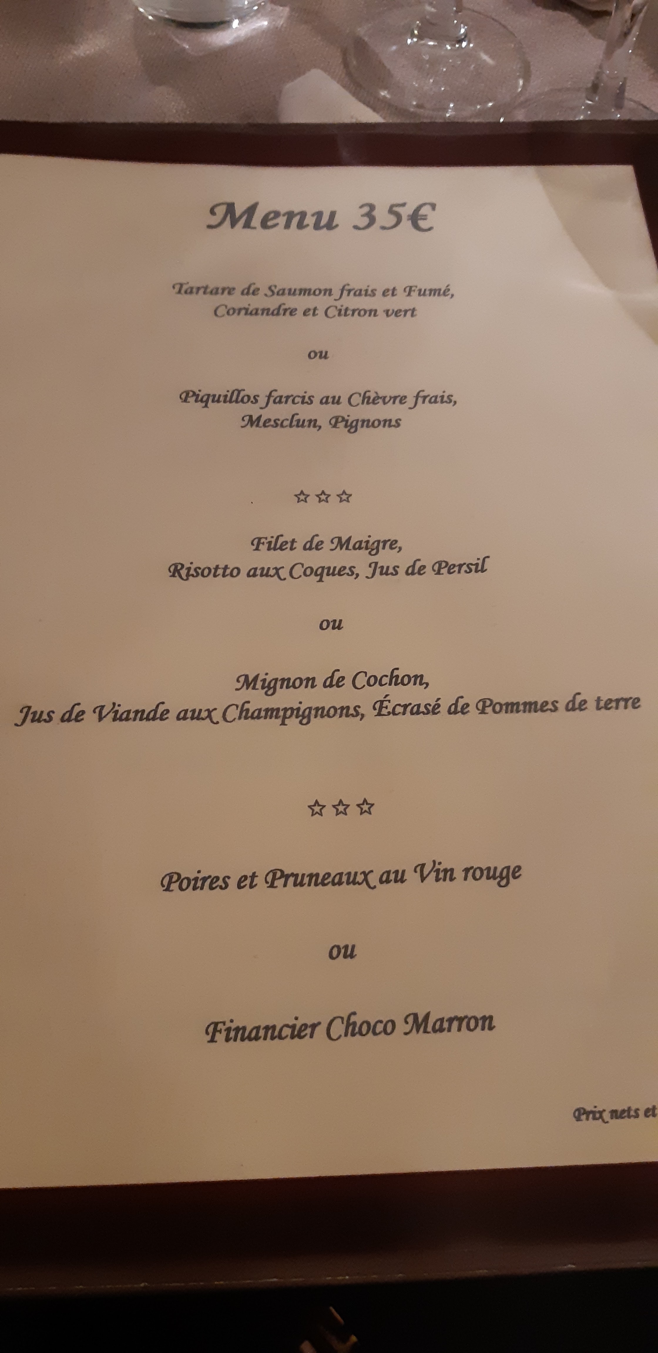C'était parfait! Les 3 plats excellents , un service impeccable, dommage ne prend pas les chèques vacances 😕