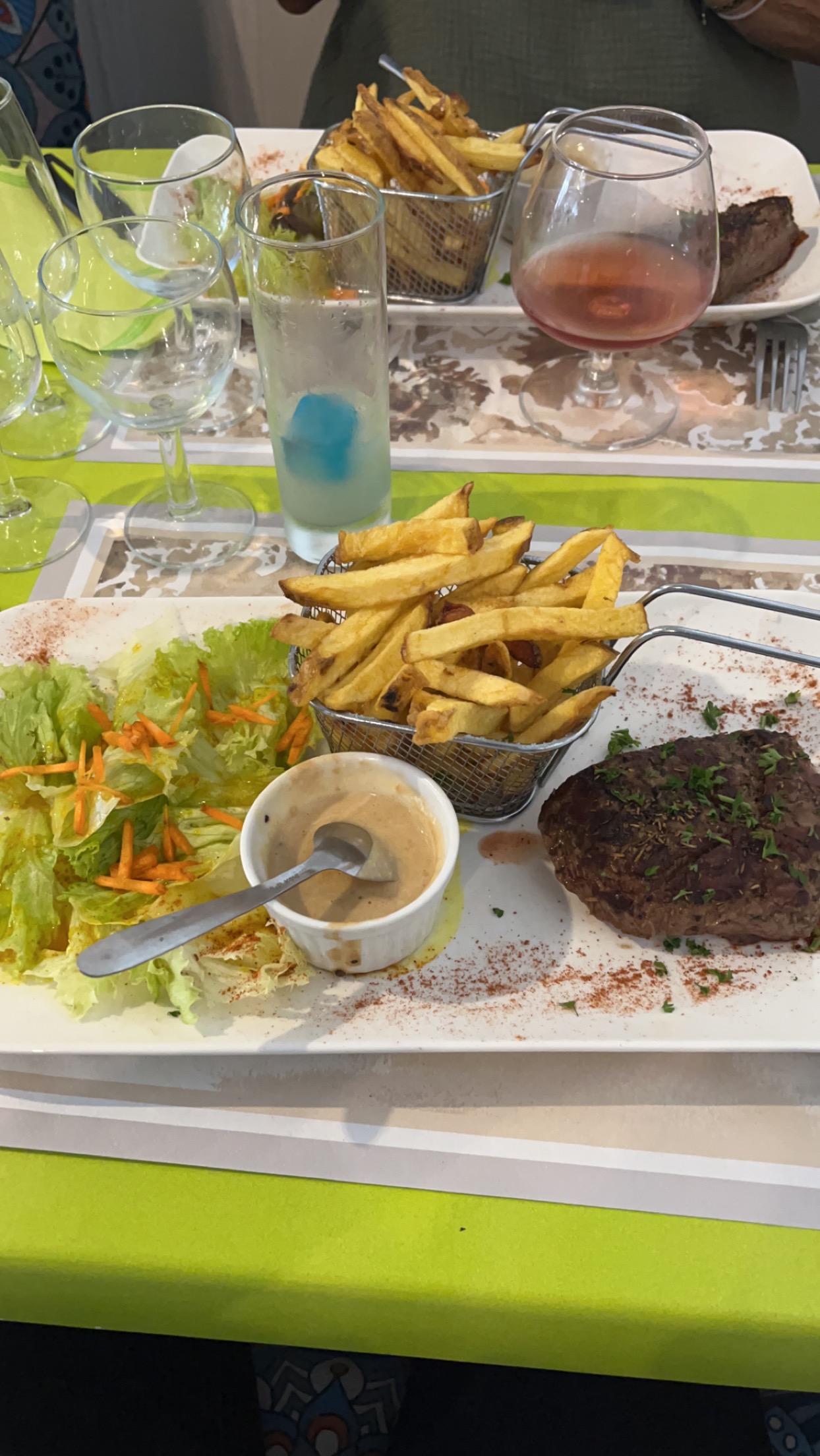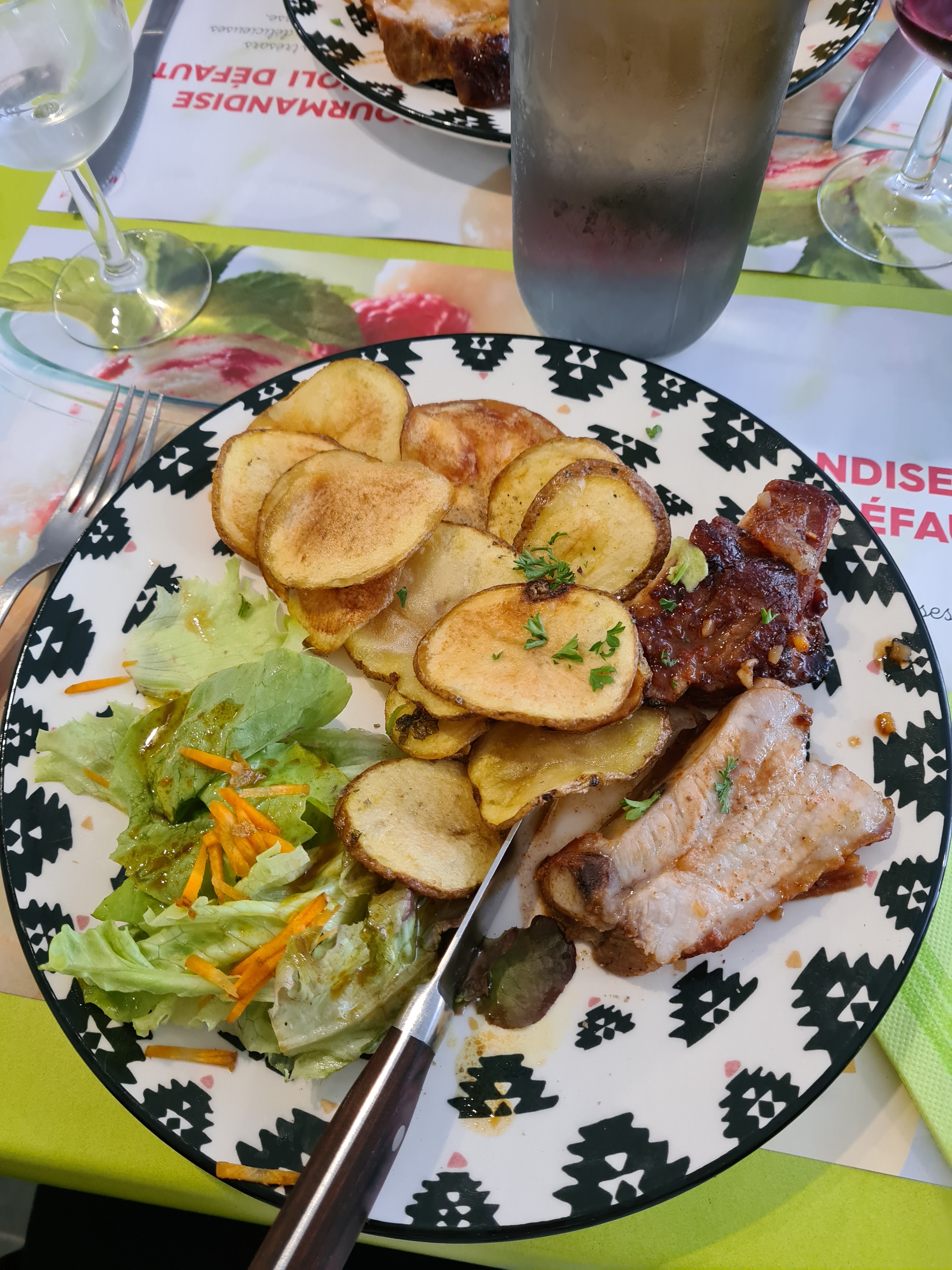 Bon accueil décoration simple mais très frais Bien mangé Ribs et chips fait maison Flan aux pommes caramélisées je pense pas fait maison mais bon