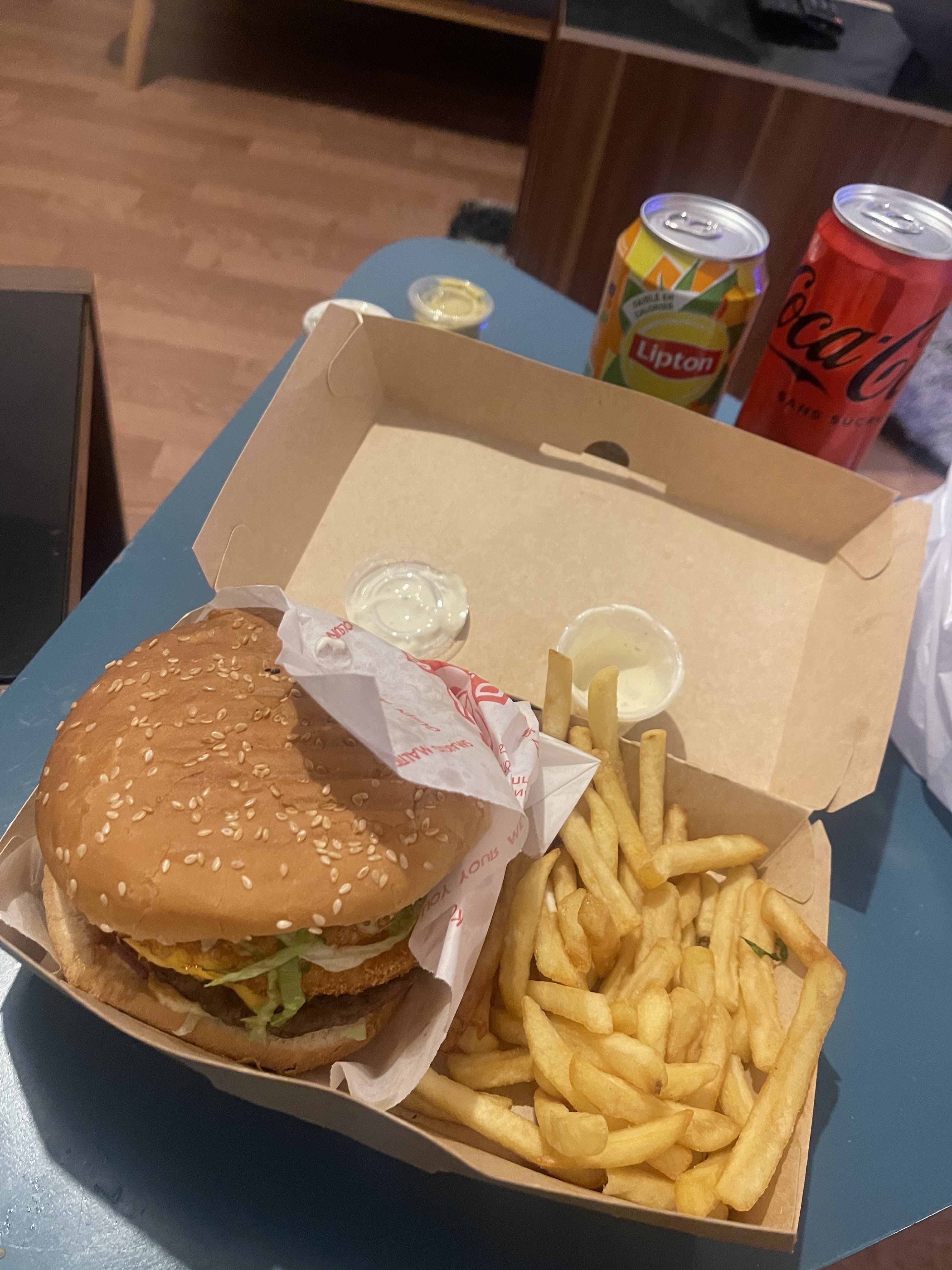 Commande passé sur internet, une belle découverte pour ce fast-food, les portions sont vraiment généreuses, le burger très bien assemblé, la viande était bonne. Le prix était très raisonnable vue la quantité, j’étais même surprise. Je recommande ce fast-food pour les burgers.