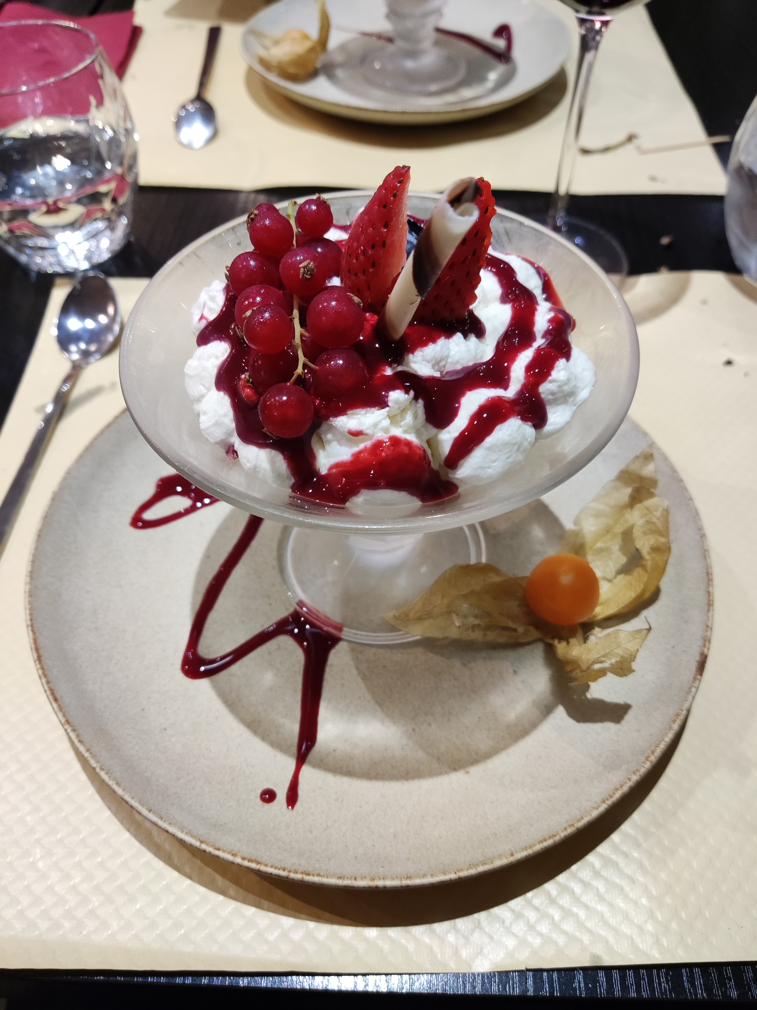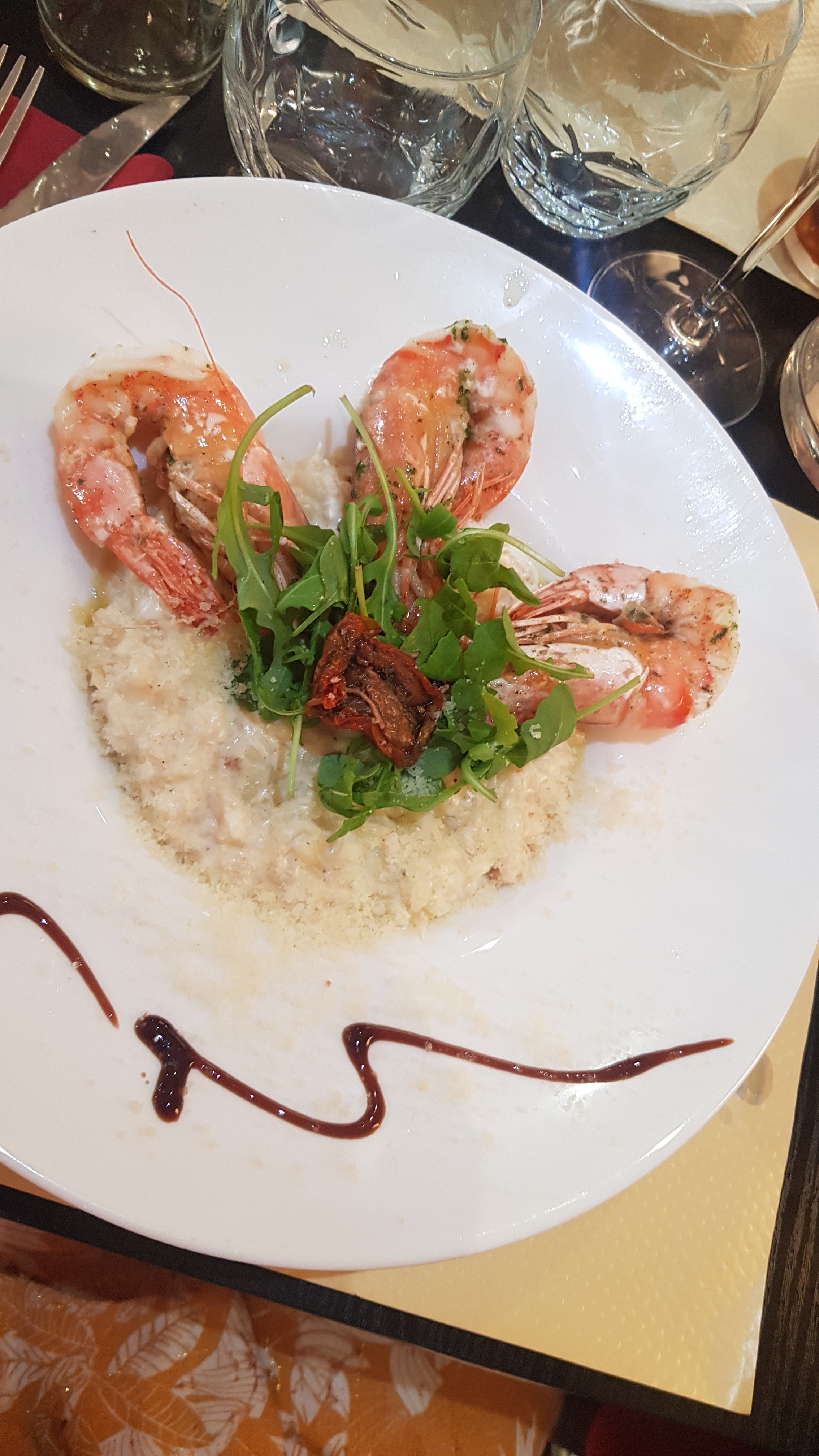 Restaurant avec ambiance chaleureuse presque cocoon.Lambrosco bien frais.gambas a tomber.