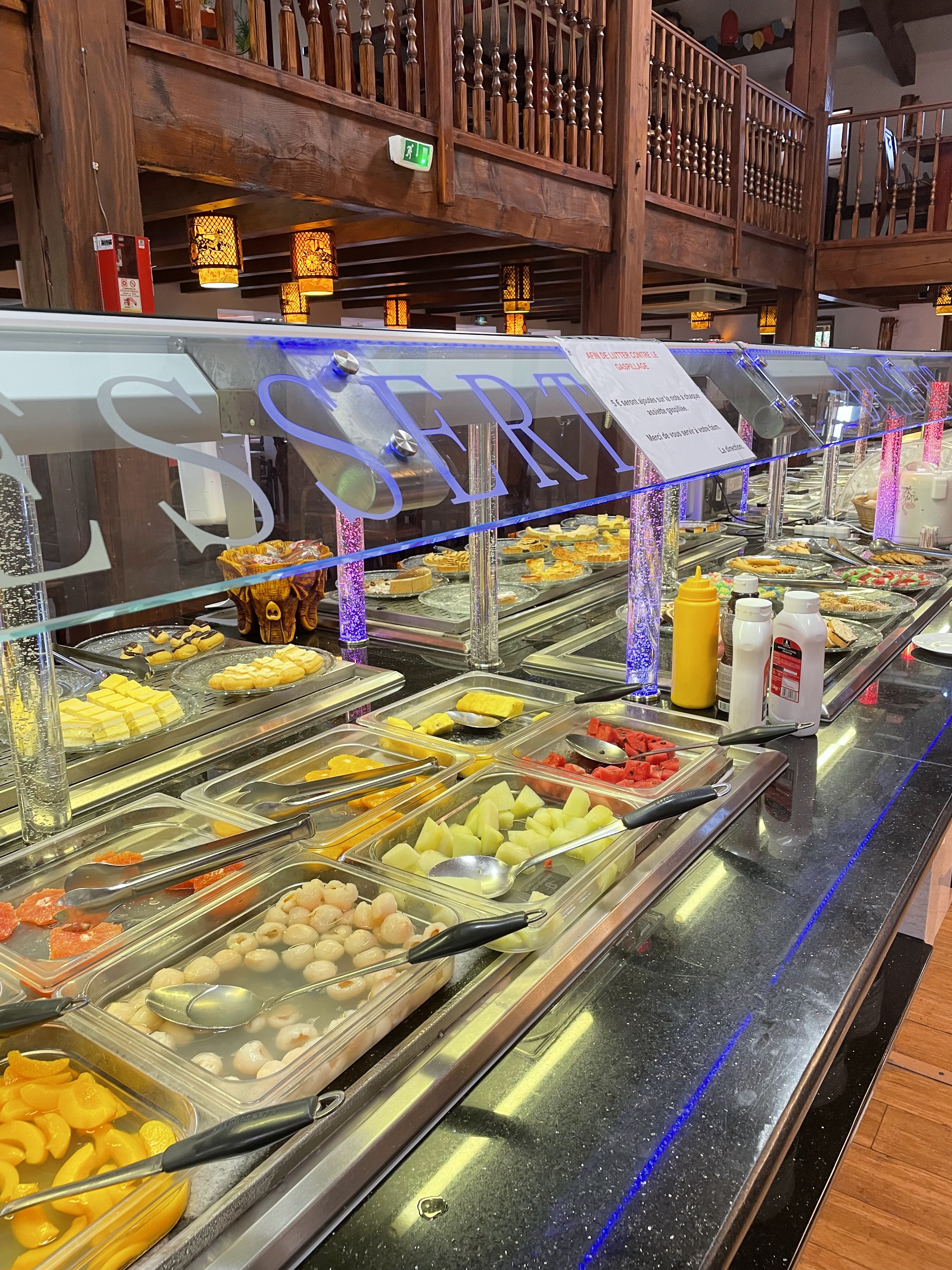 Pour le prix quand on a faim et envie de manger de tout c'est parfait, poisson blanc et crevettes fraîches, viande rouge de qualité, pour le prix vraiment ou pouvons manger cela? En plus il y a des plats français, du fromage des fruits des desserts et une boisson sans alcool offerte... Et pour les petits un chouette parc pour jouer pendant que les grands terminent !