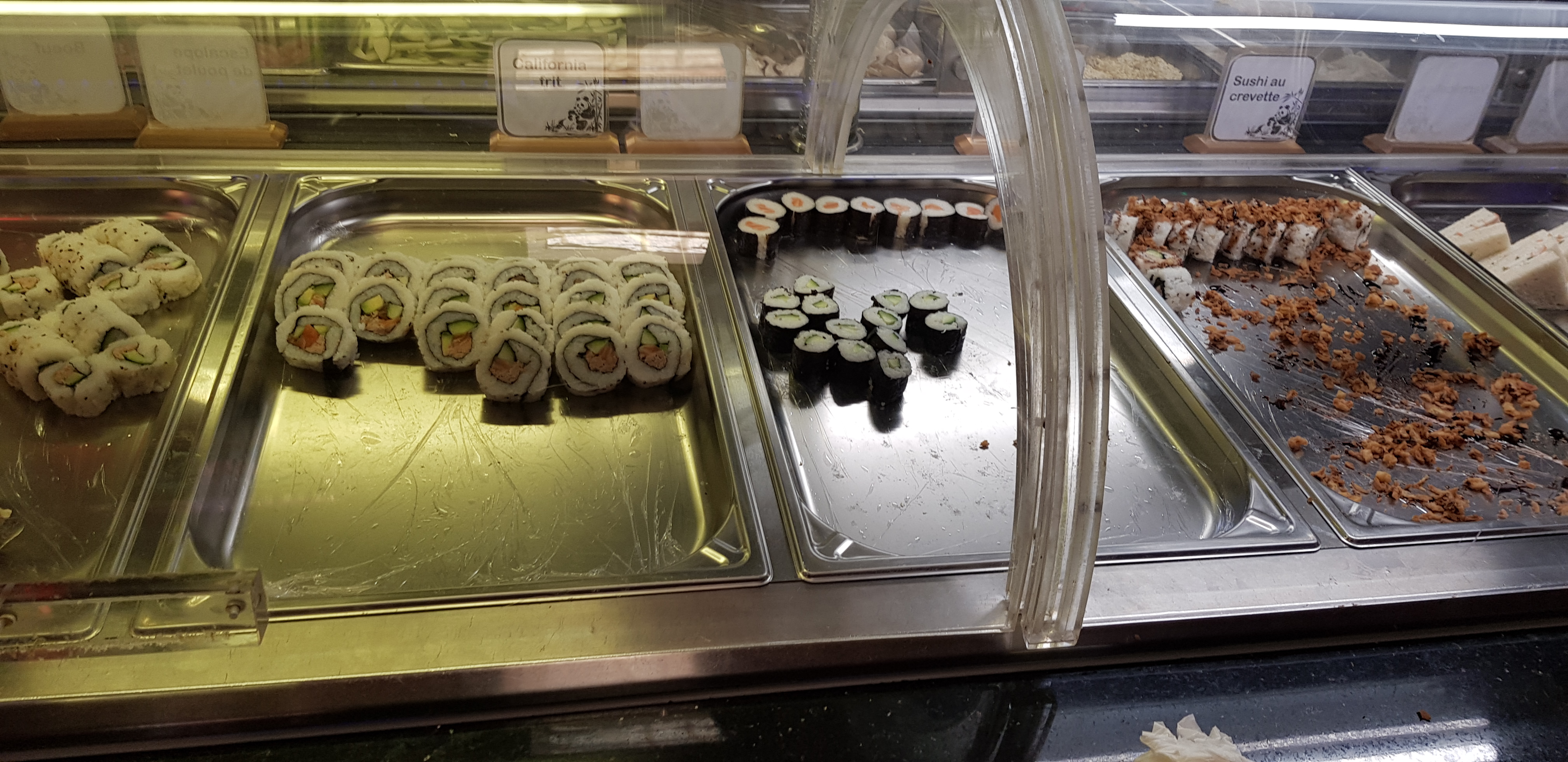 Pas de suhis dans les plateaux, j'ai été demander a la caisse, elle m'a répondu ça arrive bref jamais arrivé. Les ailerons de poulet sont tres gras. Le bœuf aux oignons il y a plus oignons que de bœuf. Et le final le seau on l'on rince la cuillère a glace est vraiment Dégueulasse. Nous n'y reviendrons jamais. Les serveuses sont sympa, cest tout ce qu'il y a de bien