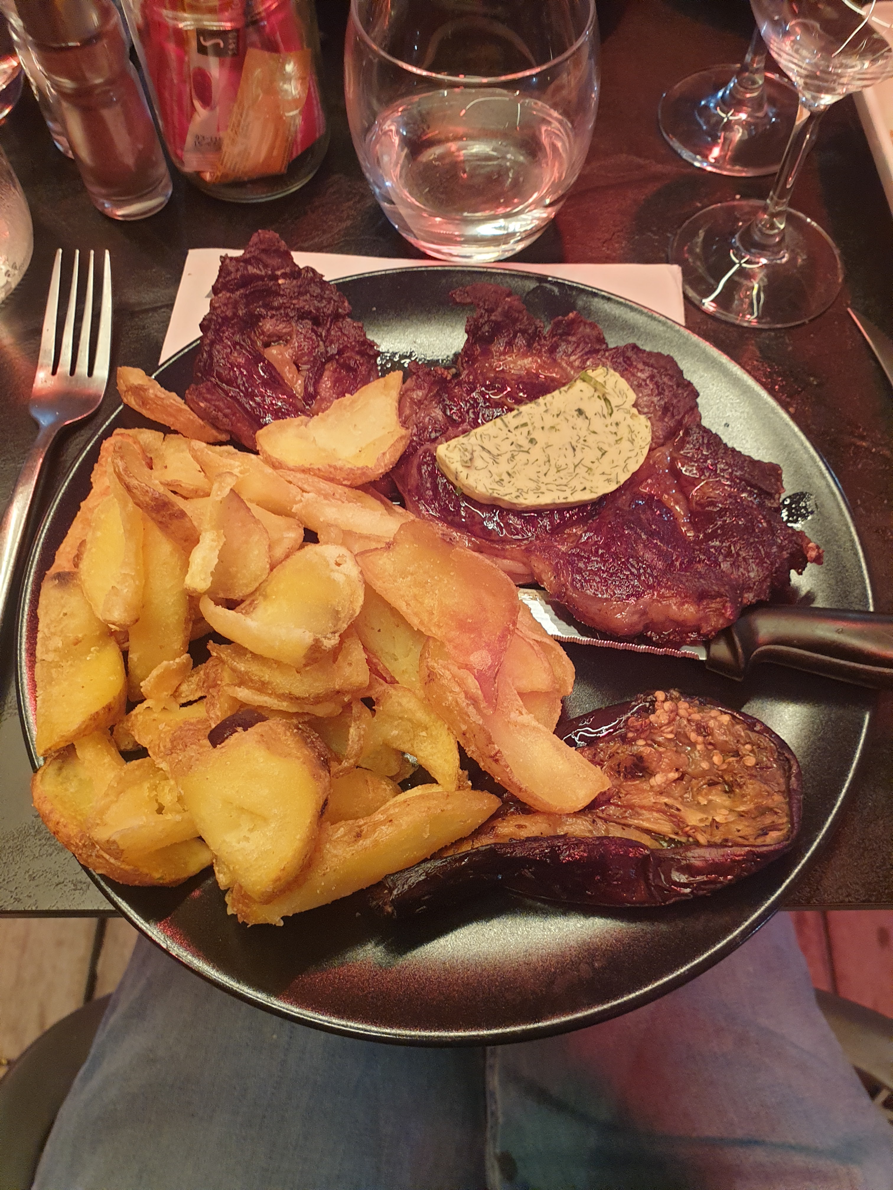 Restaurant sympa, serveuse sympathique et agréable Viande (côte de bœuf 🥩) succulente Seul point moyen, note 📝 légèrement salé pour moi….