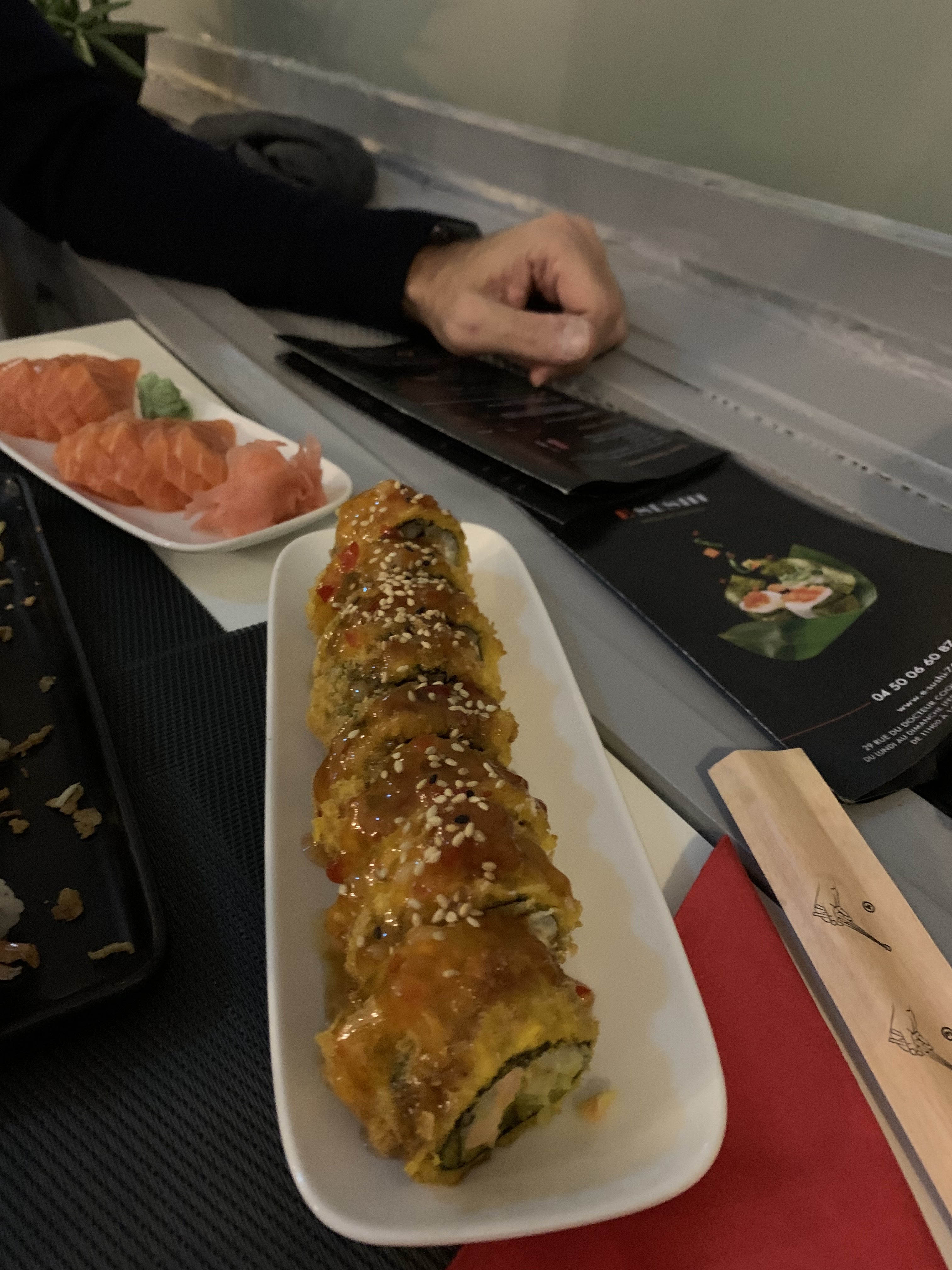 Très bon restaurant de sushis. J'y ai dîner.seul un soir il y a 4jours de cela et j'ai étais ravis . Sushis au top tartare de saumon très bon.meme si je le prépare différemment... chacun notre préparation. Je l'ai bien aimé même si je pense qu'il faudrait moin de sauce dedans . Je ne critique pas juste je suis professionnel de la restauration depuis 16ans et vous donne.mon avis. Niveau accueil rien a dire . Personnel accueillant et avec une gentillesse face au client . C'était deux femme se soir là une qui m'a accueilli cheveux couvert très poli et l'autre pour le service adorable aussi . Le plus c'est que le restaurant est halal donc tout le.monde peux y manger . Chose très rare dans les.sushis donc je ne peux qu'apprécier. Car toujours manger des sushis au poisson tout le temps c'est embêtant... merci a vous et bonne continuation et plein.de.reussite pour la suite .